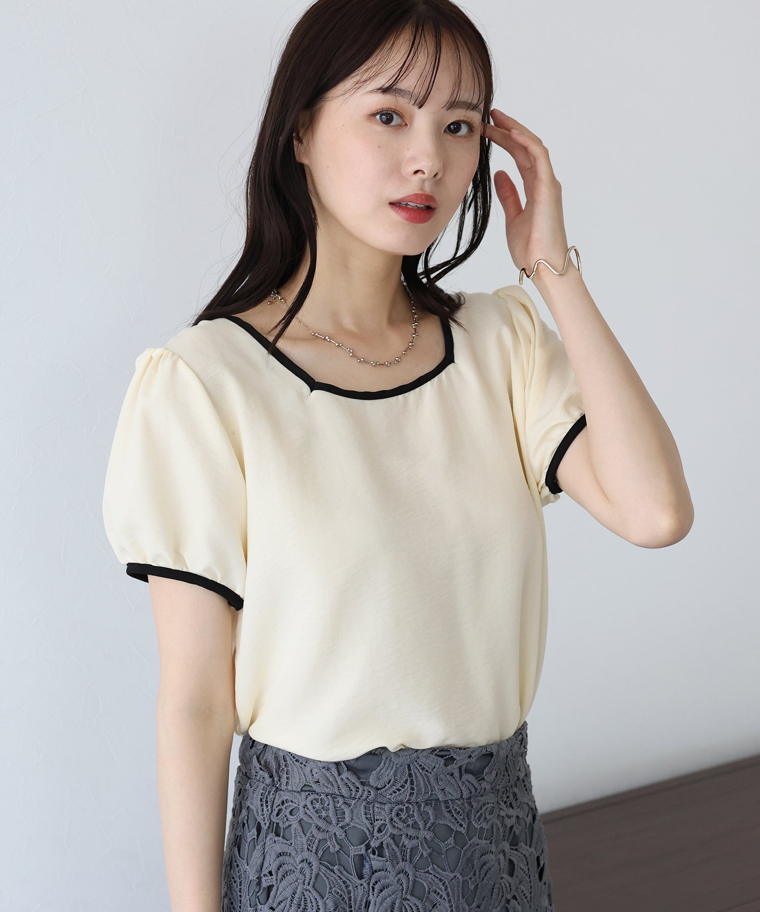 キュートなディテールが詰まったキュートなブラウス ?POINT パイピングの配色が印象的なブラウス。袖口やネックラインに施したパイピング加工の配色が目を引くデザイン。 スクエアネックで首元のラインを華奢に見せ、バックラインの首元にあしらったリボンと 程よくふんわりとしたパフスリーブデザインで、女性らしさをプラス。 細部までこだわったフェミニンなアイテムです。