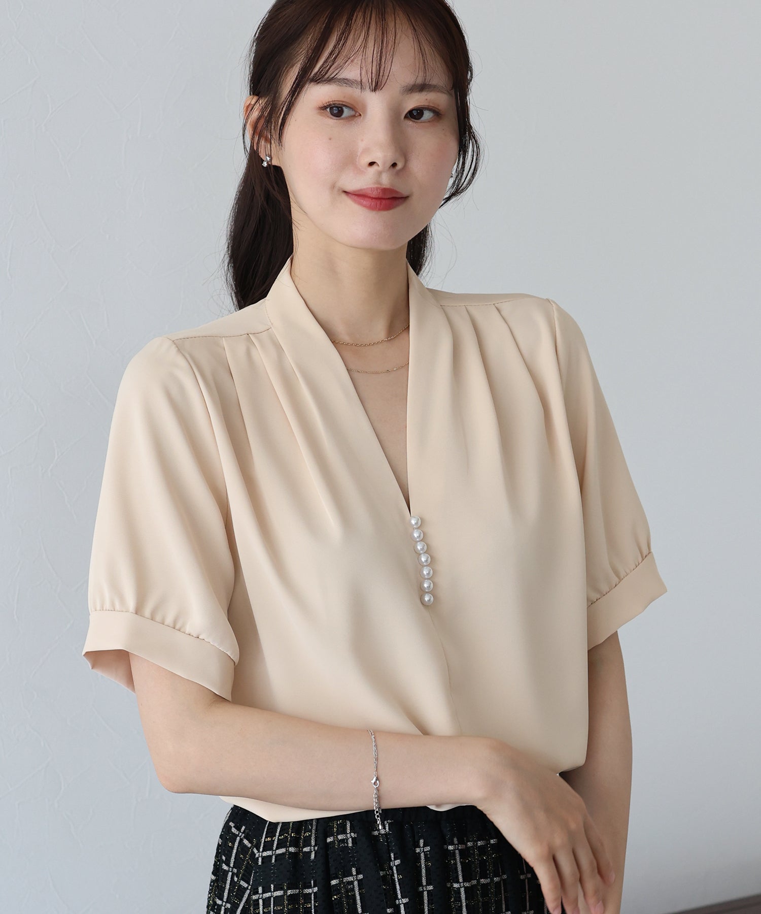 - 【SALE】パールラインVネックブラウス【ネコポス】