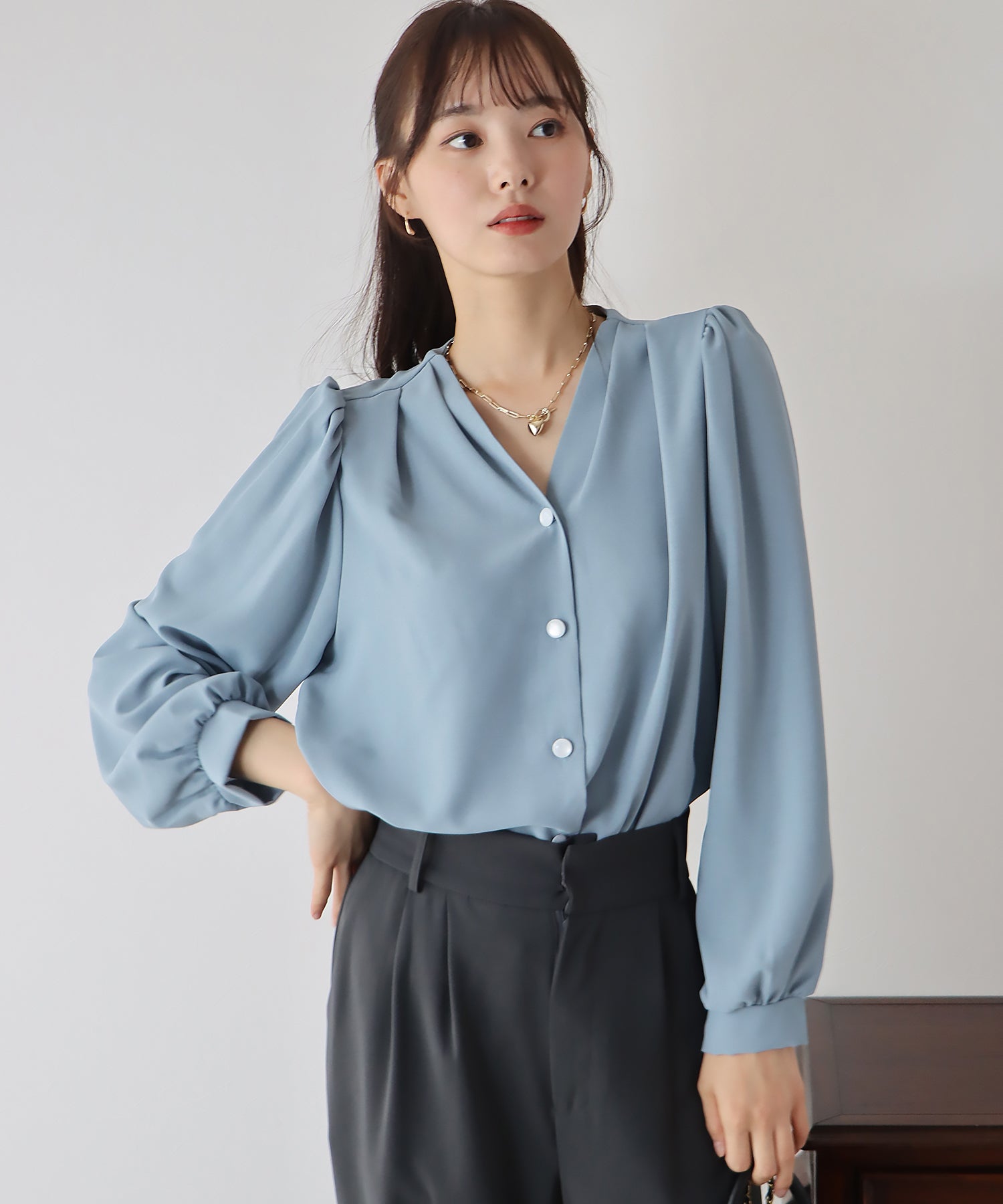 - スタンドカラーボリュームスリーブシャツ