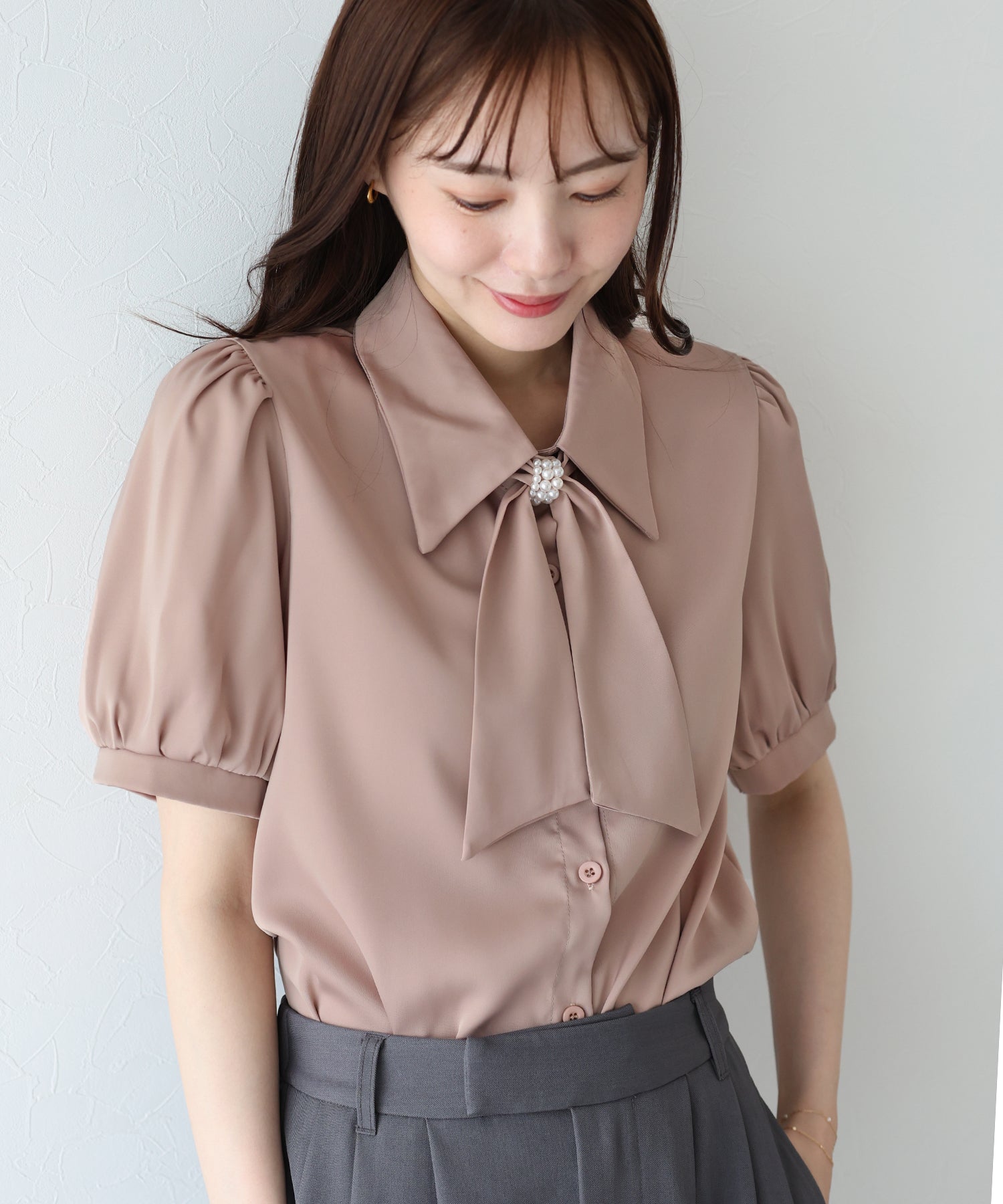 ?POINT 首元のタイデザインが目を惹くフェミニンなブラウス。 パールのリボンループと光沢感のあるリボンタイで女性らしさを演出し、 フロントラインの比翼仕立てでシンプル過ぎないポイントをプラス。 取り外し可能なリボンタイが付いているので、襟元のループに通すだけで簡単にリボンタイが完成します。 お出かけ~オフィスカジュアルにもおすすめのきちんと見えするアイテムです。