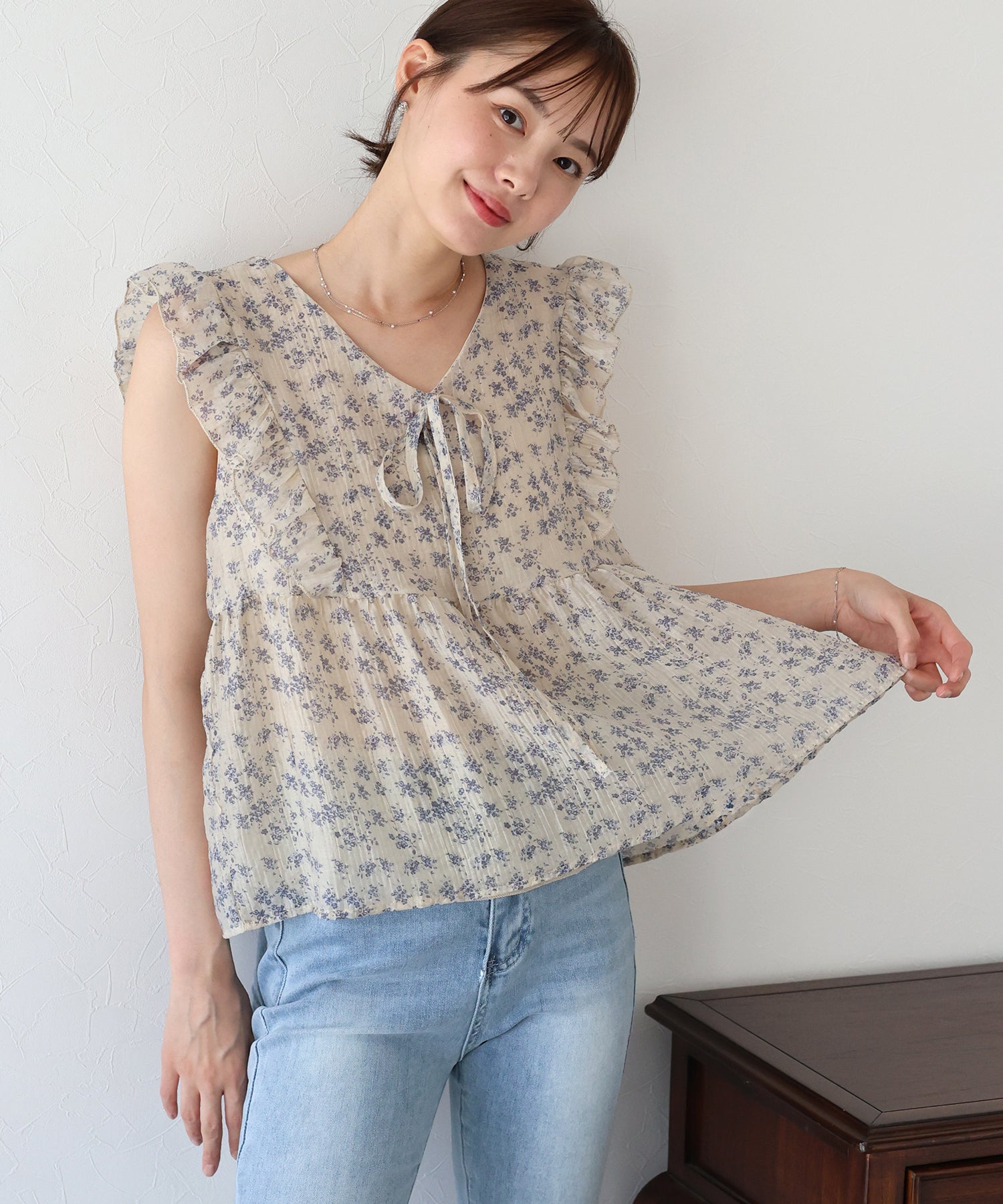 小花柄×フリルが大人かわいいノースリーブブラウス ?POINT フェミニンなイメージをつめこんだノースリーブブラウス。 おとなガーリーな小花柄に胸元のリボンと肩まわりのフリルでかわいらしいさをプラスしました。 ノースリーブながら、フリルが肩まわりをカバーしてくれるデザインで、 一枚で着やすいのもうれしいポイント◎ ふんわりひろがるシルエットが女性らしく、ヒップ周りもさりげなくカバーしてくれます。 一枚で着映えが叶う、夏のお出かけにピッタリなアイテムです。