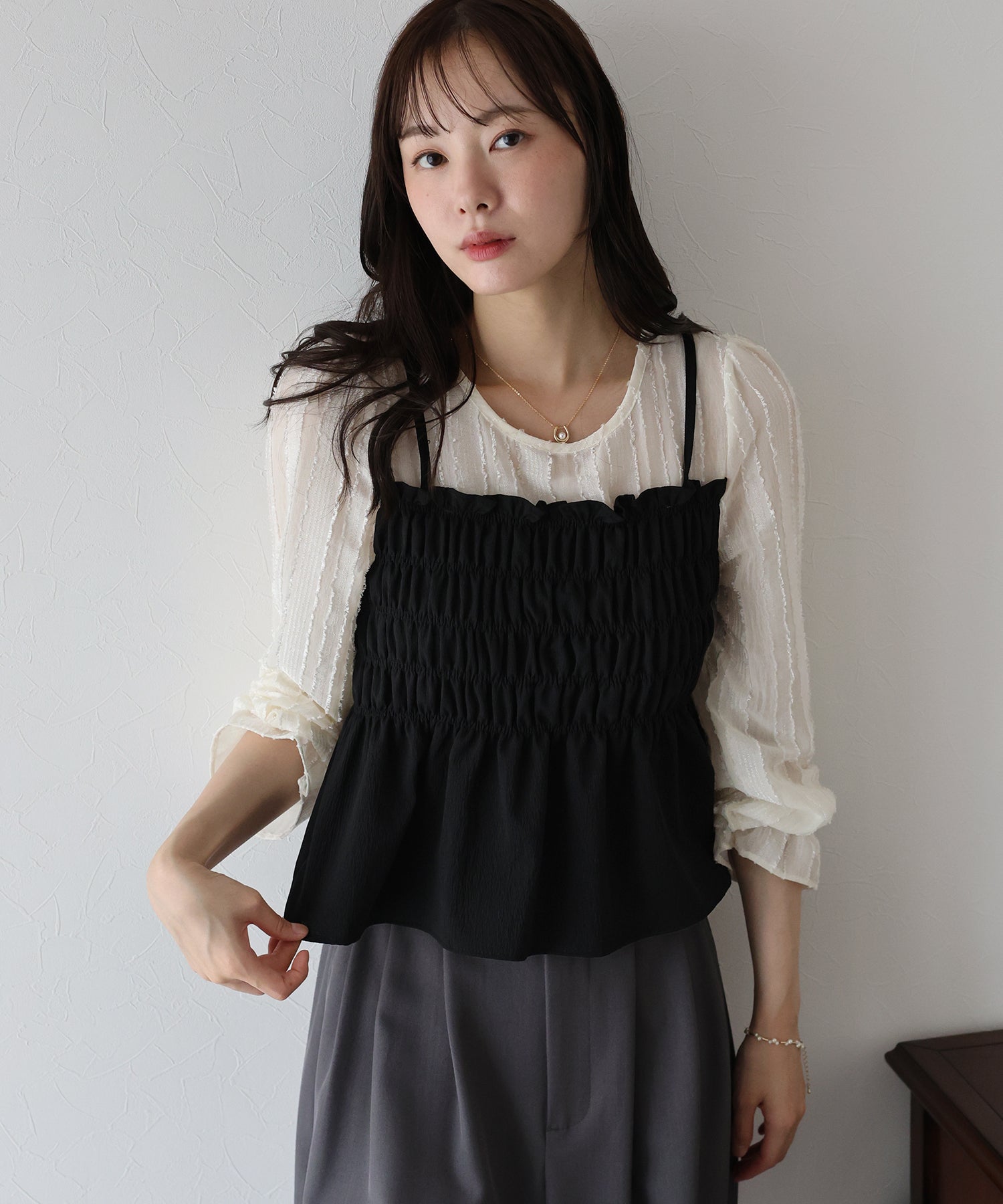 | 生地 | 【ブラウス部分】サラッとした透け感のあるブラウス素材 【ビスチェ部分】表面に凹凸感のあるさらっとしたポリエステル素材