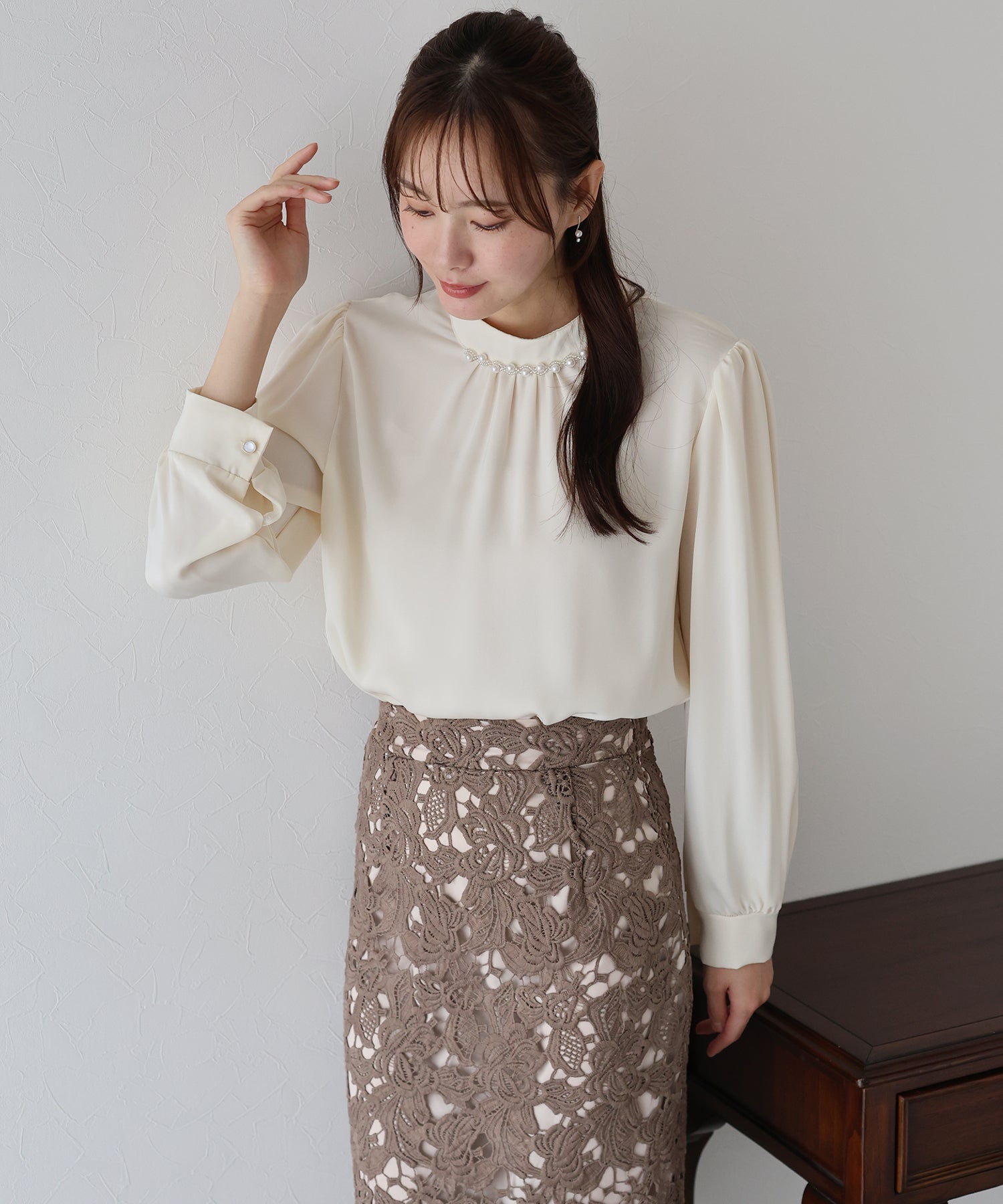 - パール&ビジュー付きスタンドカラーブラウス【ネコポス】