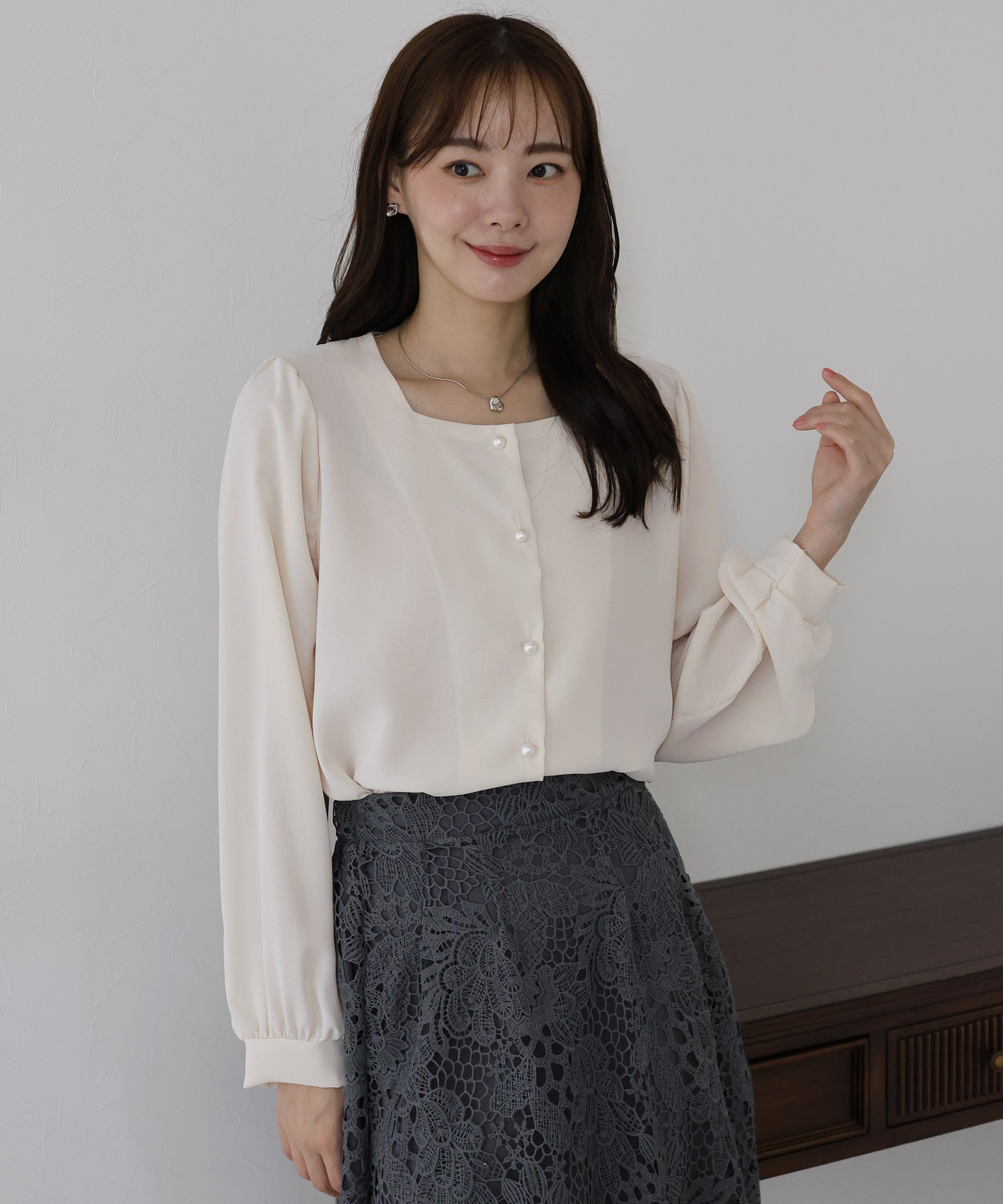 顔周りがすっきりと見えるスクエアネックのきれいめブラウス。
