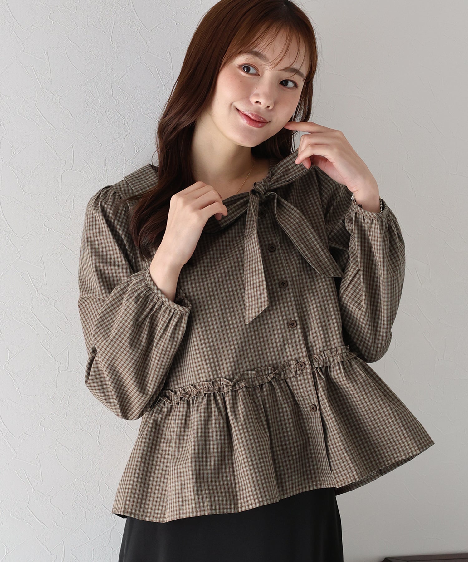 - 【TIME SALE】チェックリボンペプラムブラウス【ネコポス】