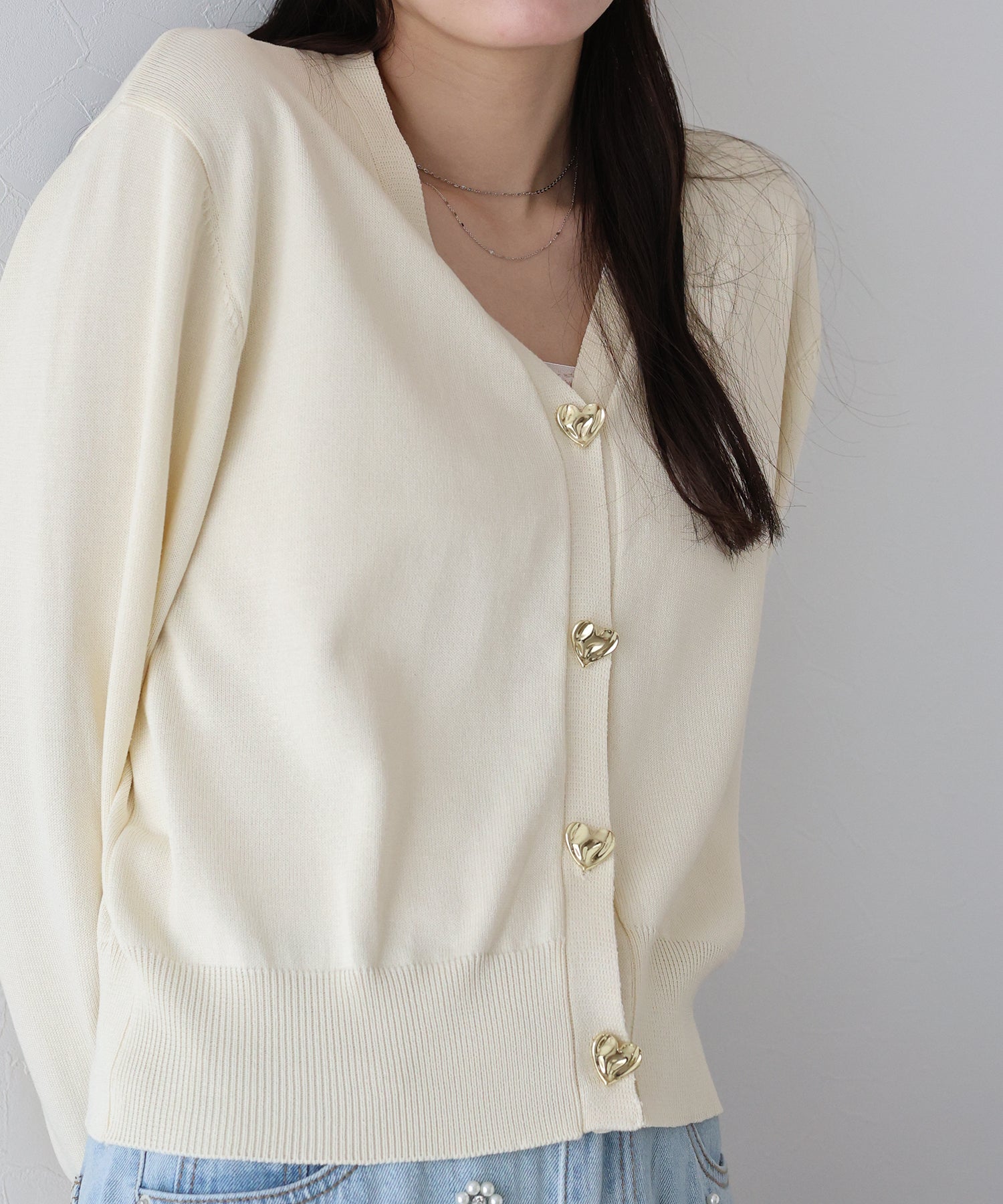 ハートのゴールドボタンがアクセントになった、オンオフ活躍する大人のニットカーディガン