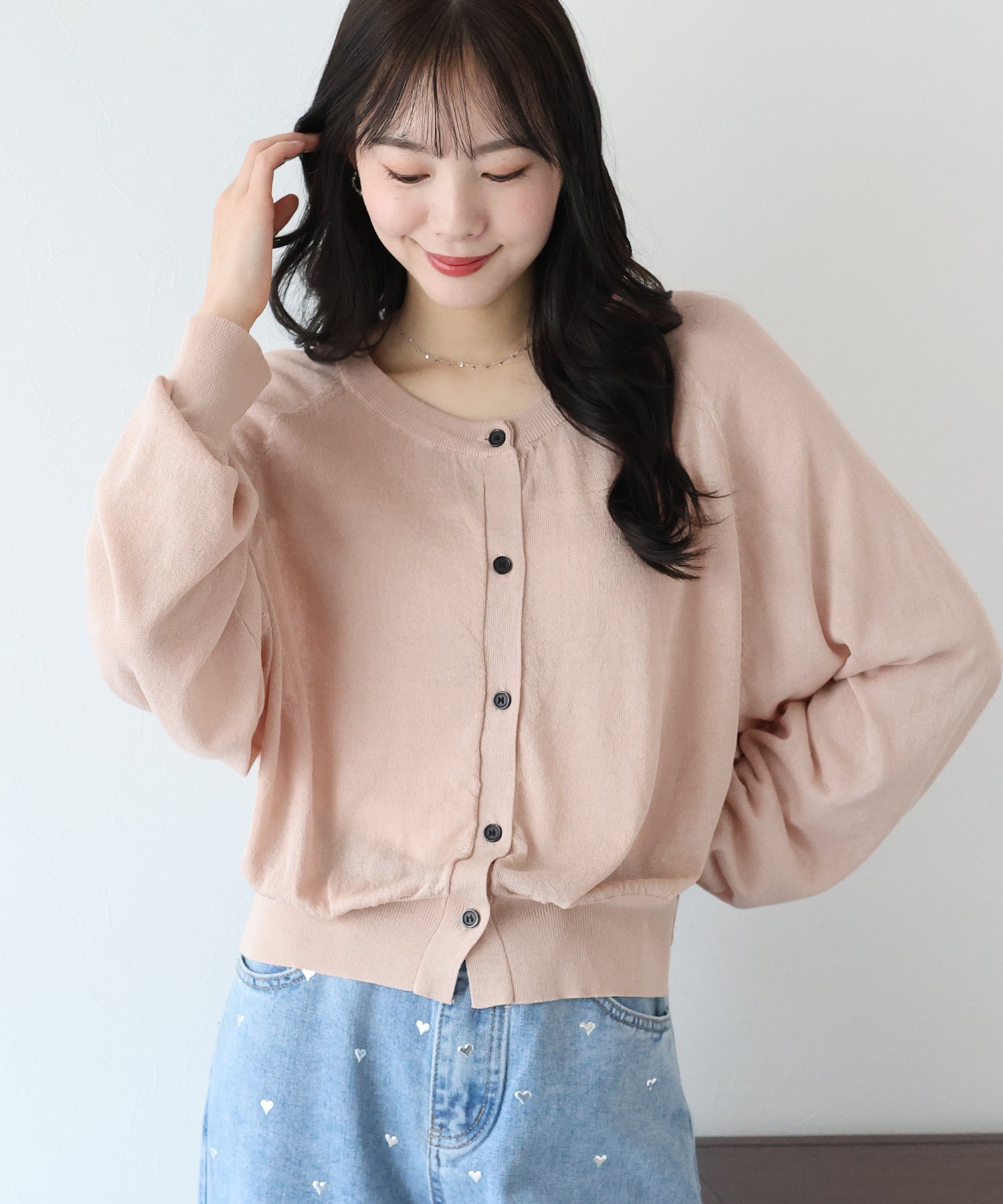 - 【SALE】ぷっくりハートボタンポリニットカーディガン