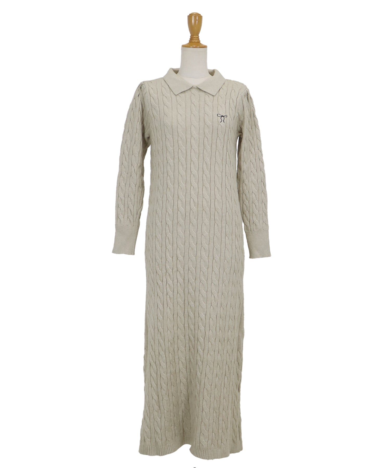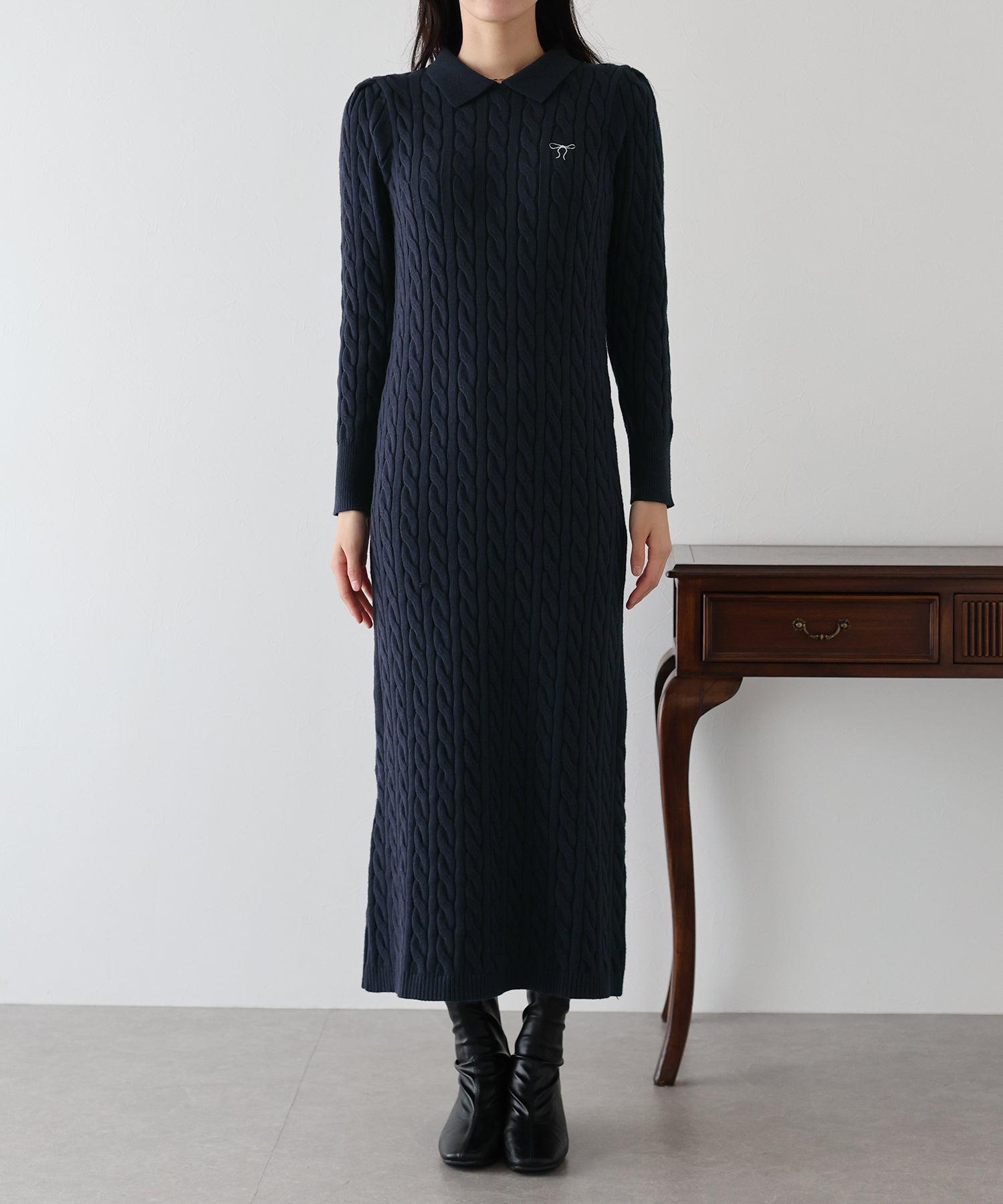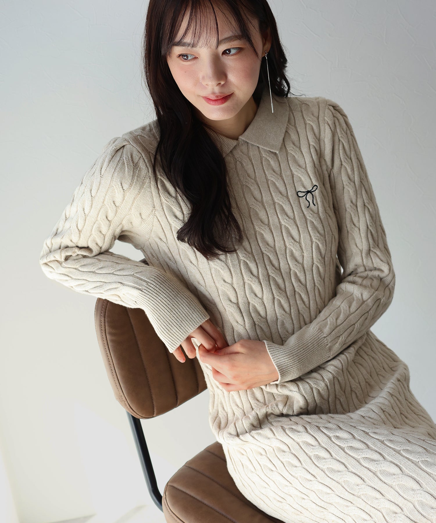 着るだけで簡単に着映えする上品愛されワンピース ?POINT デイリーに着まわしやすいケーブル編みのフェミニンなニットワンピース。 ベーシックなシルエットでありながらも、ケーブル編みとカラーネックデザインできちんと感をプラス。 胸元のリボン刺繍やIラインのシルエットで女性らしさを演出。 長めの着丈なのでキレイめな印象になりすぎず、幅広いシーンで活躍してくれます。