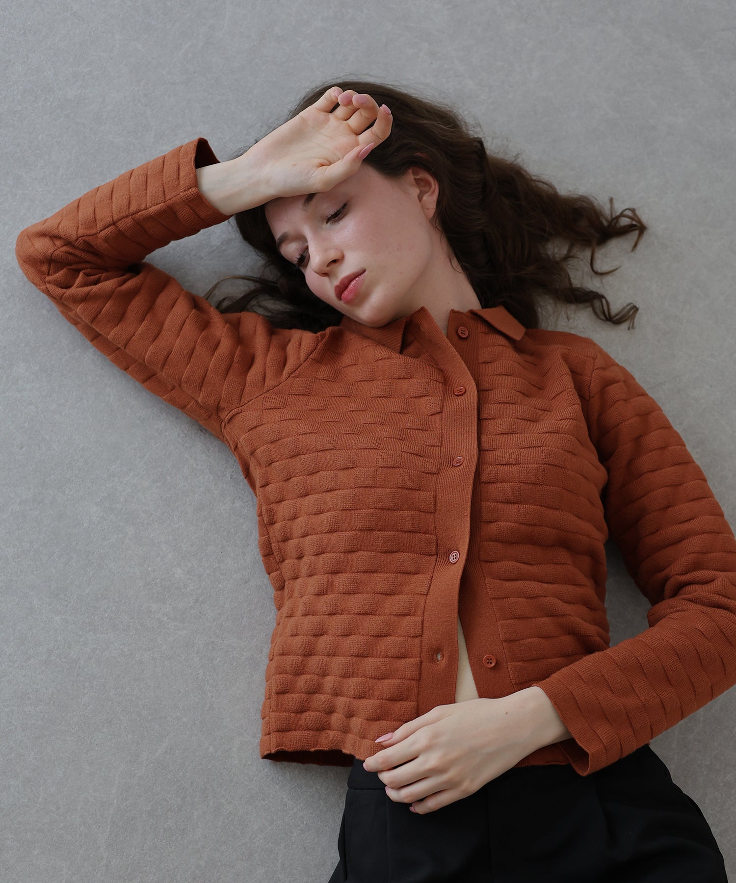 カーディガンとしてもトップスとしても使える襟付きポロニット ?POINT 表面感のあるデザインが魅力的な襟付きニットカーディガン。 ブロックのような編み柄が凹凸感のある表情を生み出し、シックな雰囲気をプラス。 程よくゆったりとしたシルエットでラクに着られます。 ボタン開きのデザインなので、ボタンを閉めてトップスとしても ボタンを開けてカーディガンとしてもご使用いただけるので、幅広いコーディネートで着回しができます。 着丈も長すぎず短すぎない程よい長さなのでデイリーに着用でき、これを一枚着るだけでオシャレながらもきちんと感を演出してくれます。