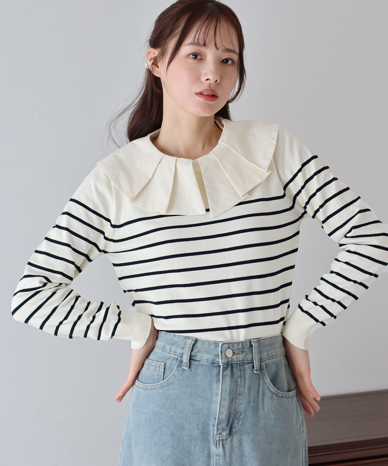 ?POINT フリル襟でかわいく、襟を取り外してシンプルに、二つの要素を楽しめるサマーニット。 衿はボタンで取り外し可能なので一枚で様々な着回しができます。 なめらかなニット素材で、伸びがよく着心地の良さも魅力。デイリーに大活躍するアイテムです。