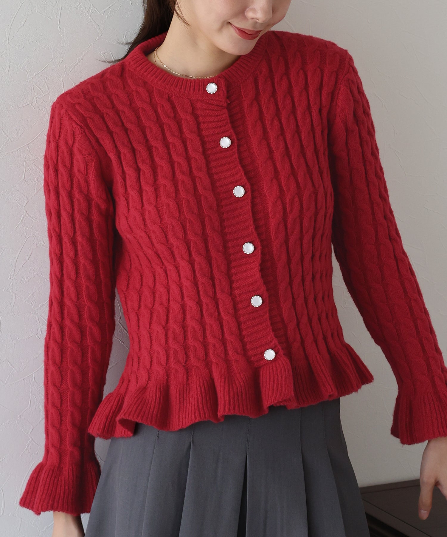 パールボタンが映えるケーブルニットカーディガン