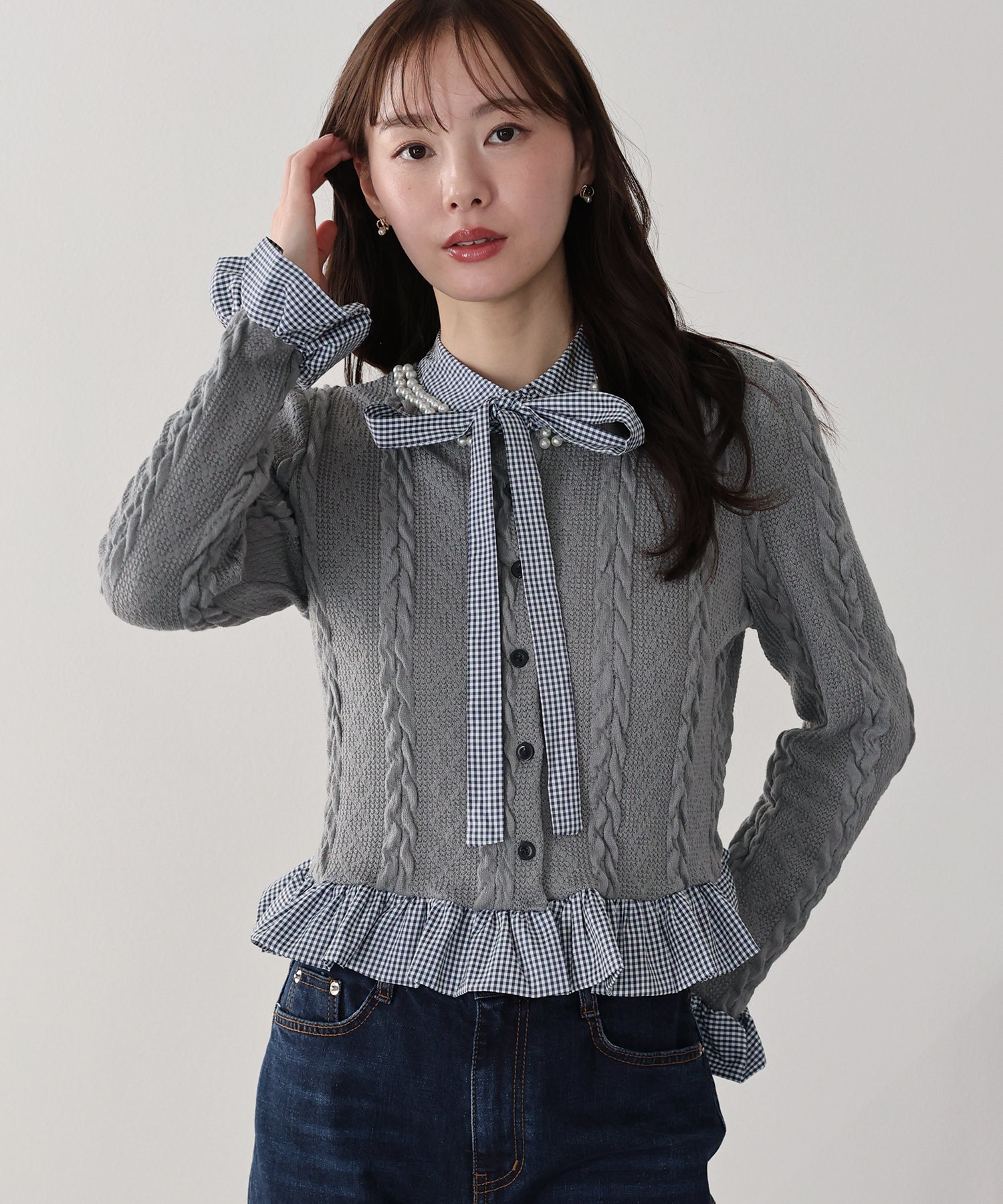 【TIME SALE】ボウタイシャツドッキングカーディガン