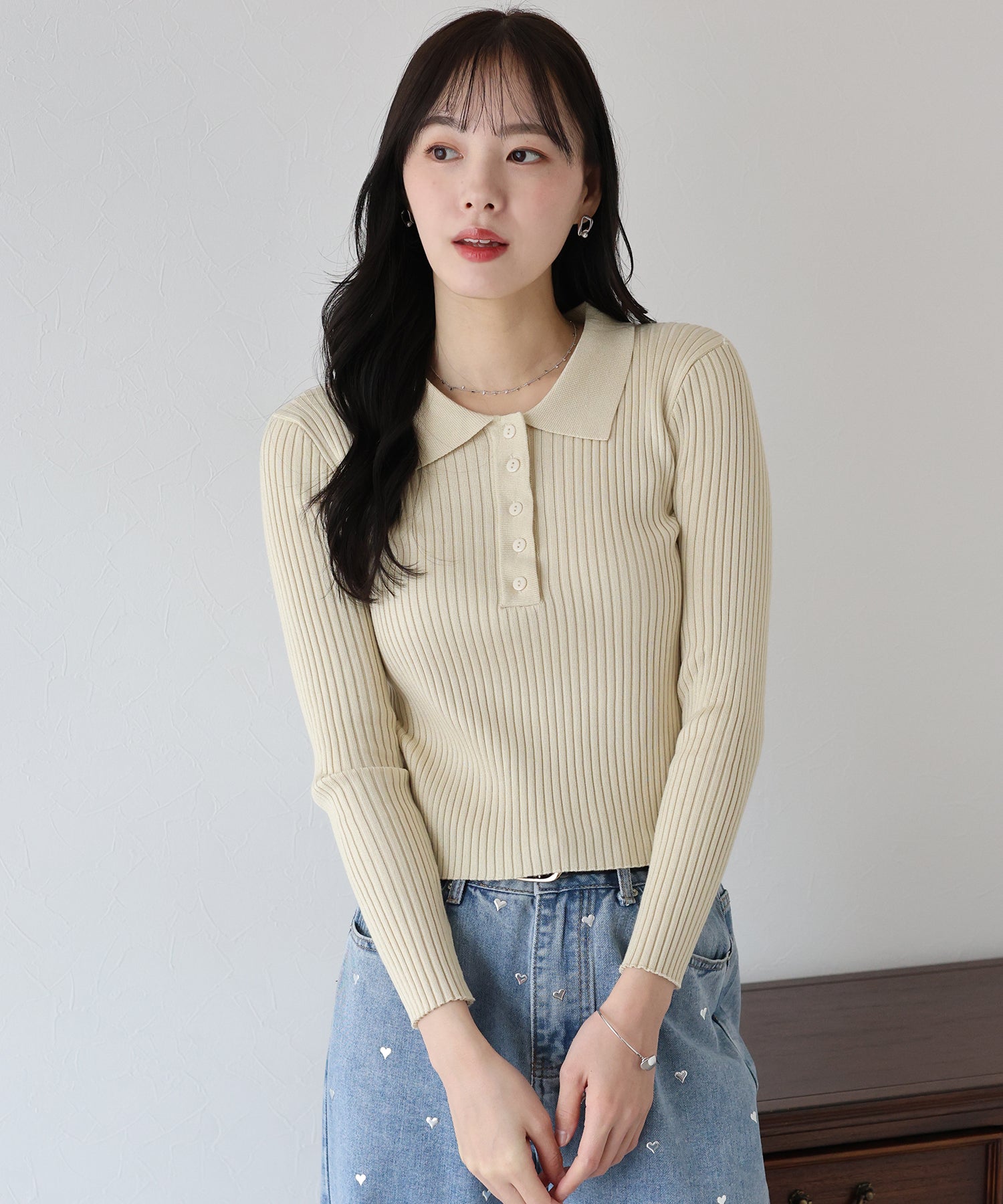 フィット感がミニマルな印象のポロ衿リブニット