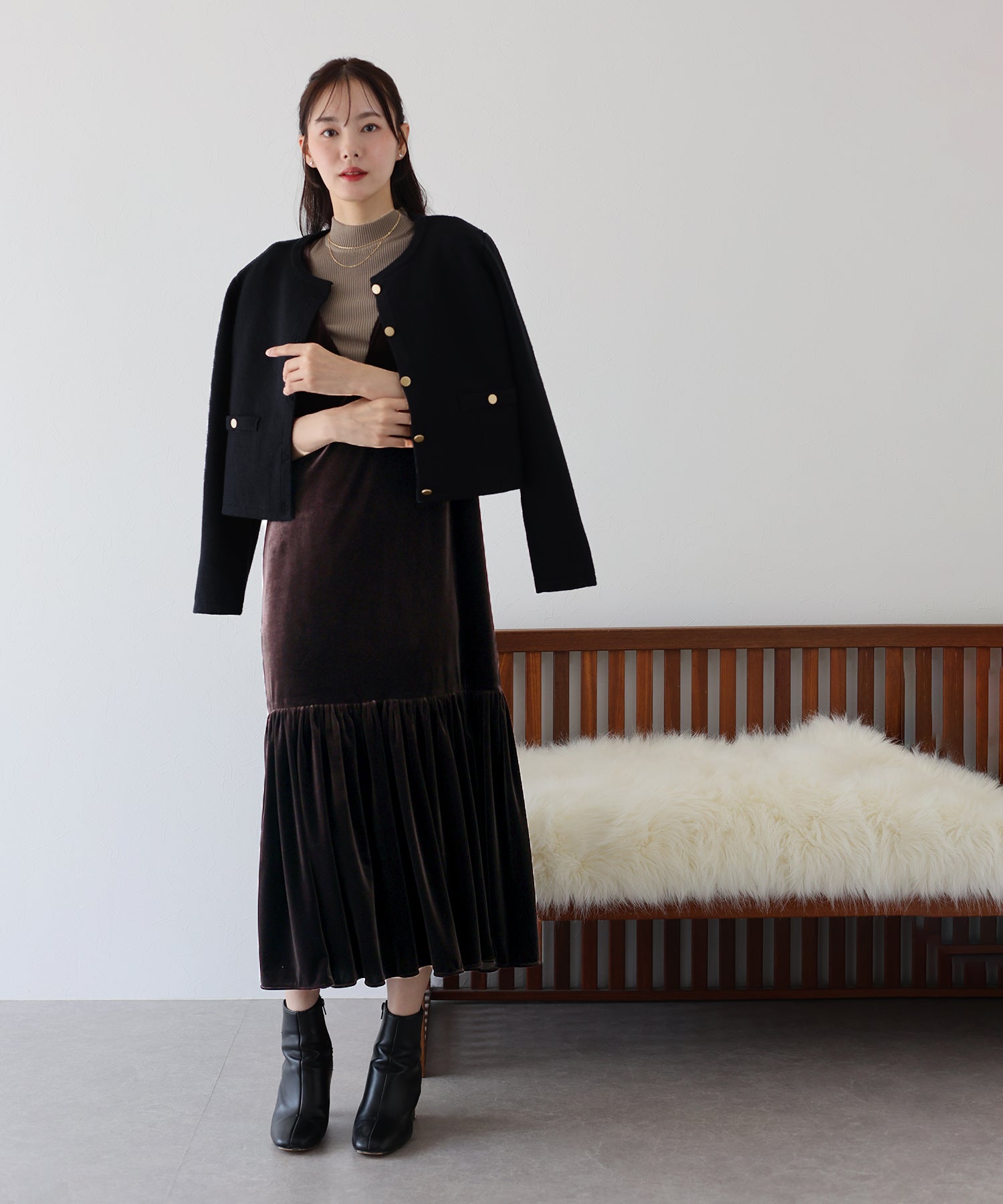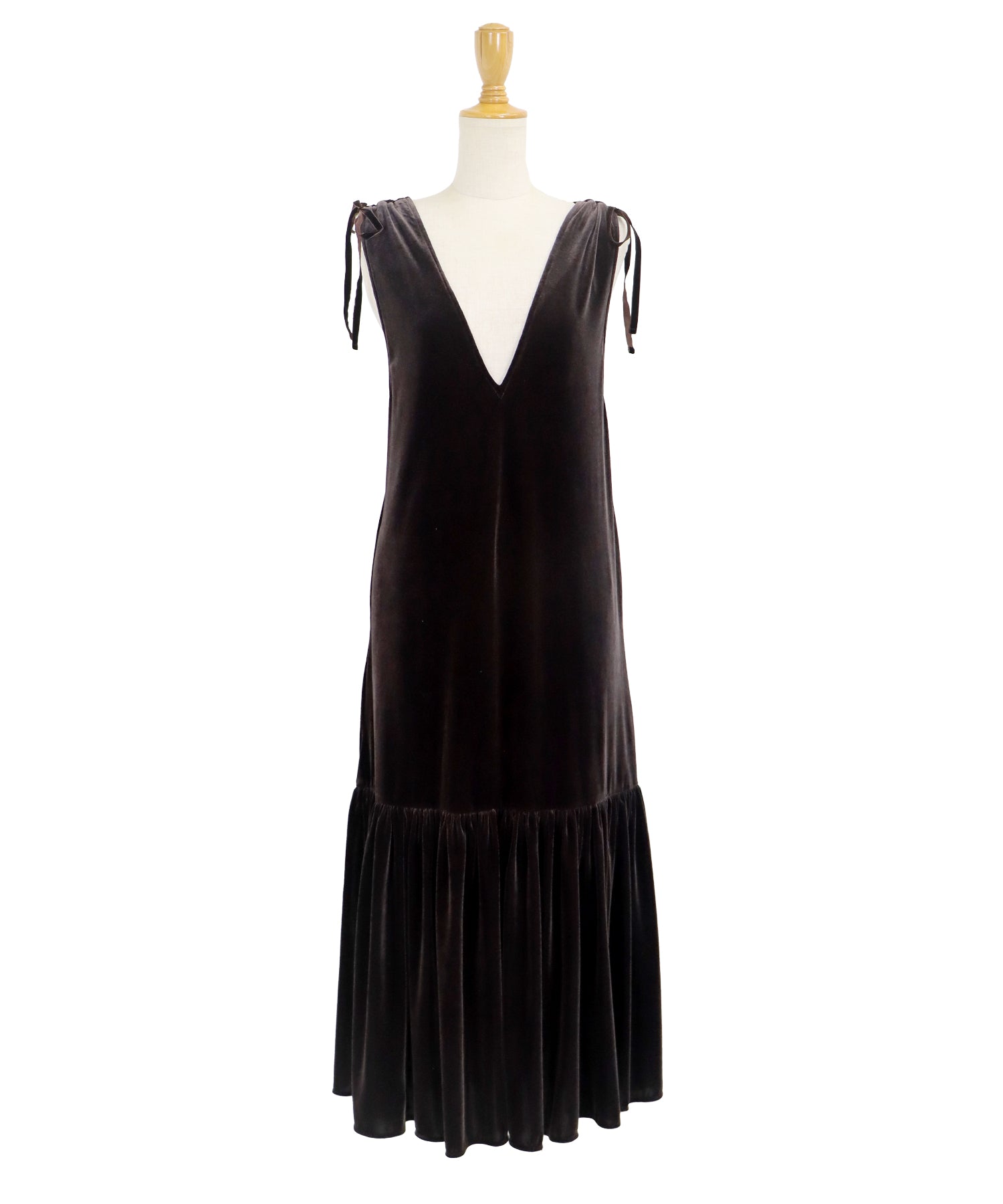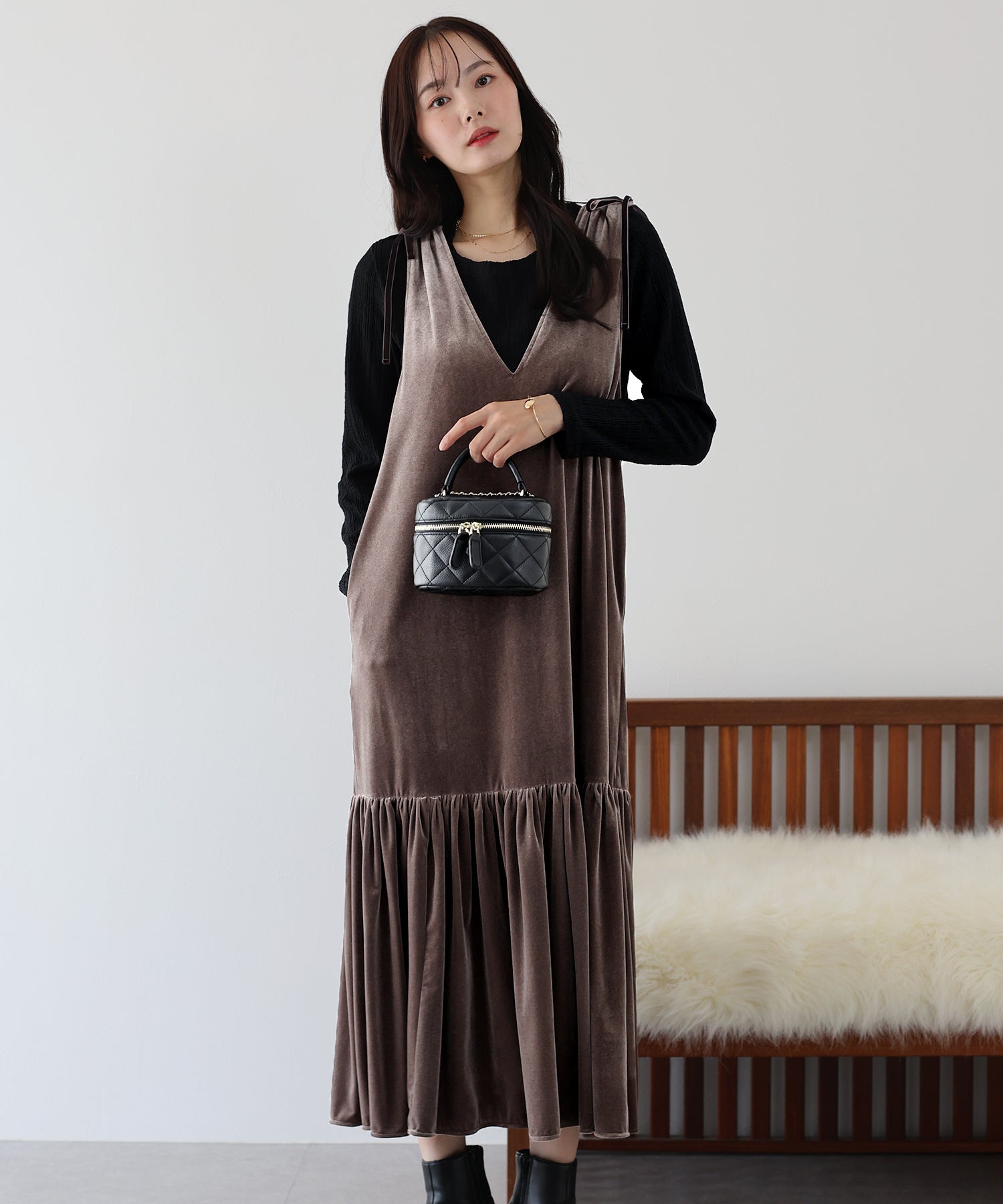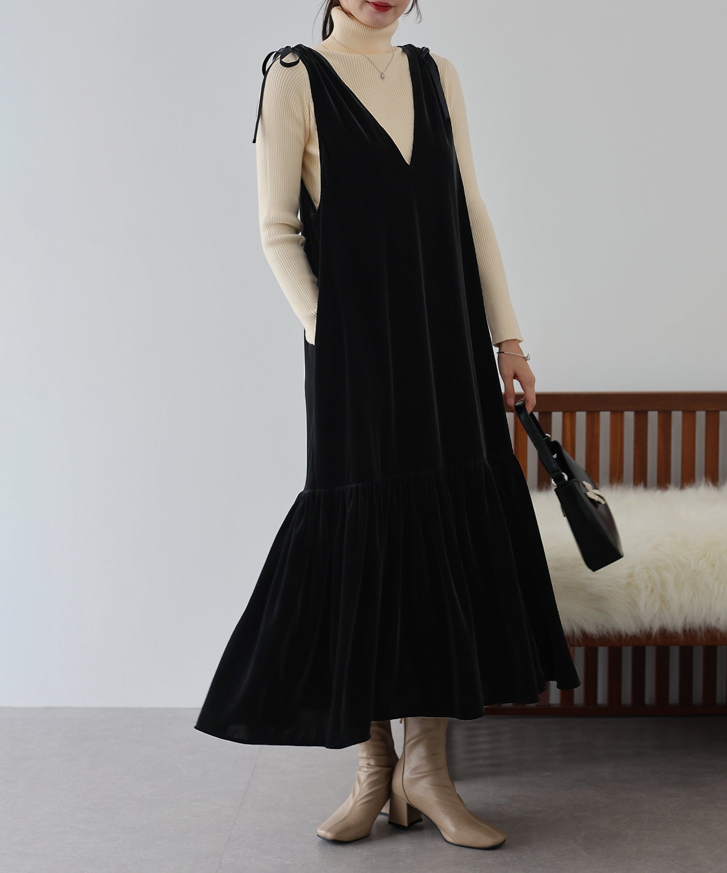 肩のリボンがポイントの上品&フェミニンなベロアワンピース