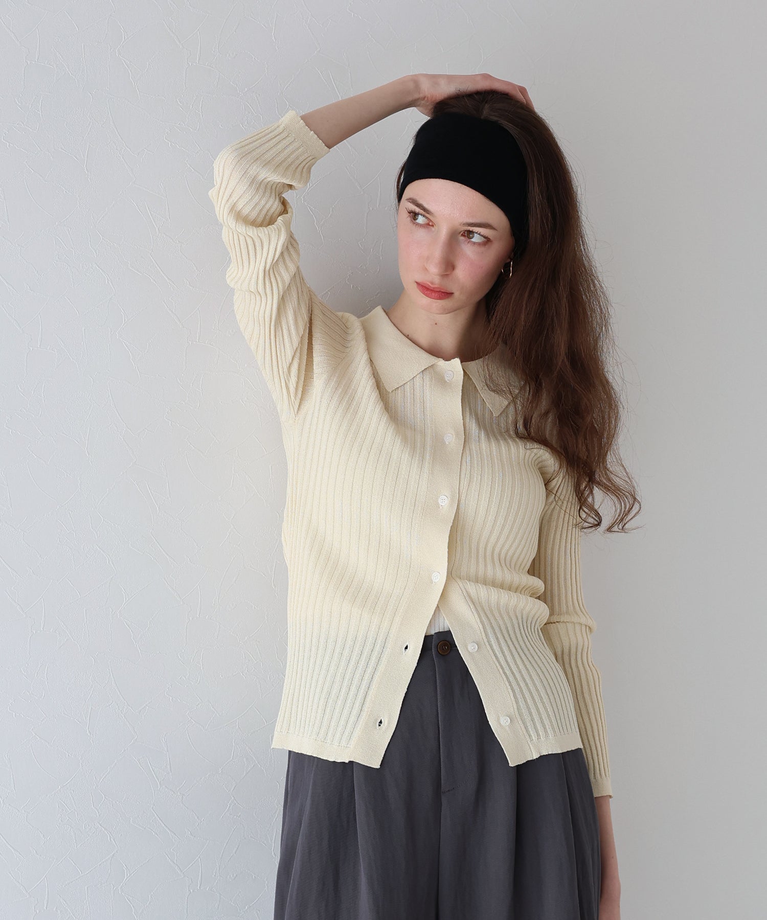 ナチュラルなポロネックのニットカーディガン ?POINT 表面感のあるデザインが魅力的な襟付きニットカーディガン。 衿付きのポロニットはカジュアルな中に程よく品の良さも感じられ、ほのかに入ったラメ糸が上品な印象。 伸縮性のあるリブ編みでラクに着られます。 着丈も長すぎず短すぎない程よい長さなのでデイリーに着用でき、 これを一枚着るだけでナチュラルながらもきちんと感を演出してくれます。