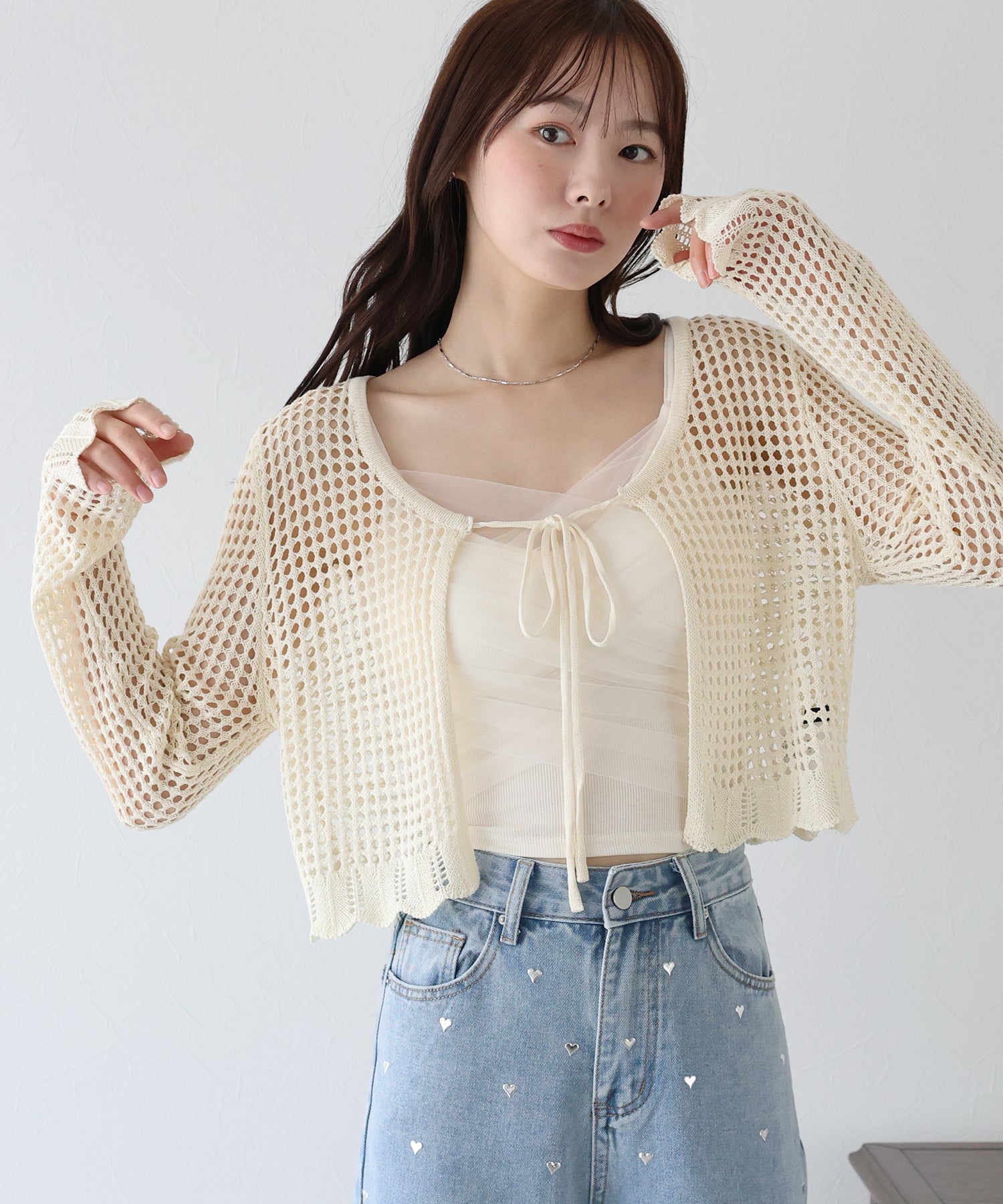 ?POINT リボンをフロントで結ぶ、ショート丈ボレロカーディガン。 ざっくりとしたメッシュ編みでカジュアルさを出しながら、肌見せで女性らしさもある1枚。 レイヤードしやすいショート丈なのでそのまま着るだけでバランス良く着られます。 袖口と裾はスカラップのような柄編みで可愛らしいポイントをプラス! 透け感が軽やかで、さらっとしたドライタッチのサマーニットで春夏に重宝するアイテムです。