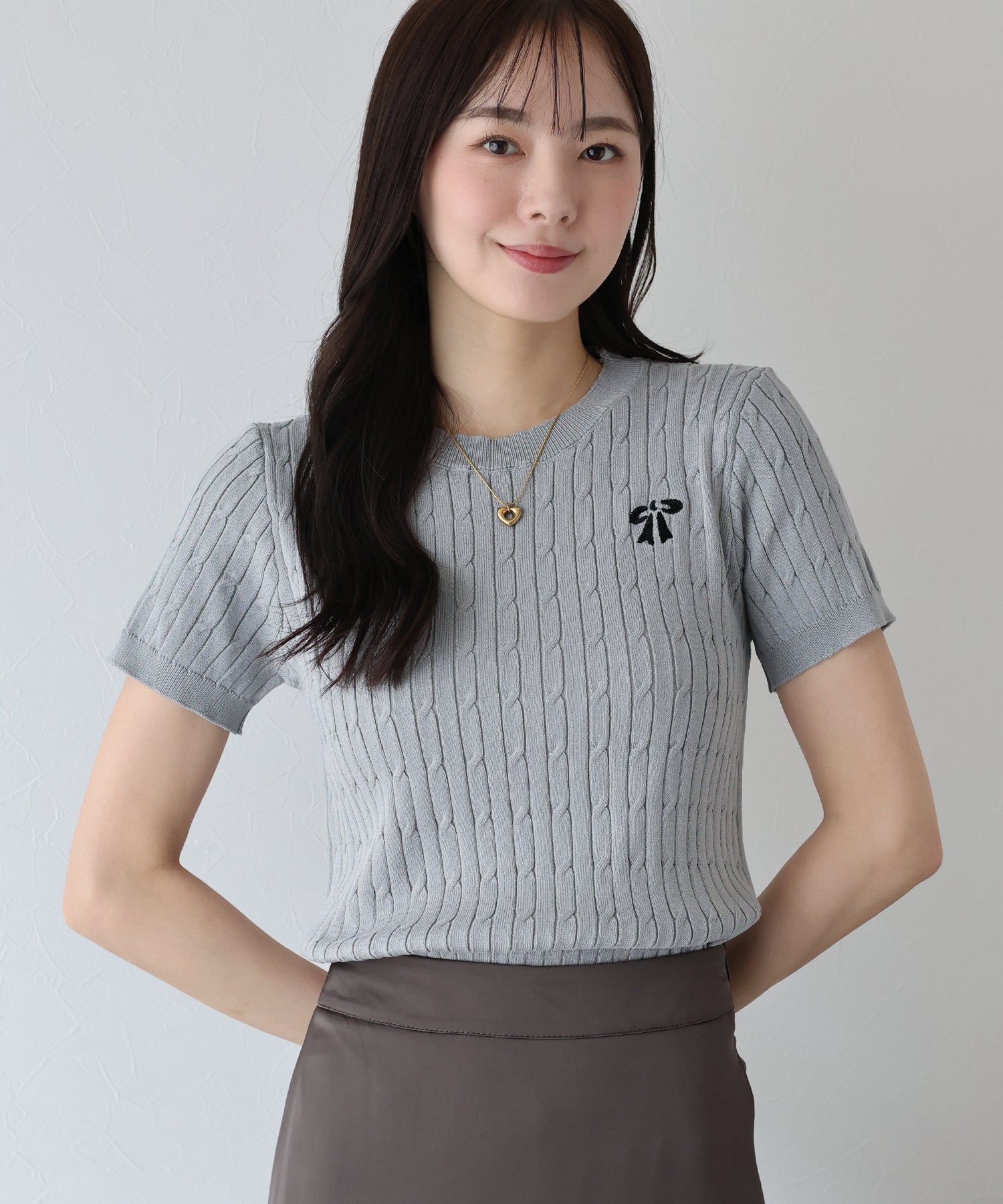 - ワンポイントリボン刺繍ケーブルニット【ネコポス】