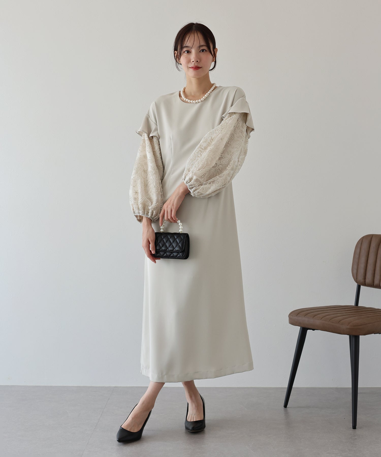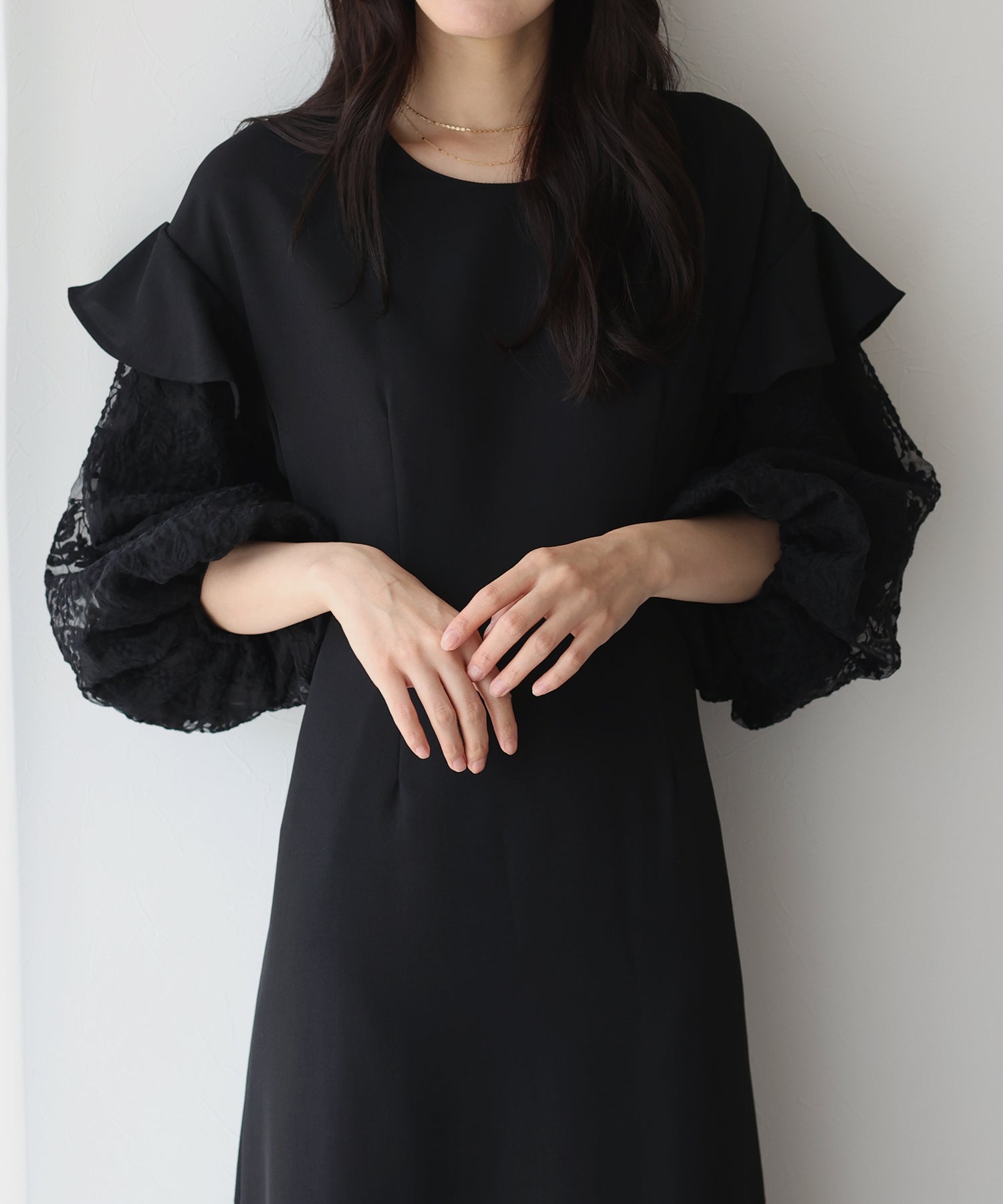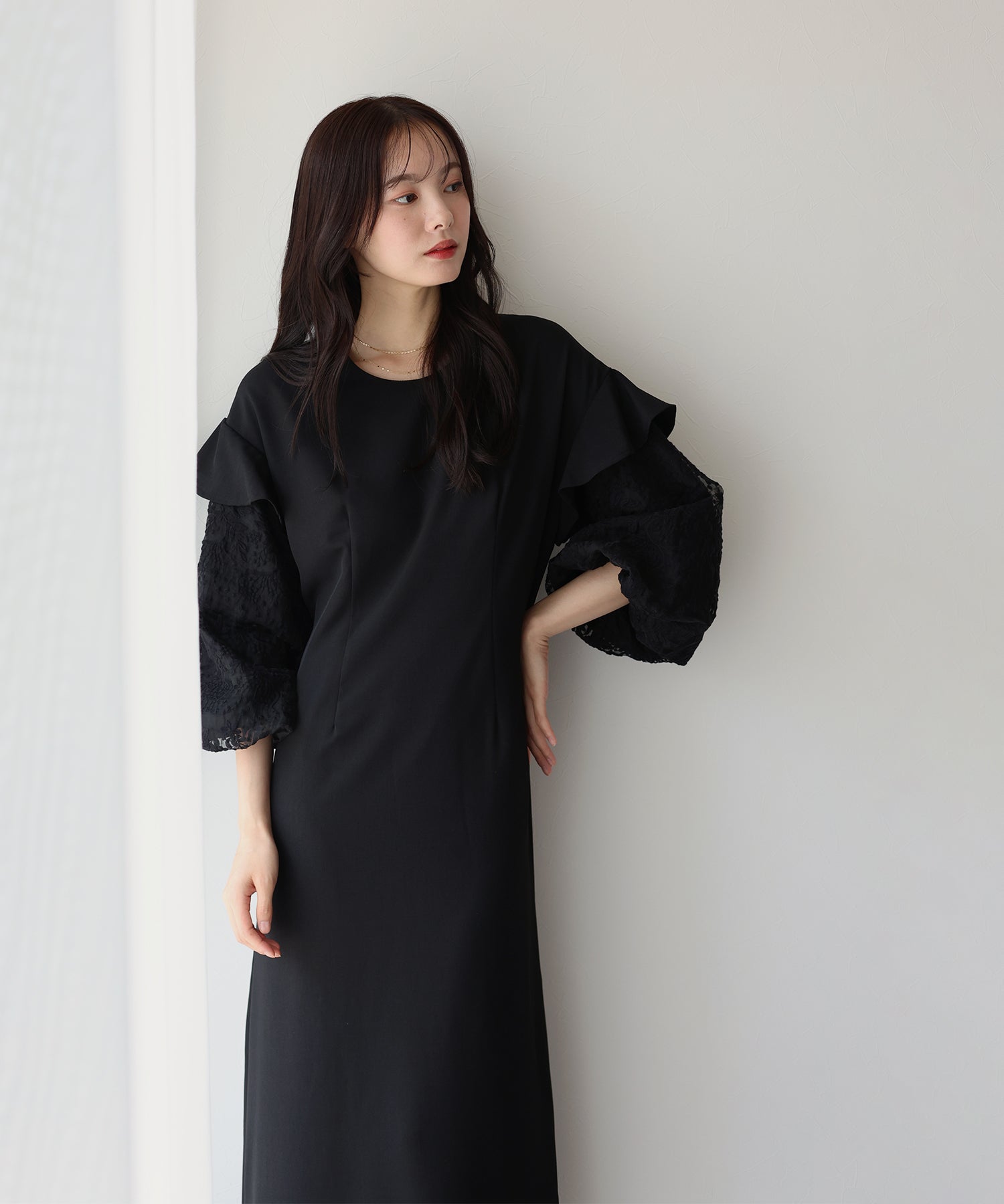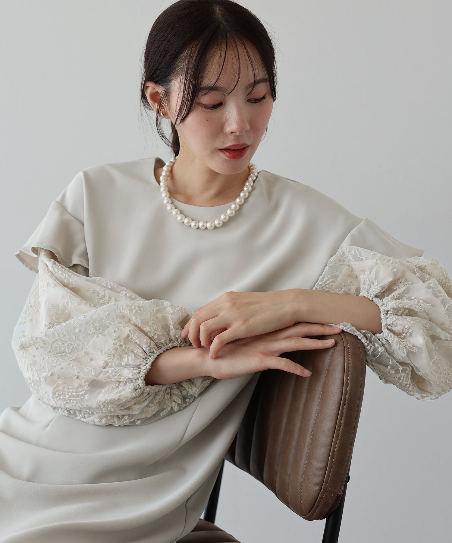 シンプルながらもぽわんとした袖やレース使いでフェミニンな要素をプラスした1着です。
