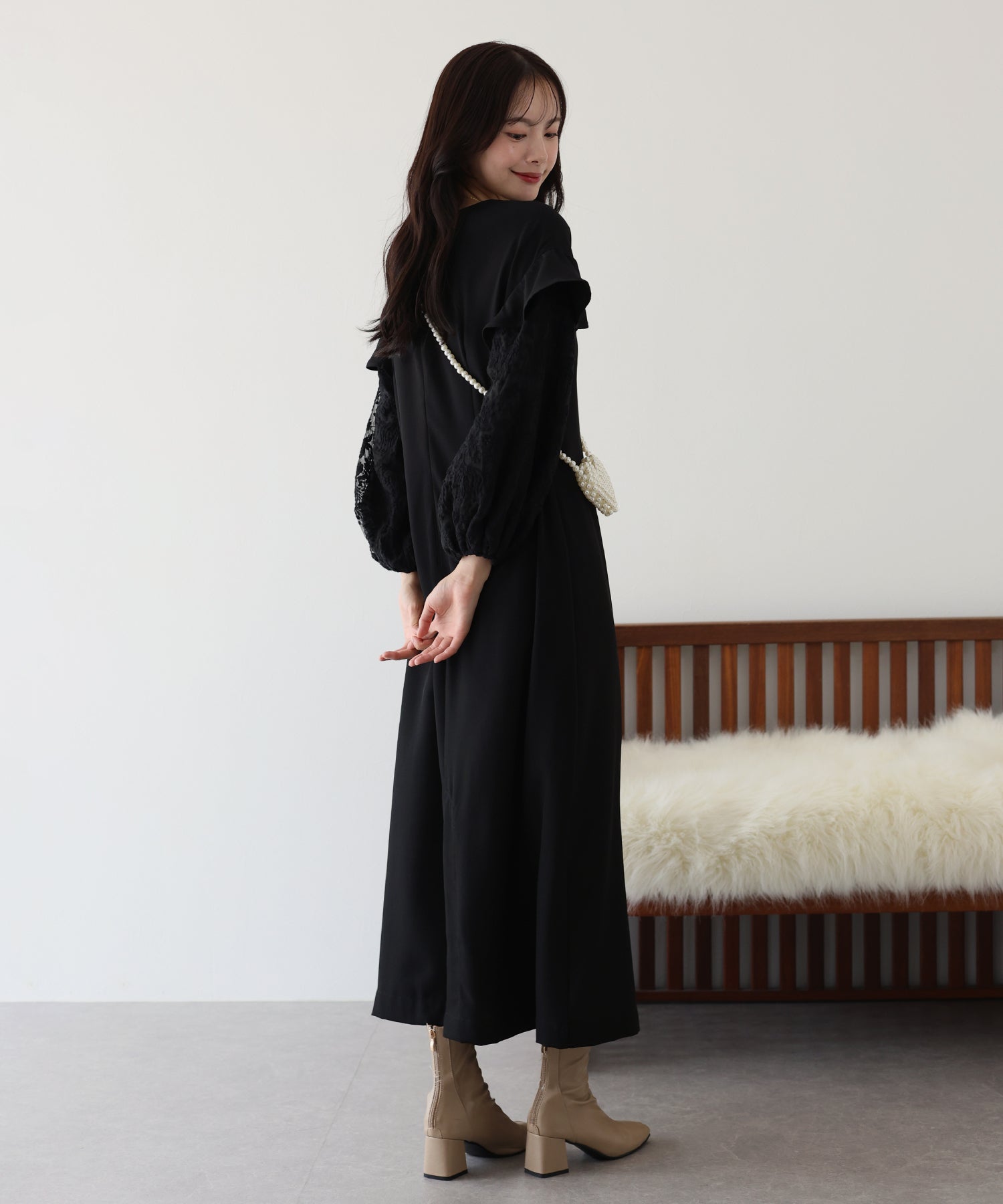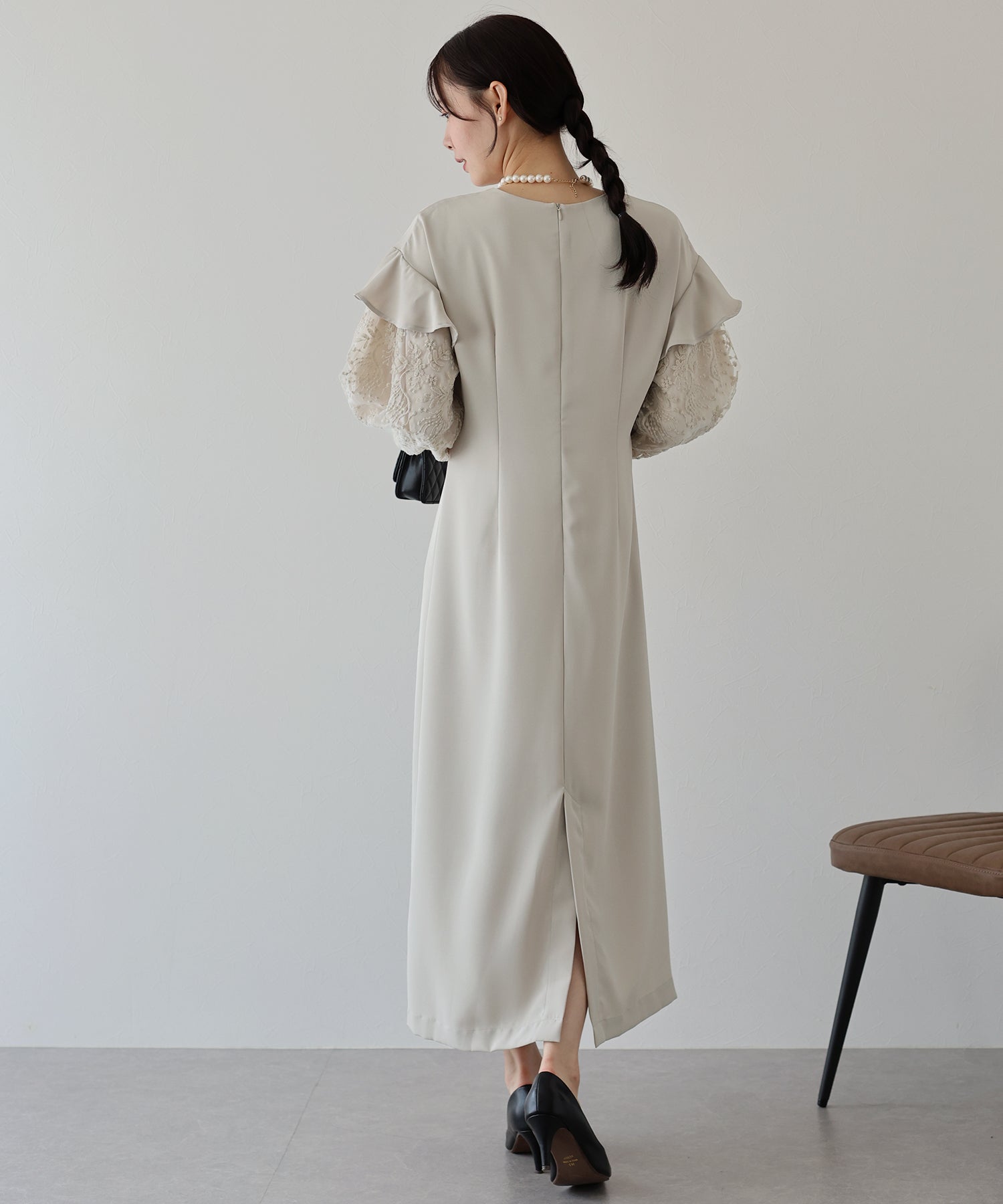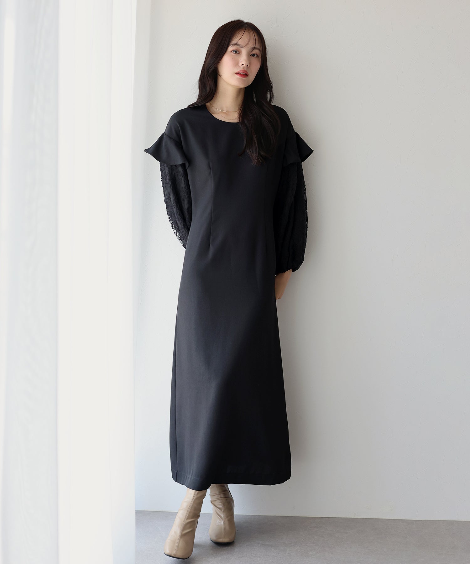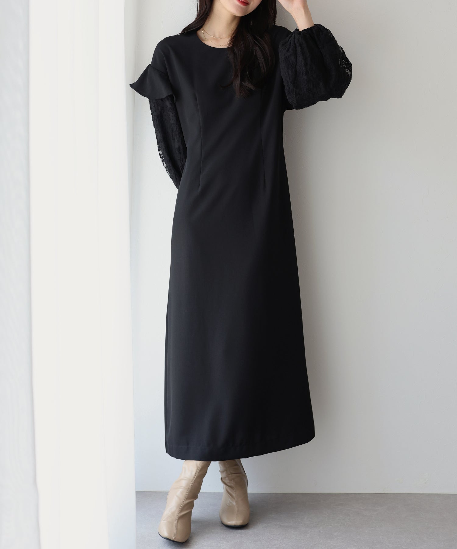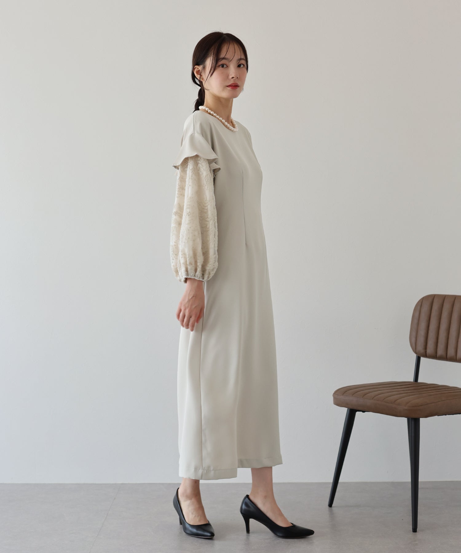 シンプルながらもぽわんとした袖やレース使いでフェミニンな要素をプラスした1着です。