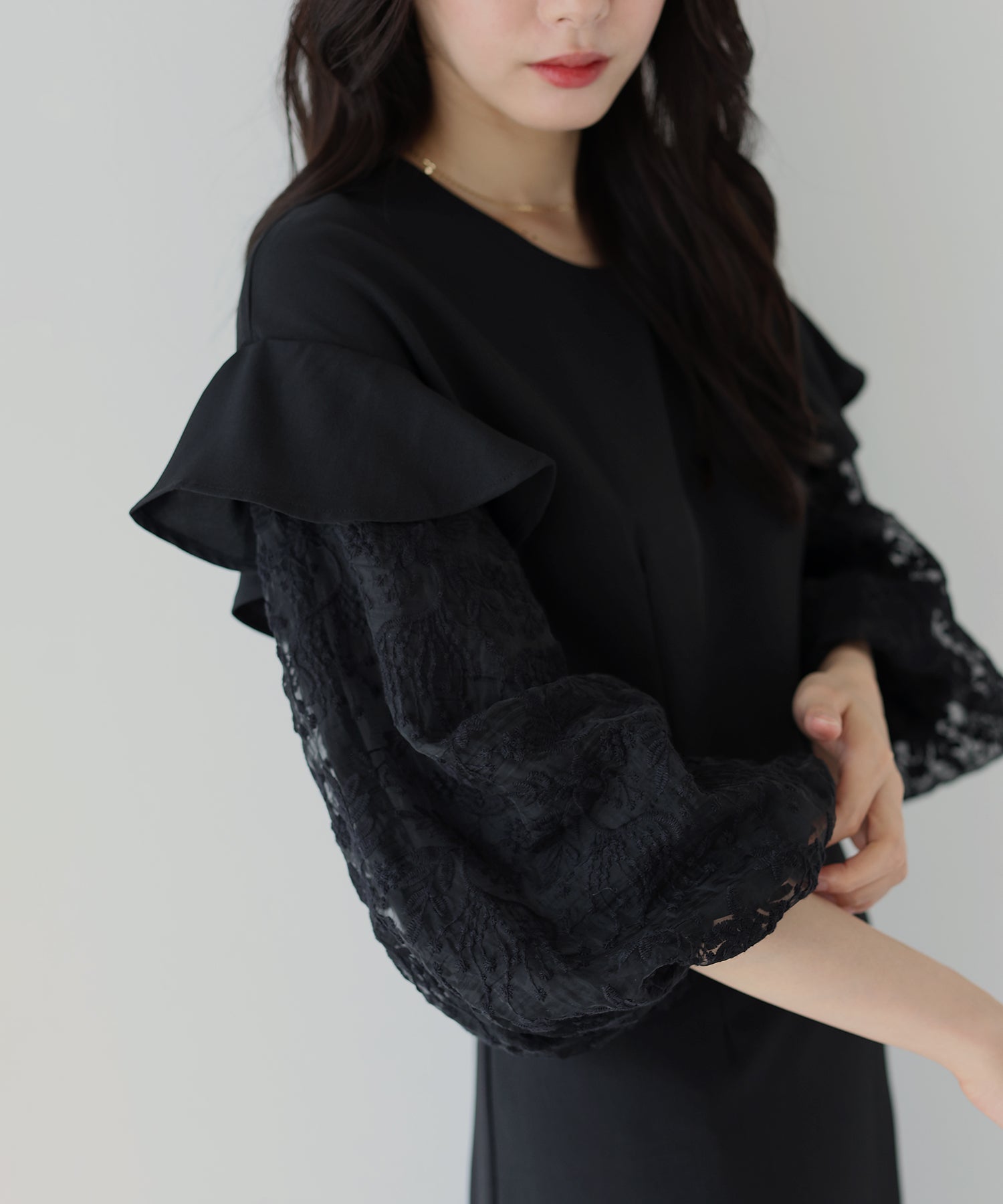 袖にあしらった花柄の刺繍とフリル&ボリュームスリーブデザインでフェミニンな印象をプラス。