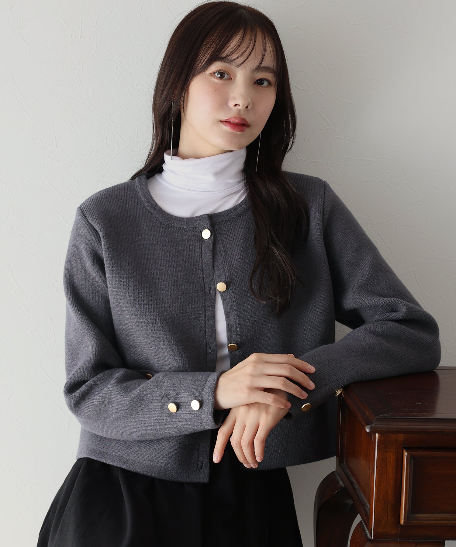配色に金釦がアクセントになったクルーネックニットカーディガン。