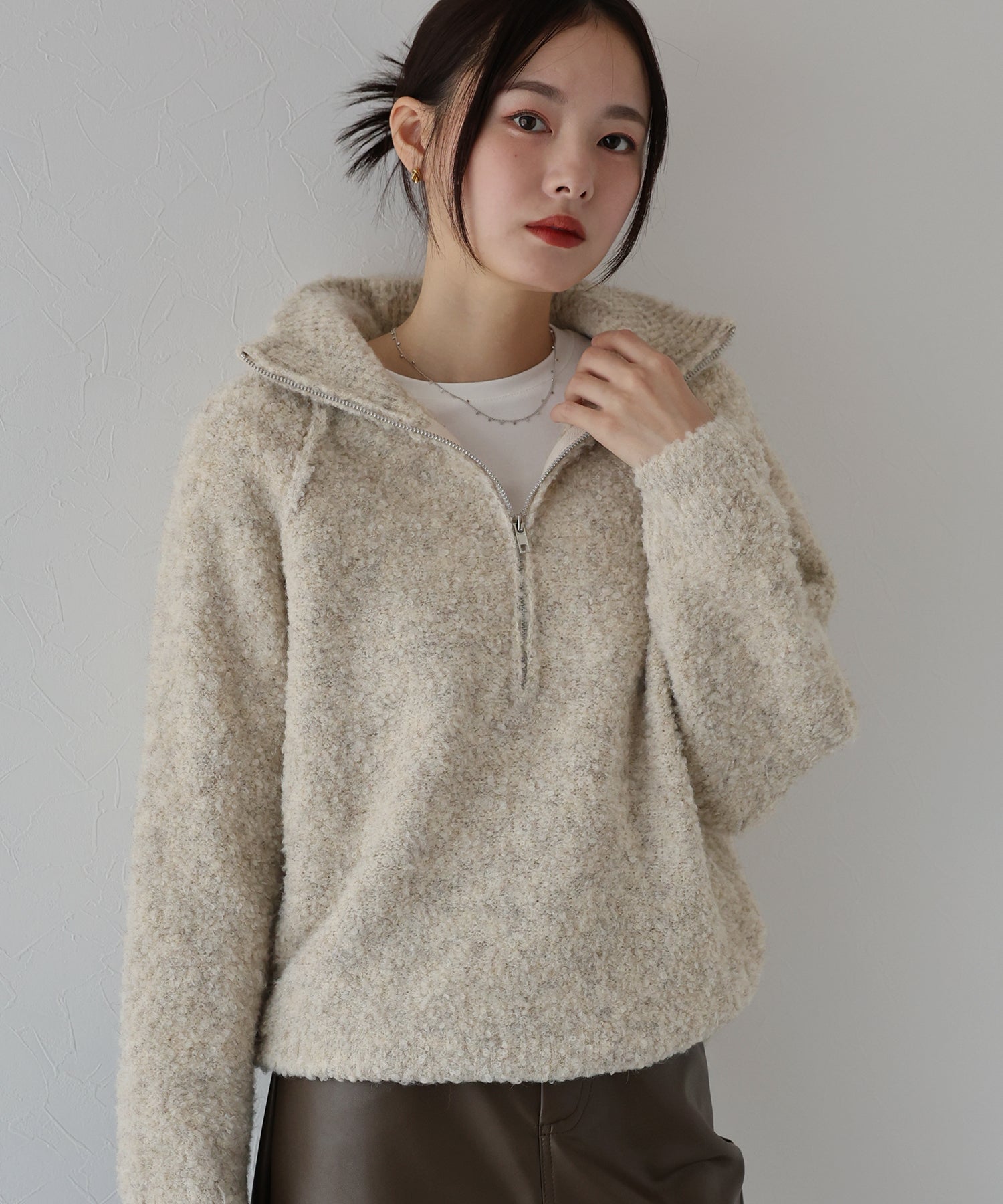 ?STYLING ハーフジップの開け具合で、好みに合わせて楽しめる一枚。 一枚でも、インナーを合わせたレイヤードスタイルもおすすめです。 スラックスやロングスカートと合わせて大人カジュアルにも、ショート丈のボトムスにロングブーツを合わせてガーリーにも合う、着まわしやすいアイテムです。 ロングボトム合わせの時は、ジップを開けて抜け感を出すと好バランス。 デイリー~お出かけ用として多様なシーンにお使い頂けます。