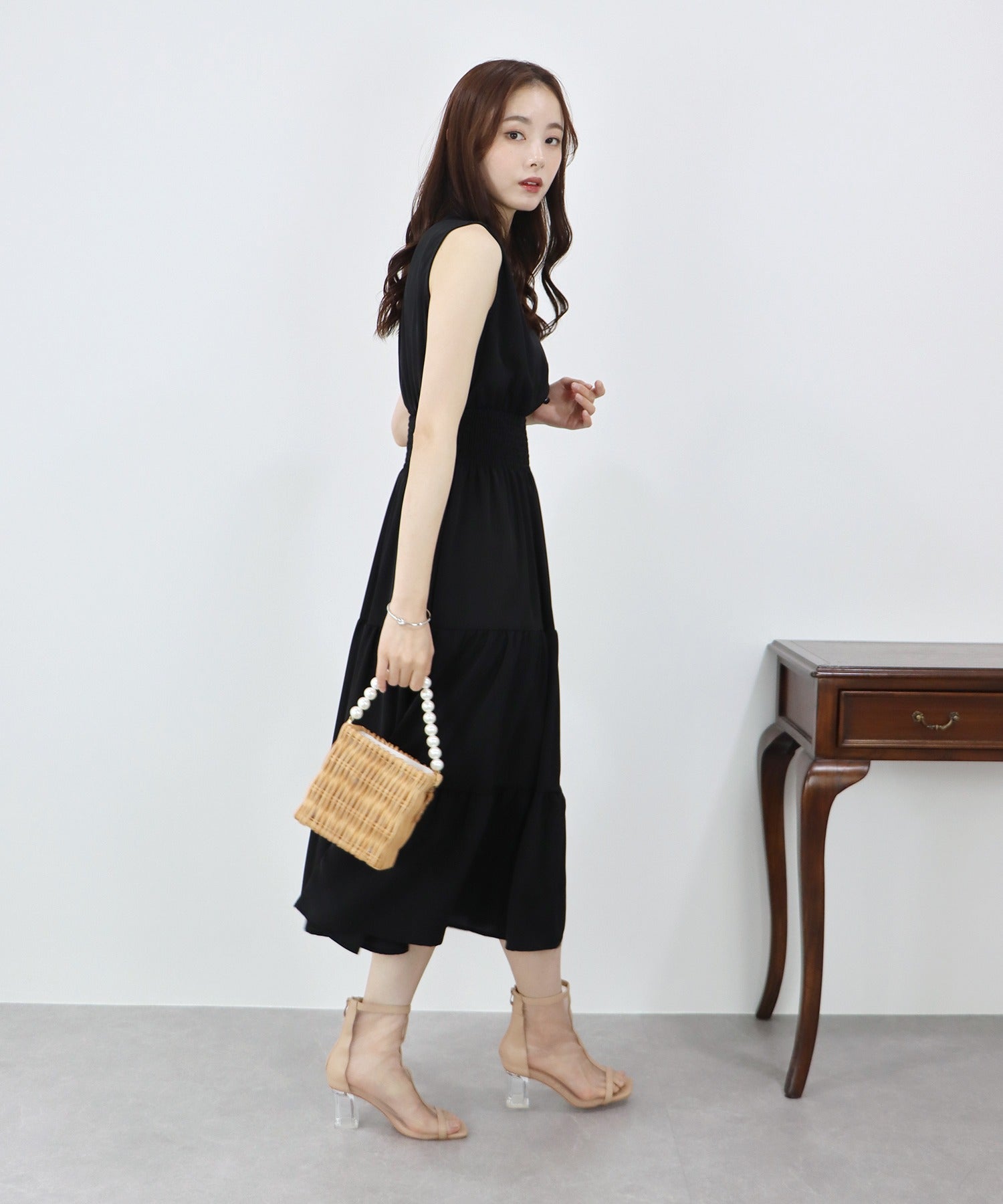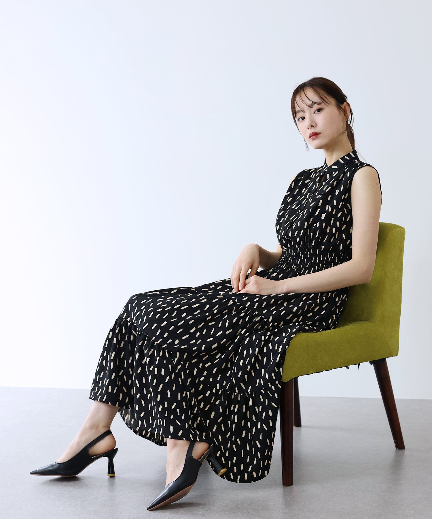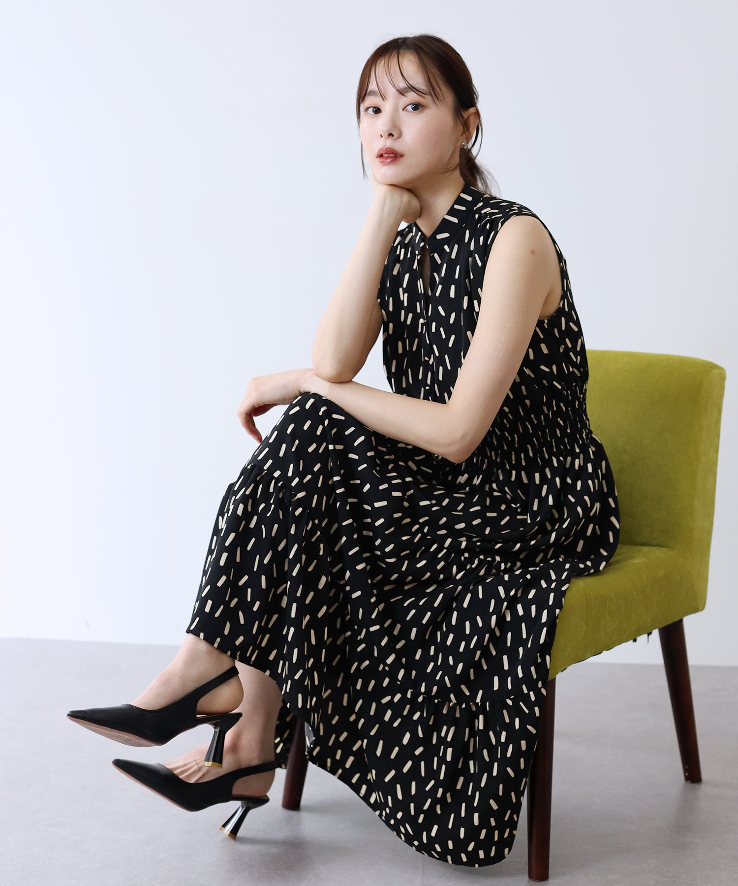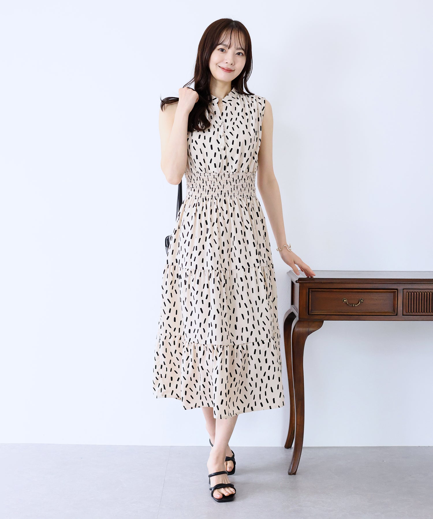 ?STYLING 1枚で着映えするワンピースは足元や小物で印象を変えて楽しめます。 ヒールを合わせてフェミニンに、 クリアサンダルやかごバッグなどの季節感のあるアイテムを合わせて夏らしいコーディネートが◎