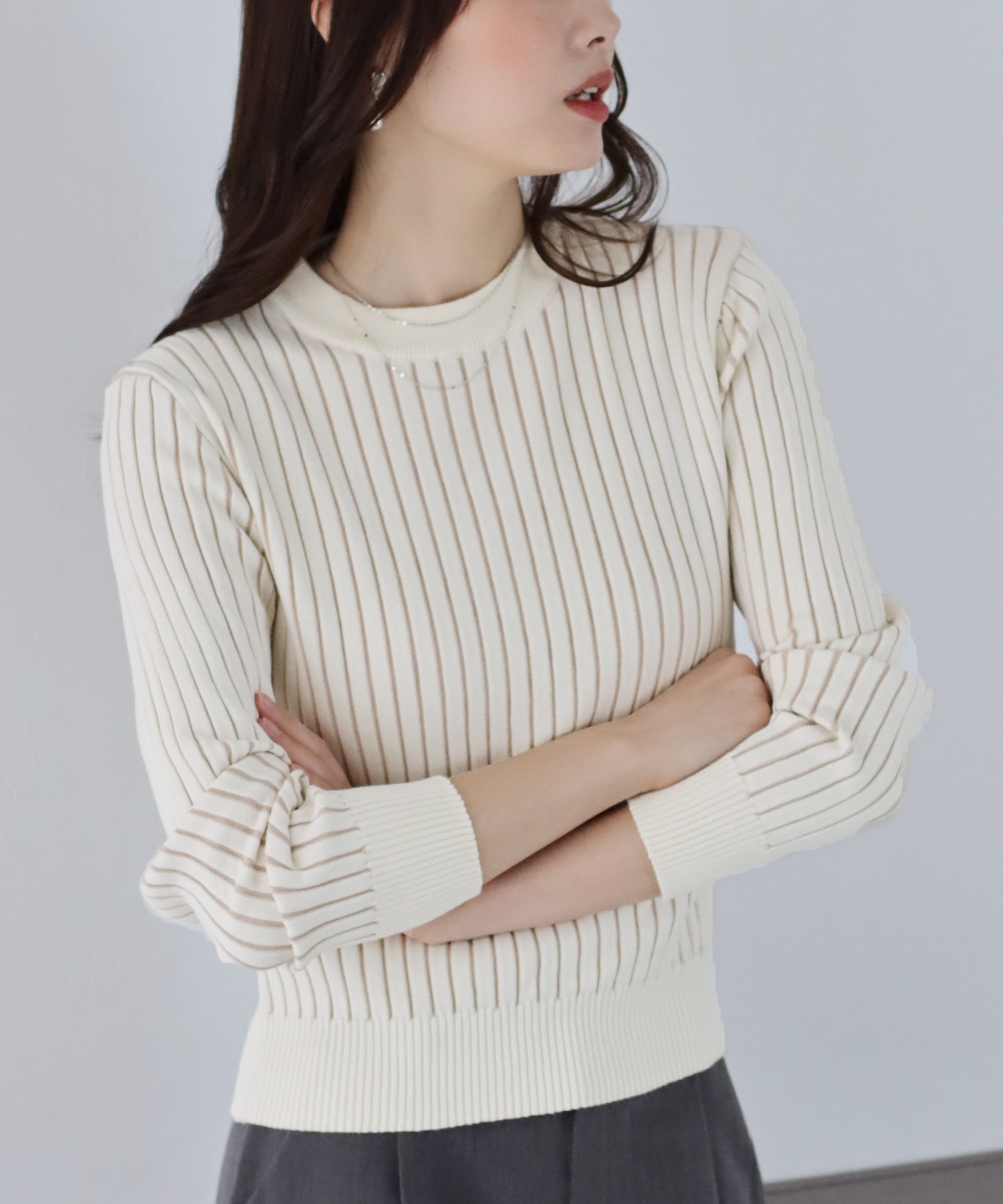 無地&バイカラーストライプのニットトップス ?POINT シンプルなデザインで1枚で着ても、様々なボトムにも似合うベーシックなリブニット。 伸縮性に優れているニット素材で着心地も◎ 締め付け感を感じにくいのも嬉しいポイント! ベーシックな無地と、ワイドなリブからちらっと見える配色のカラー展開です。