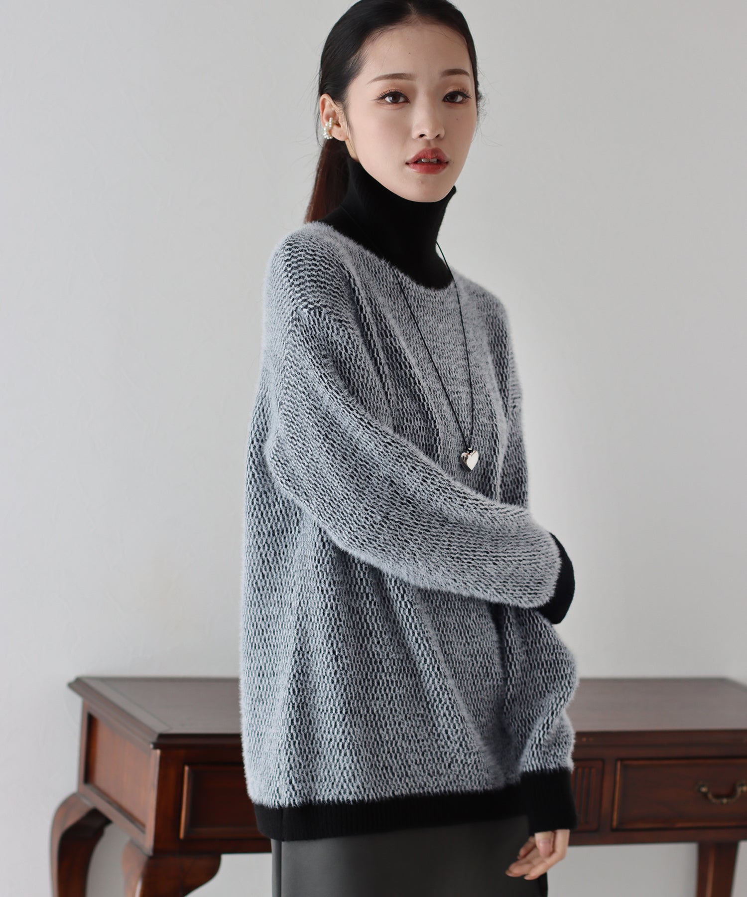 配色デザインが目をひくハイネックニット ?POINT 柔らかな肌触りで、暖かく包み込んでくれるニットプルオーバー。 程よく起毛感のある配色の編地が特徴的で、落ち着いた色の組み合わせで着やすいのがポイント。 ネックと袖口、裾のリブ部分を単色使いすることでトレンドライクな配色のデザインに仕上げました。 オーバーサイズでゆったりと着られるので、体のラインを拾わずにおしゃれなスタイリングができる一枚です。