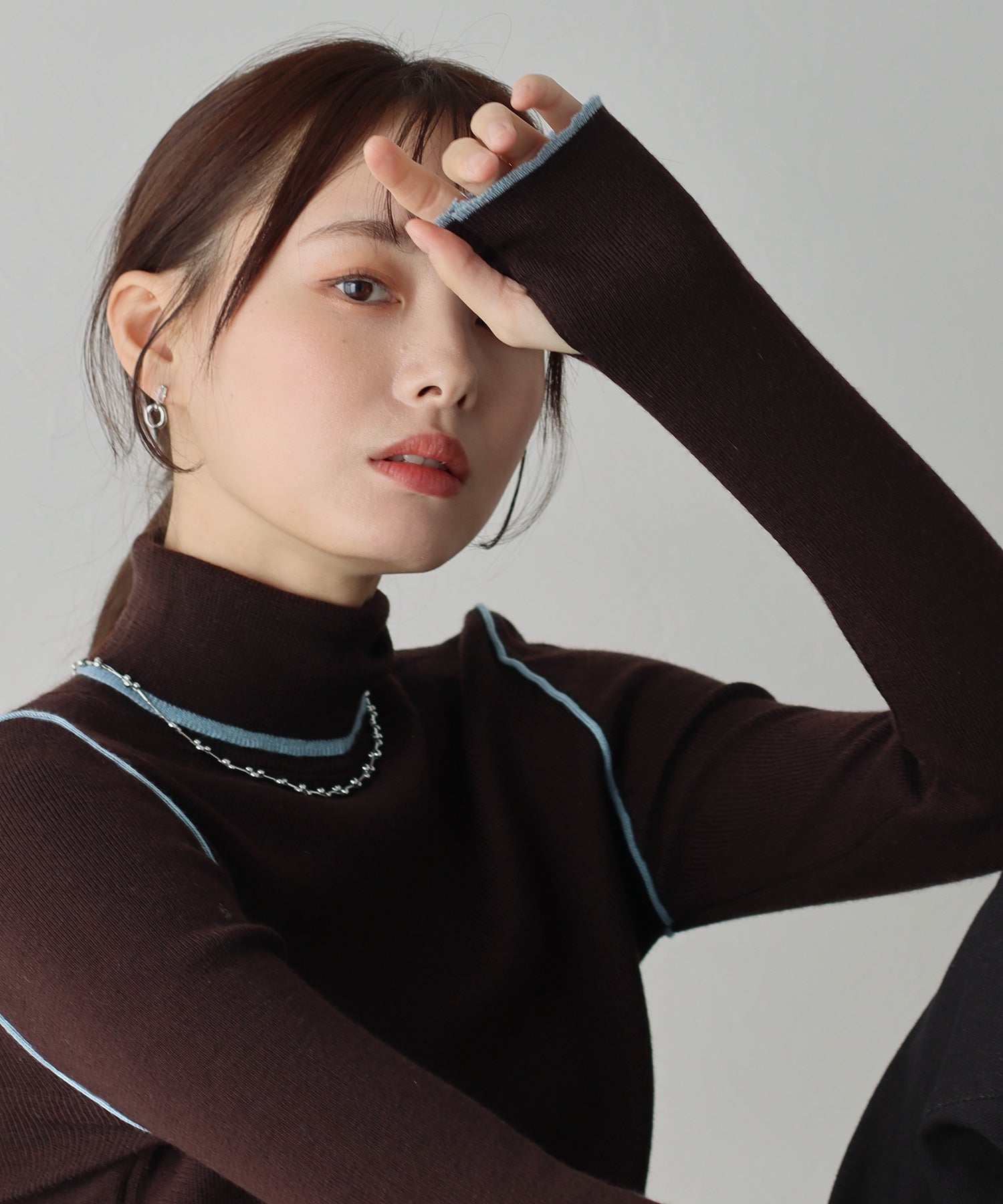 秋冬コーデに華やかさをプラスしてくれるタートルニット ?POINT 首元、袖口と肩のラインに施されたバイカラーのパイピングが目を惹くニットトップス。 一枚でも、インナー使いでも活躍すること間違い無し! 袖口はフィンガーホール(サムホール)仕様でクシュッとなる長めの袖丈が今年らしいデザイン。 配色デザインで後ろ姿までおしゃれにキマるデザインで、コーディネートのアクセントとしても◎ シンプルなニットなのでキレイめのボトムとも相性が良く、オンオフ着回せます。