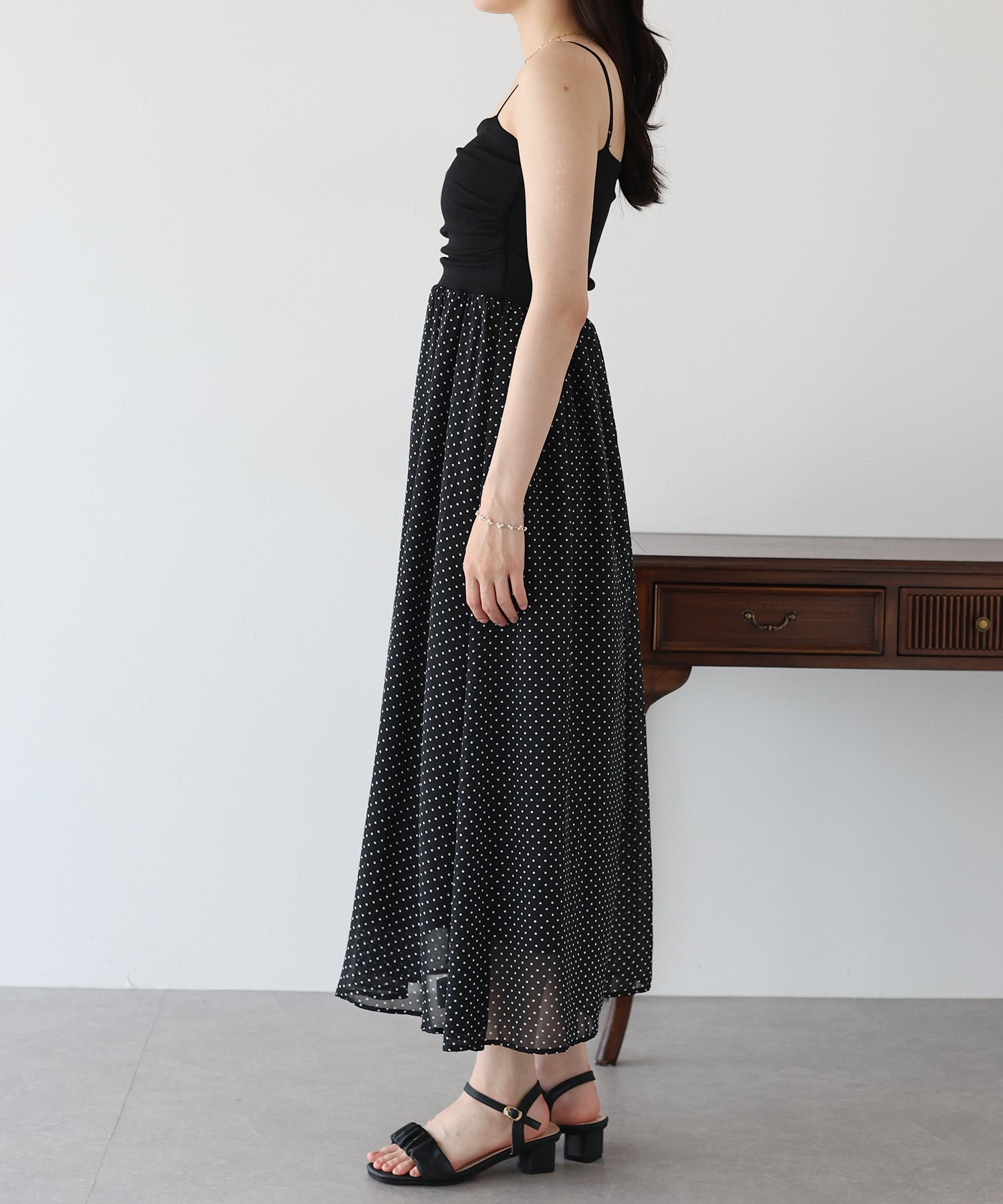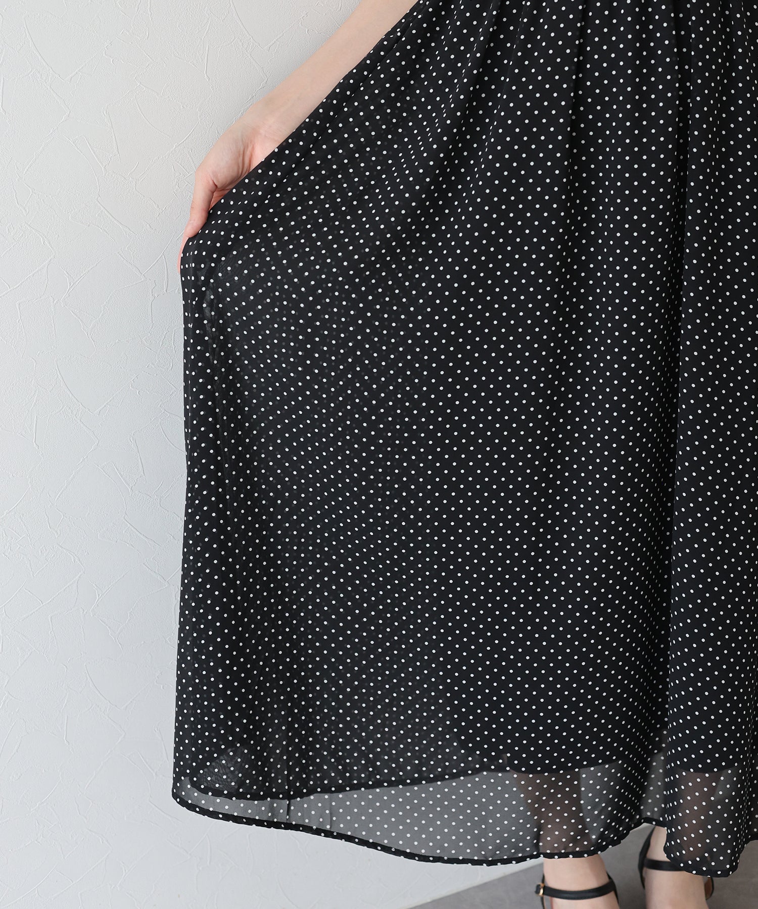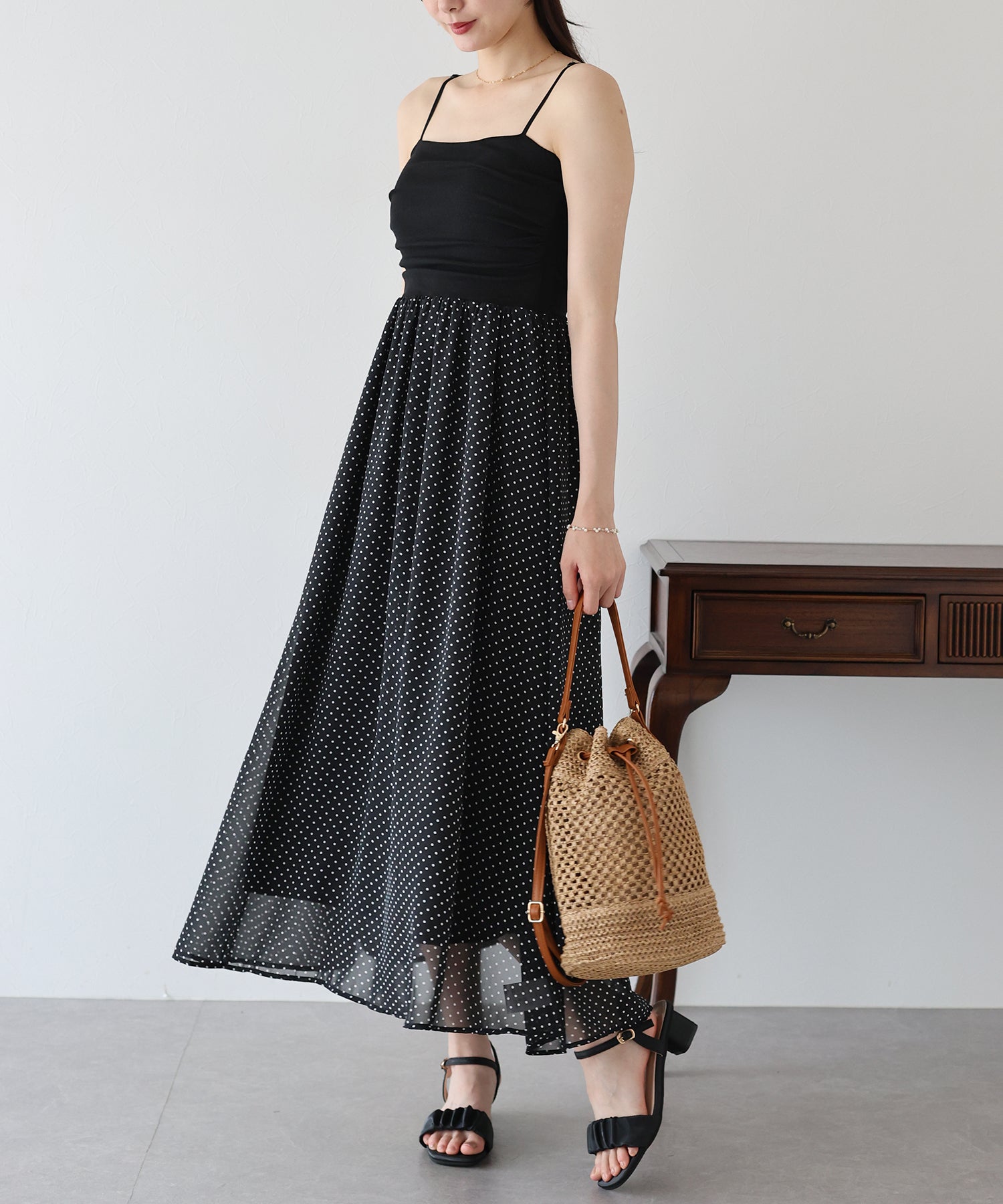 | 生地 | 身頃:伸縮性の高いカットソー生地 スカート: 【ホワイト?ブラック】ナチュラルなしわ感のある無地レーヨン混素材 【ブラック系】足元に透け感のあるドット柄生地 |