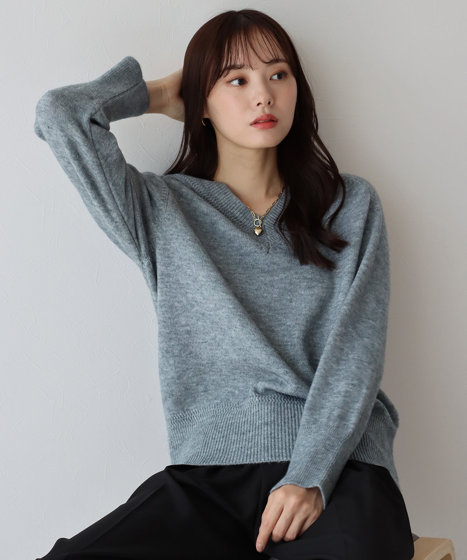 袖口とウエスト部分の太めのリブがポイント。首元はVネックで顔周りをすっきりと見せてくれます。