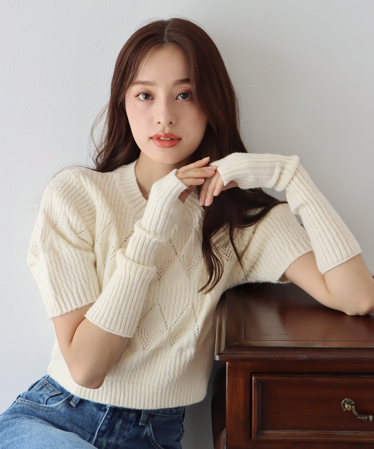 半袖のケーブルニットトップスと、アームカバーのセットアイテム。