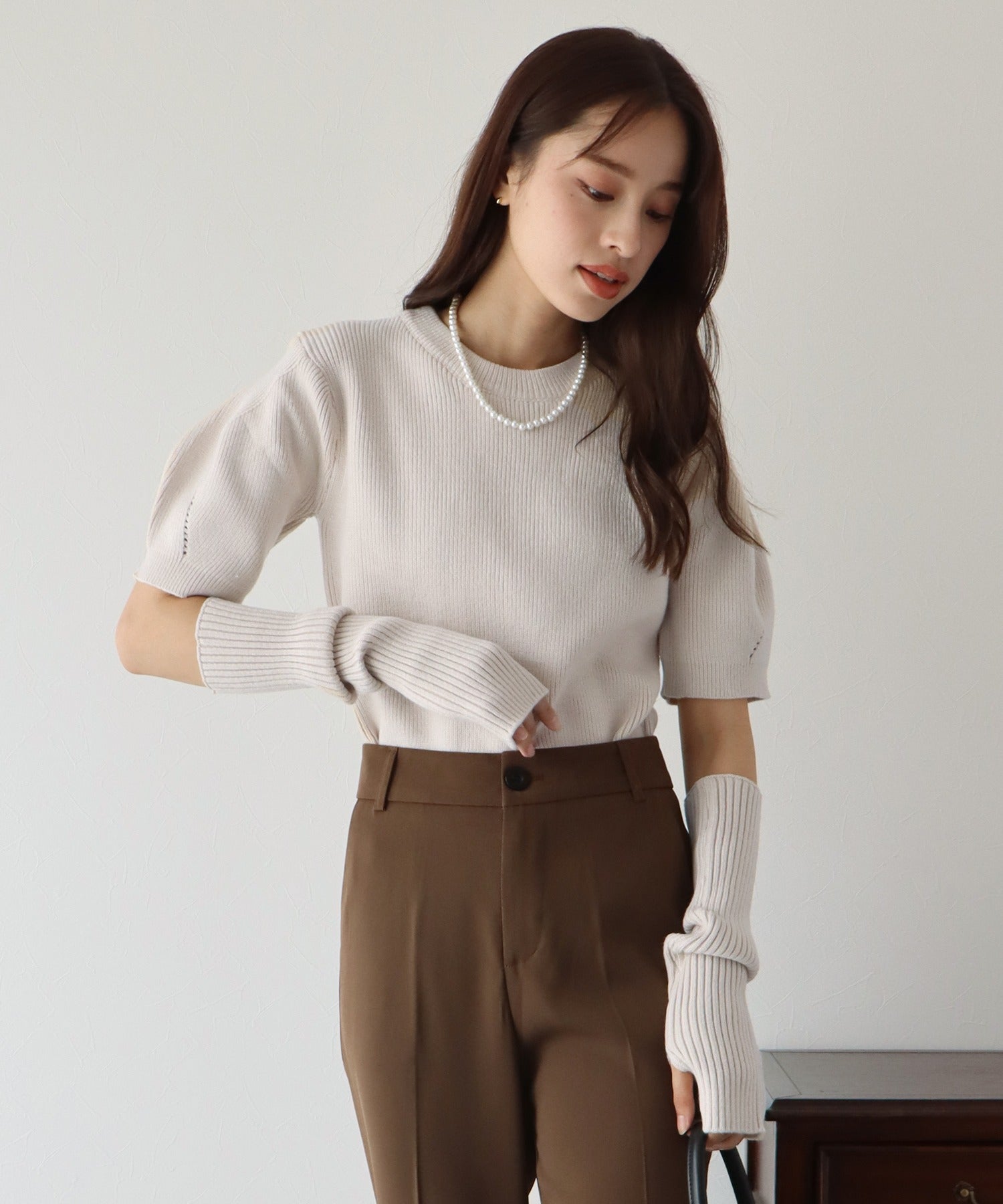 半袖のもっちりニットトップスと、アームカバーのセットアイテム。