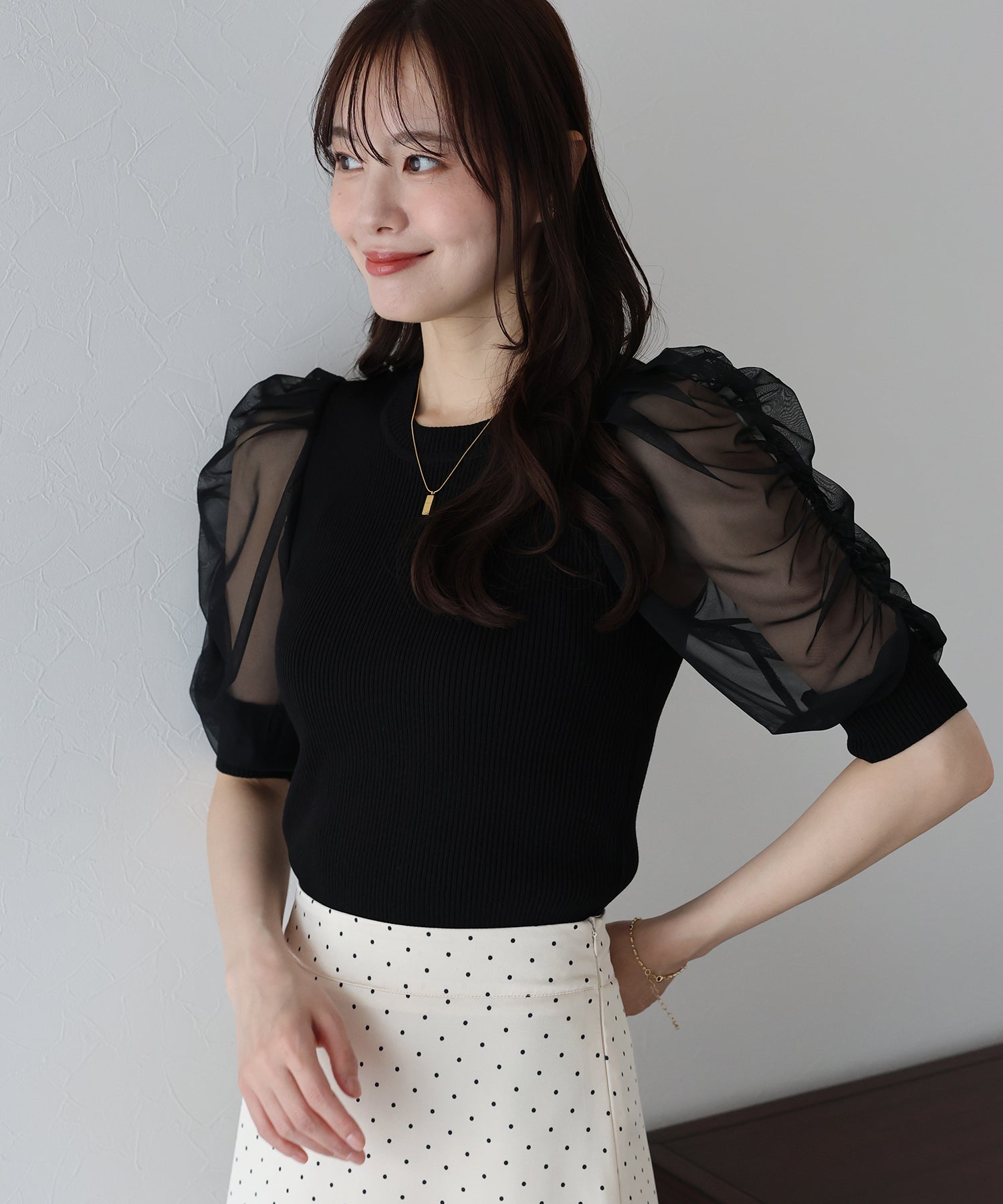 シンプルなリブニットの身頃に、シアーオーガンジーをドッキングしたパフスリドッキングニットプルオーバー。