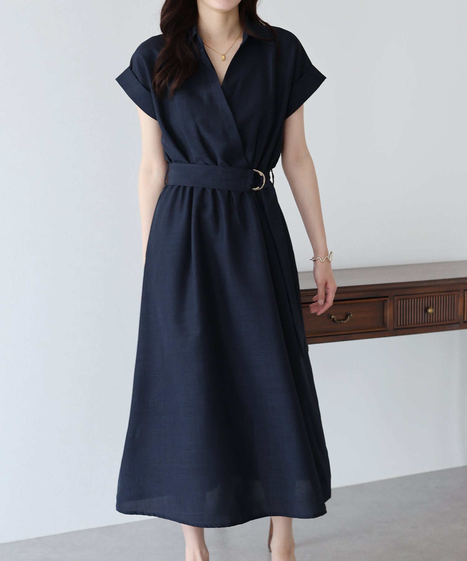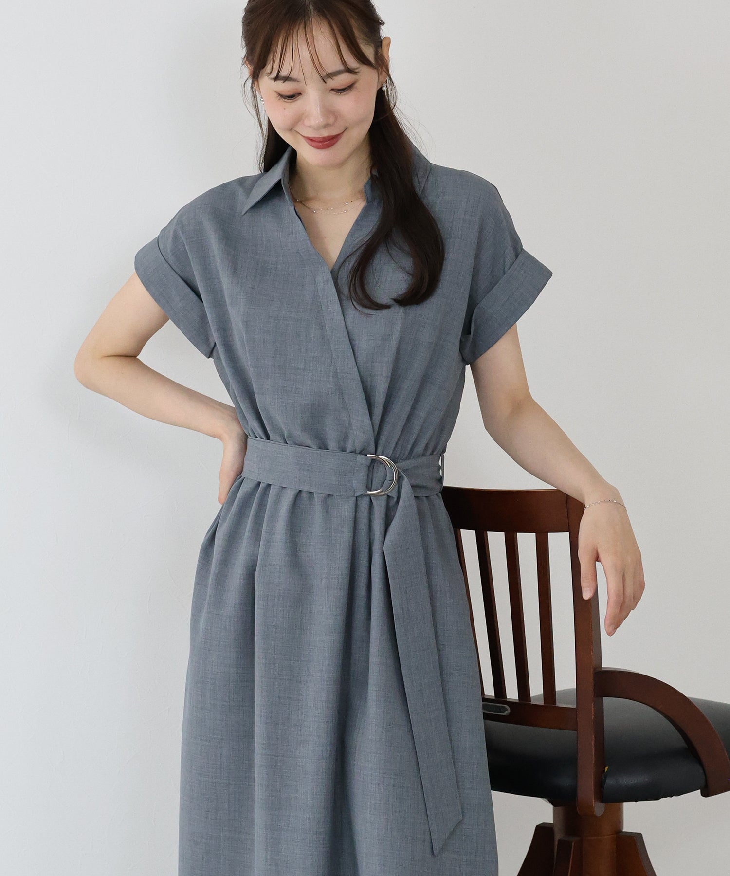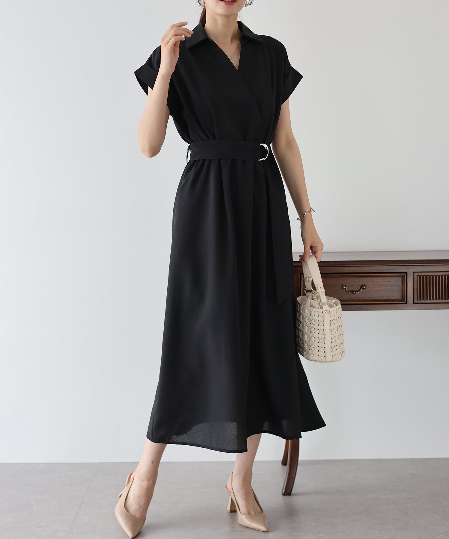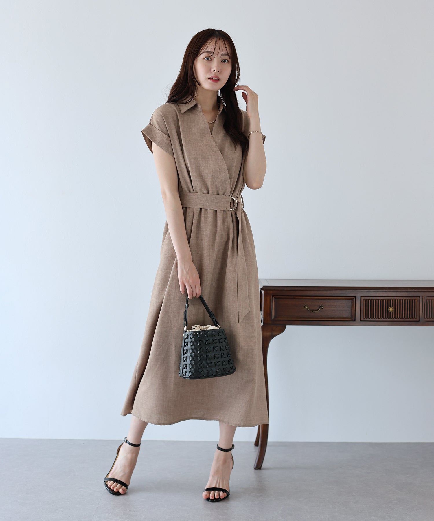 襟付きのVネックでデコルテをスッキリ見せ、魅力的に着痩せが叶う大人上品なワンピース。