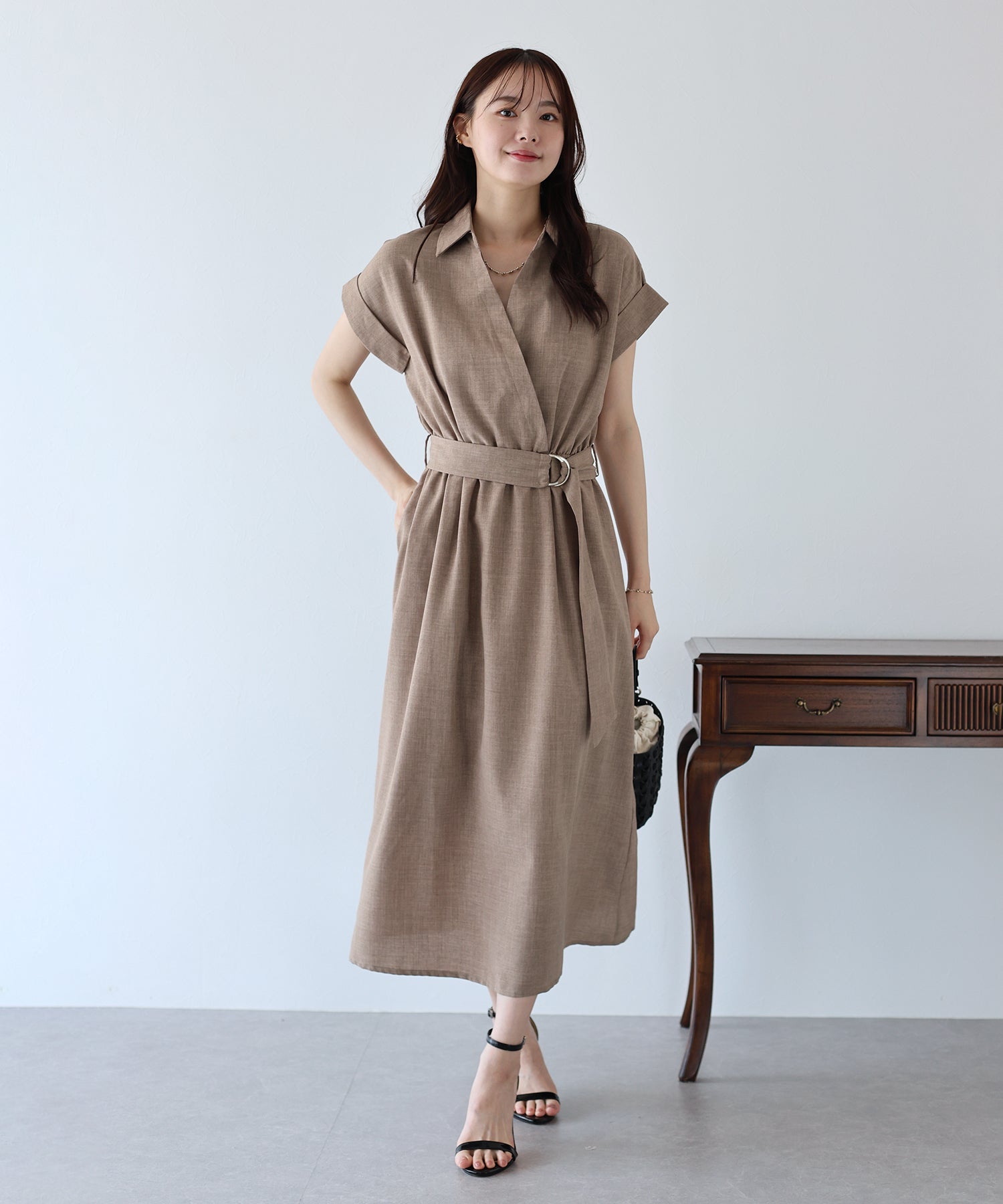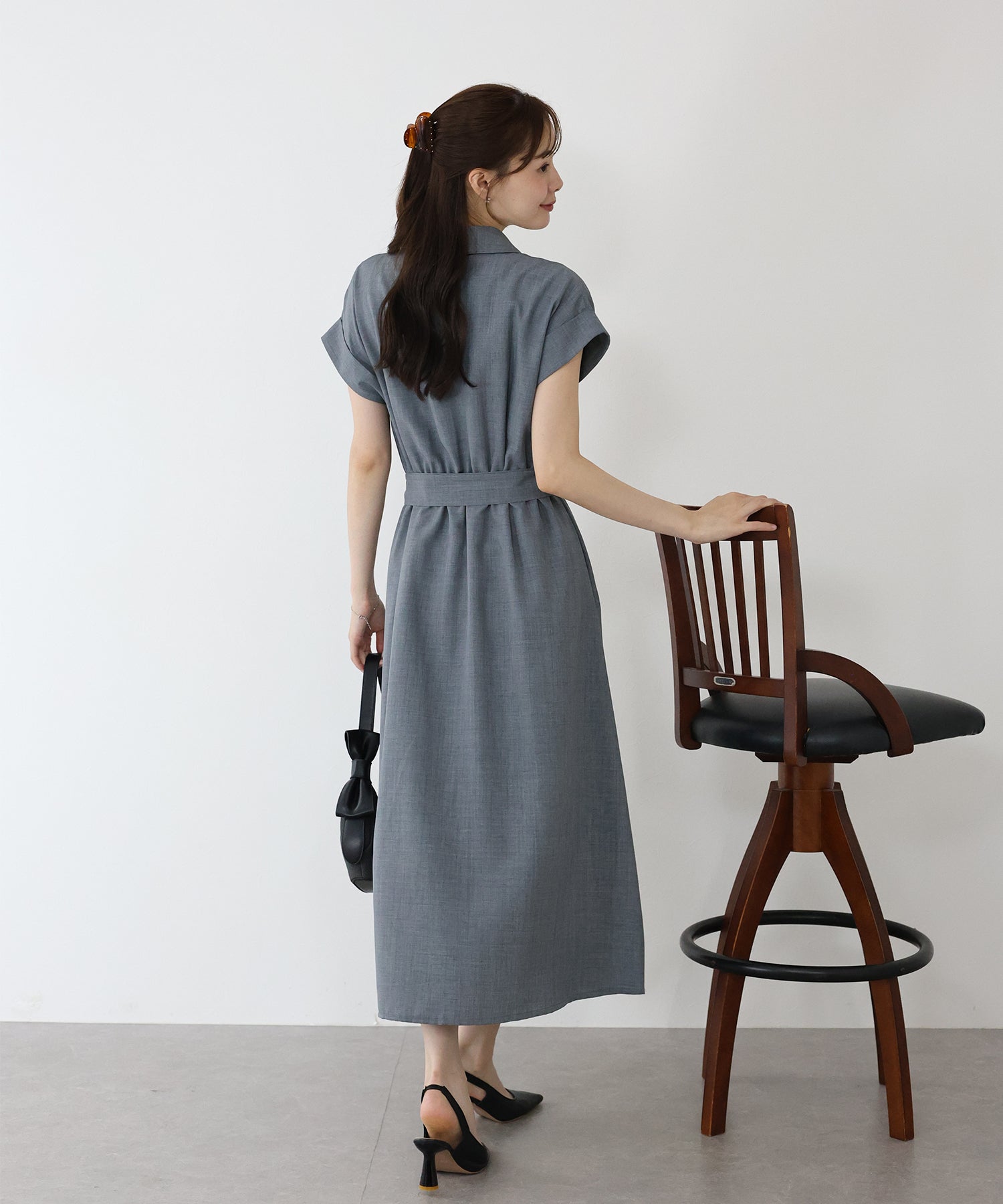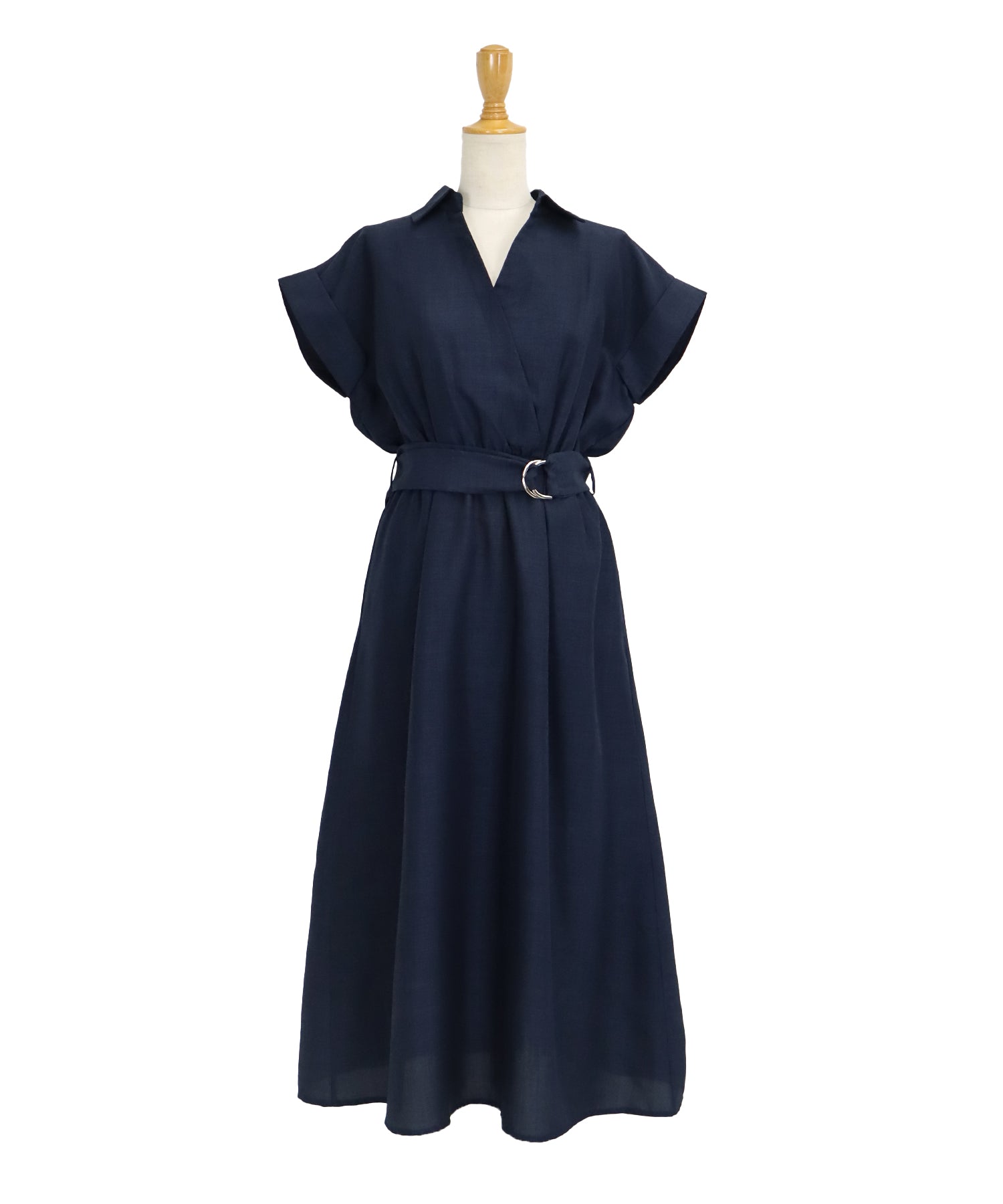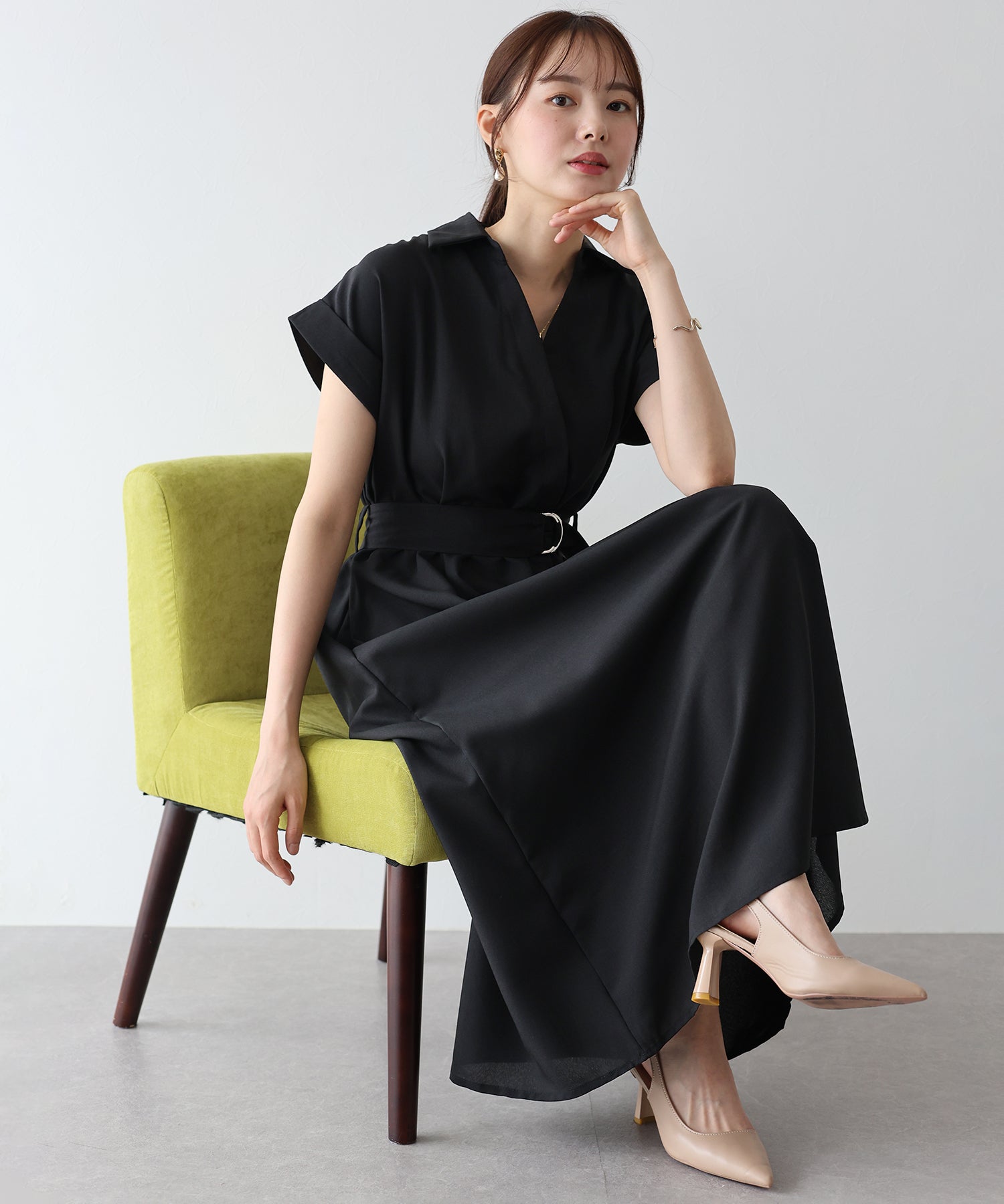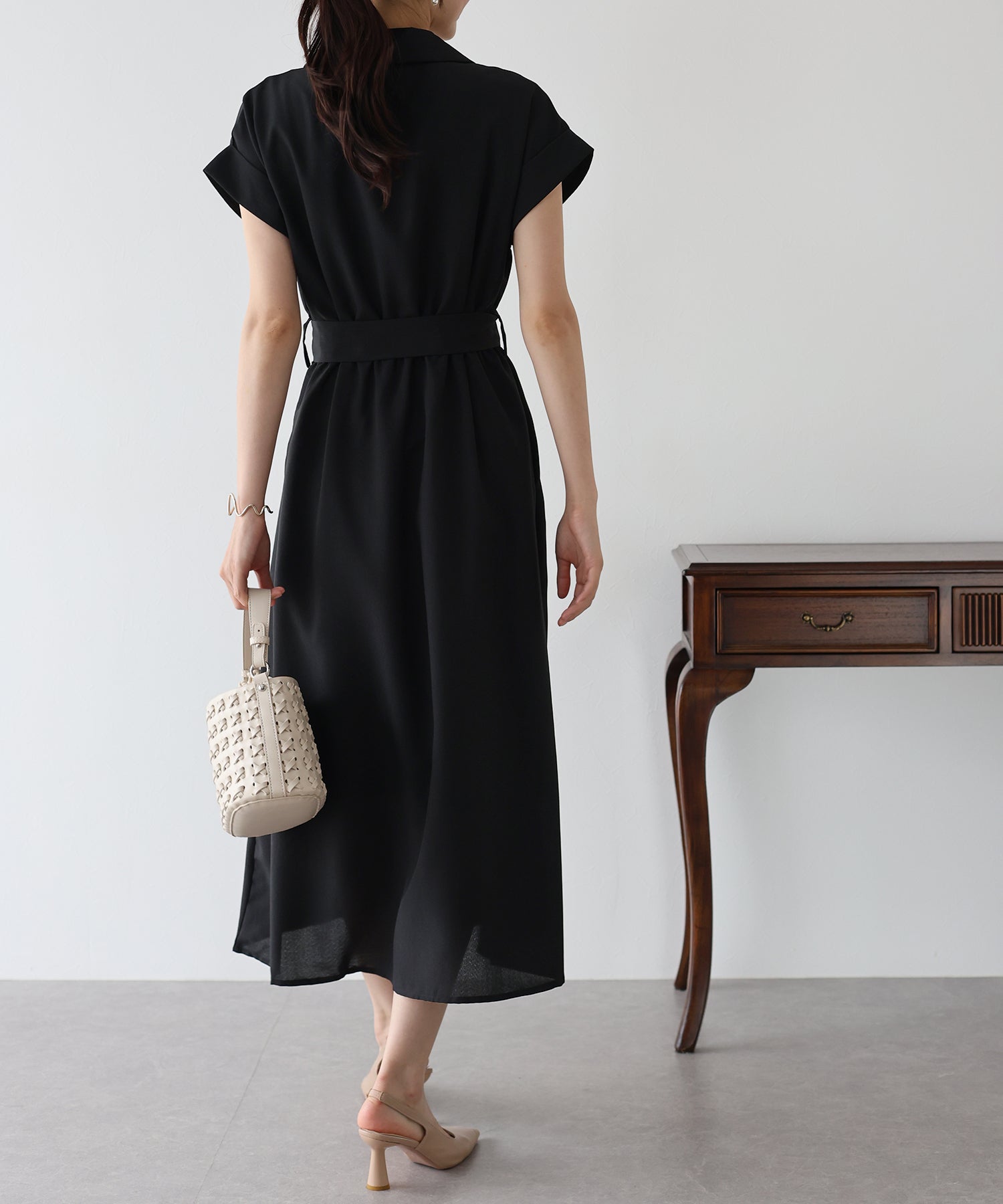 襟付きのVネックでデコルテをスッキリ見せ、魅力的に着痩せが叶う大人上品なワンピース。