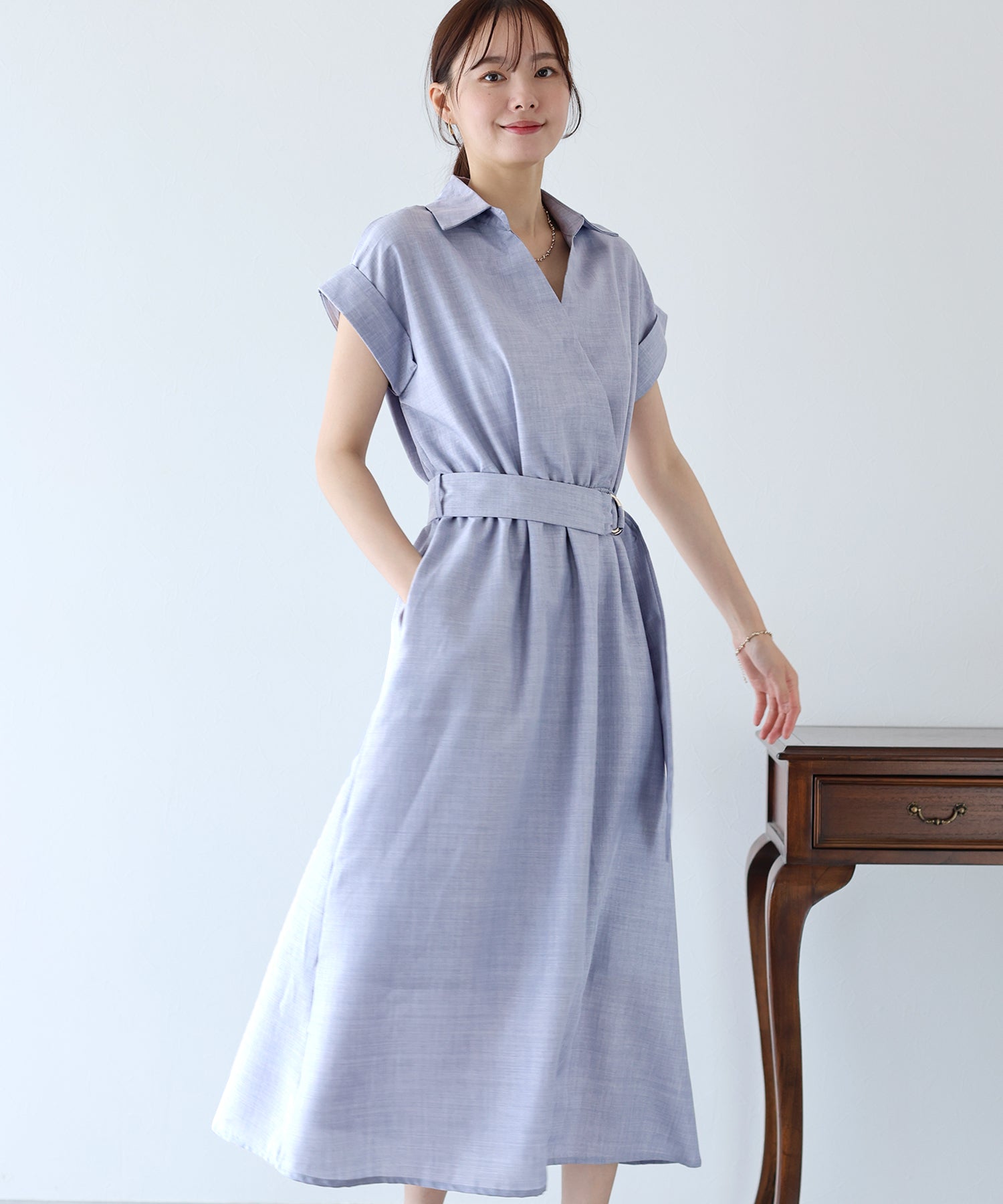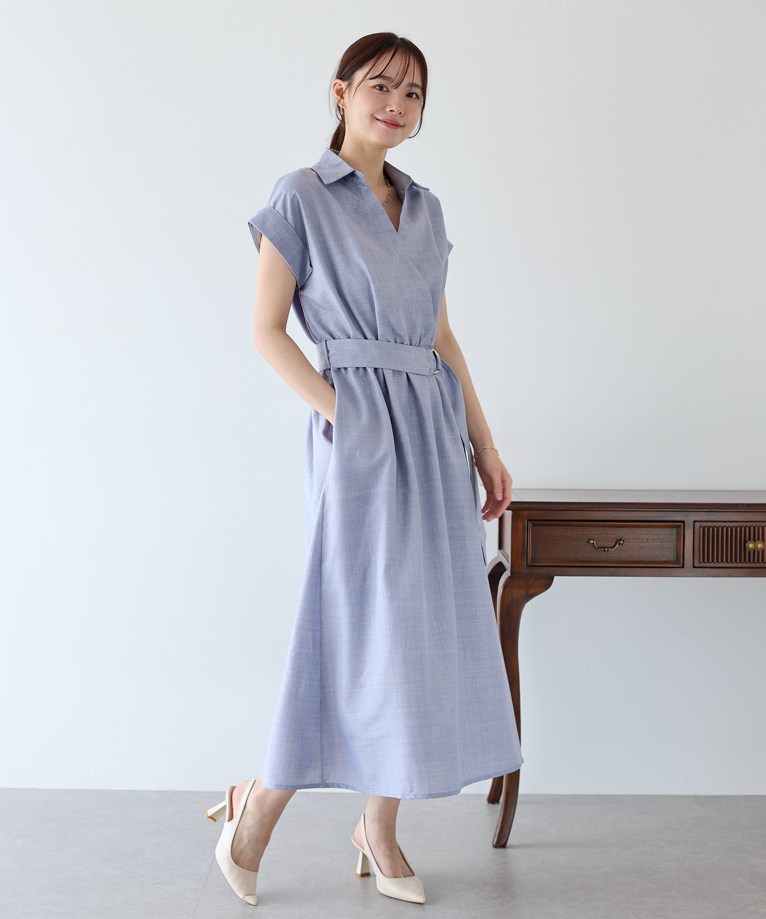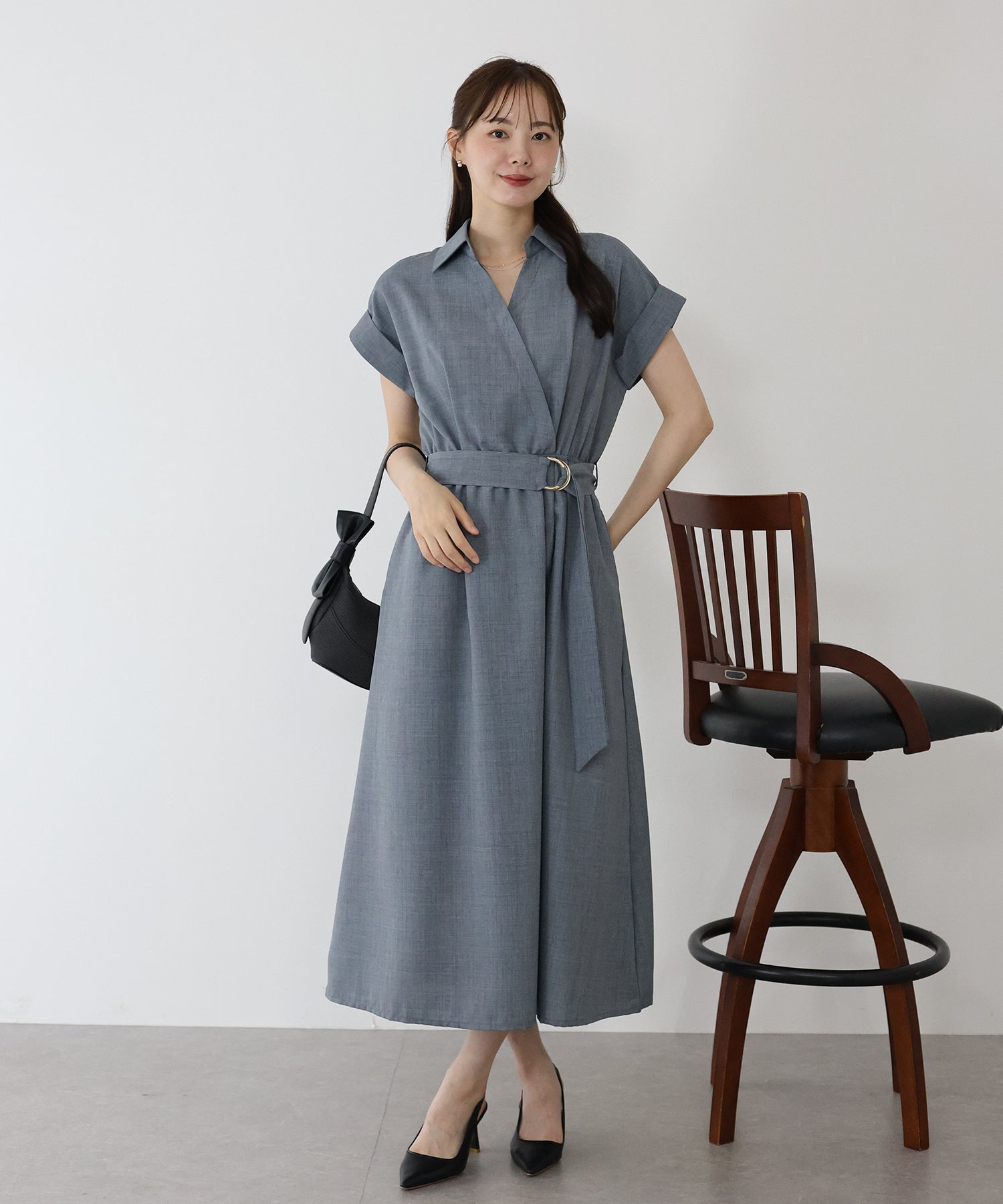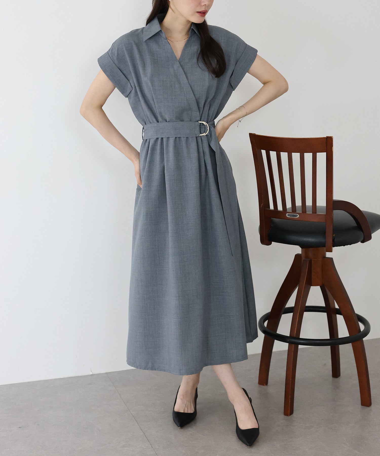 襟付きのVネックでデコルテをスッキリ見せ、魅力的に着痩せが叶う大人上品なワンピース。