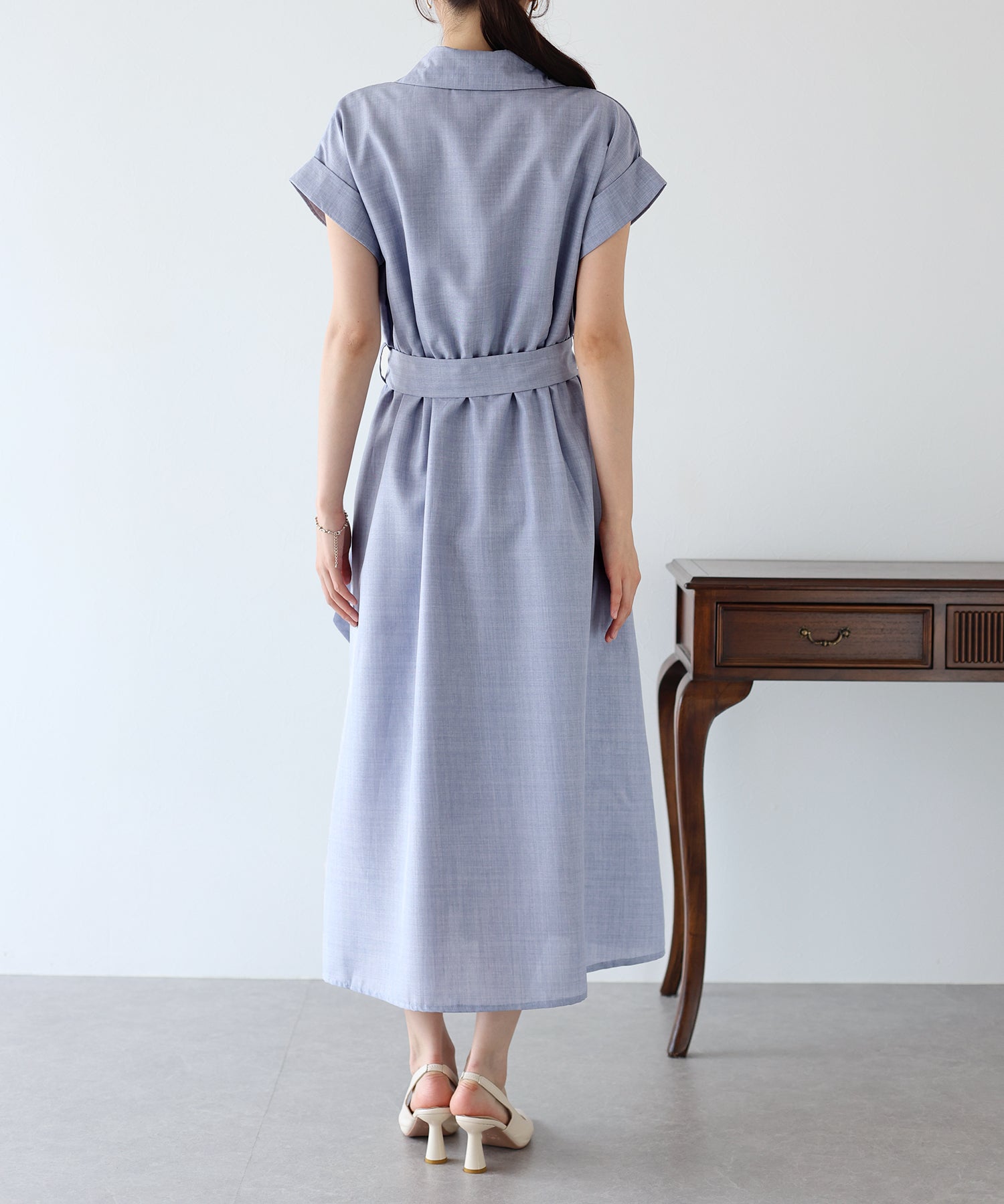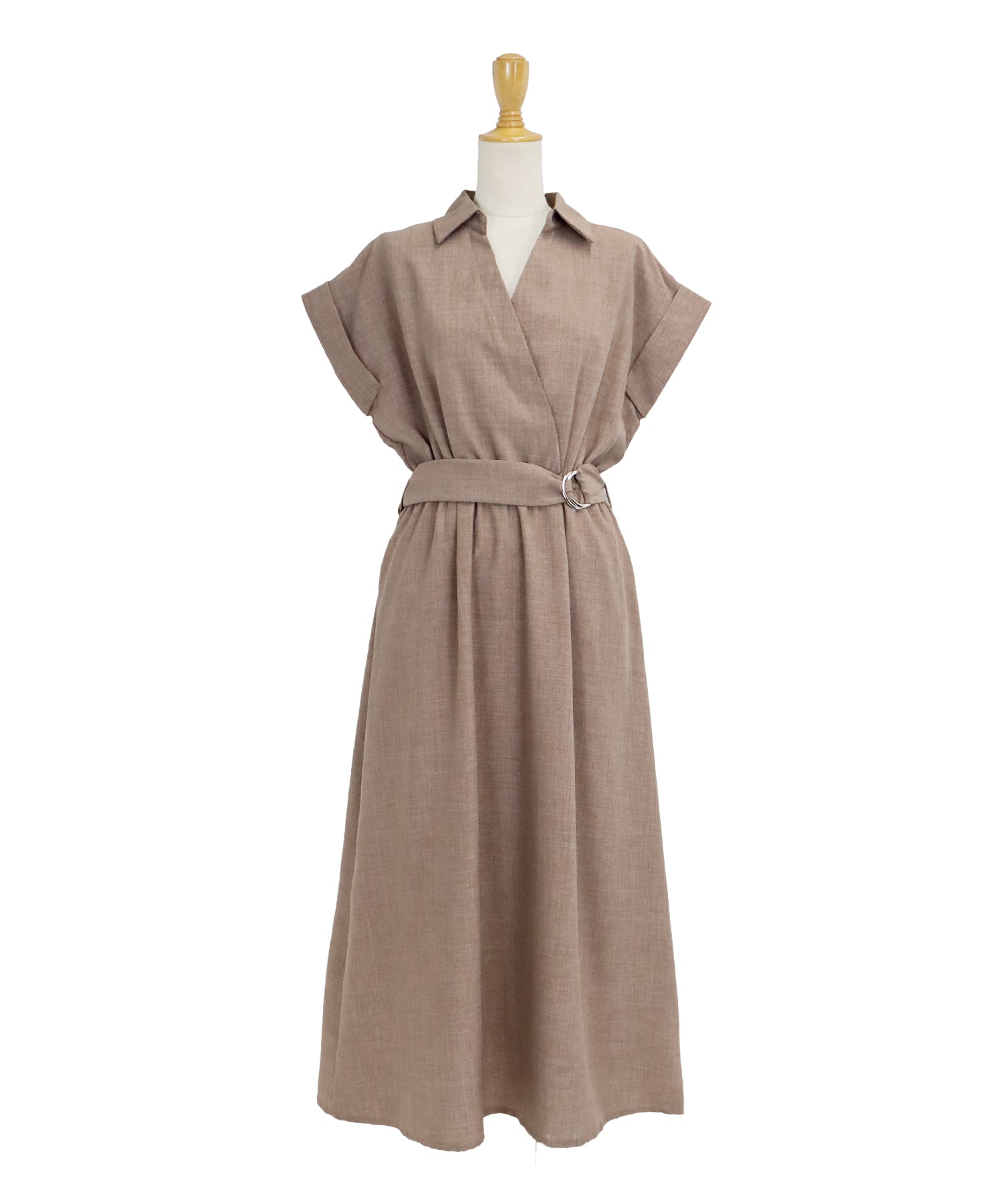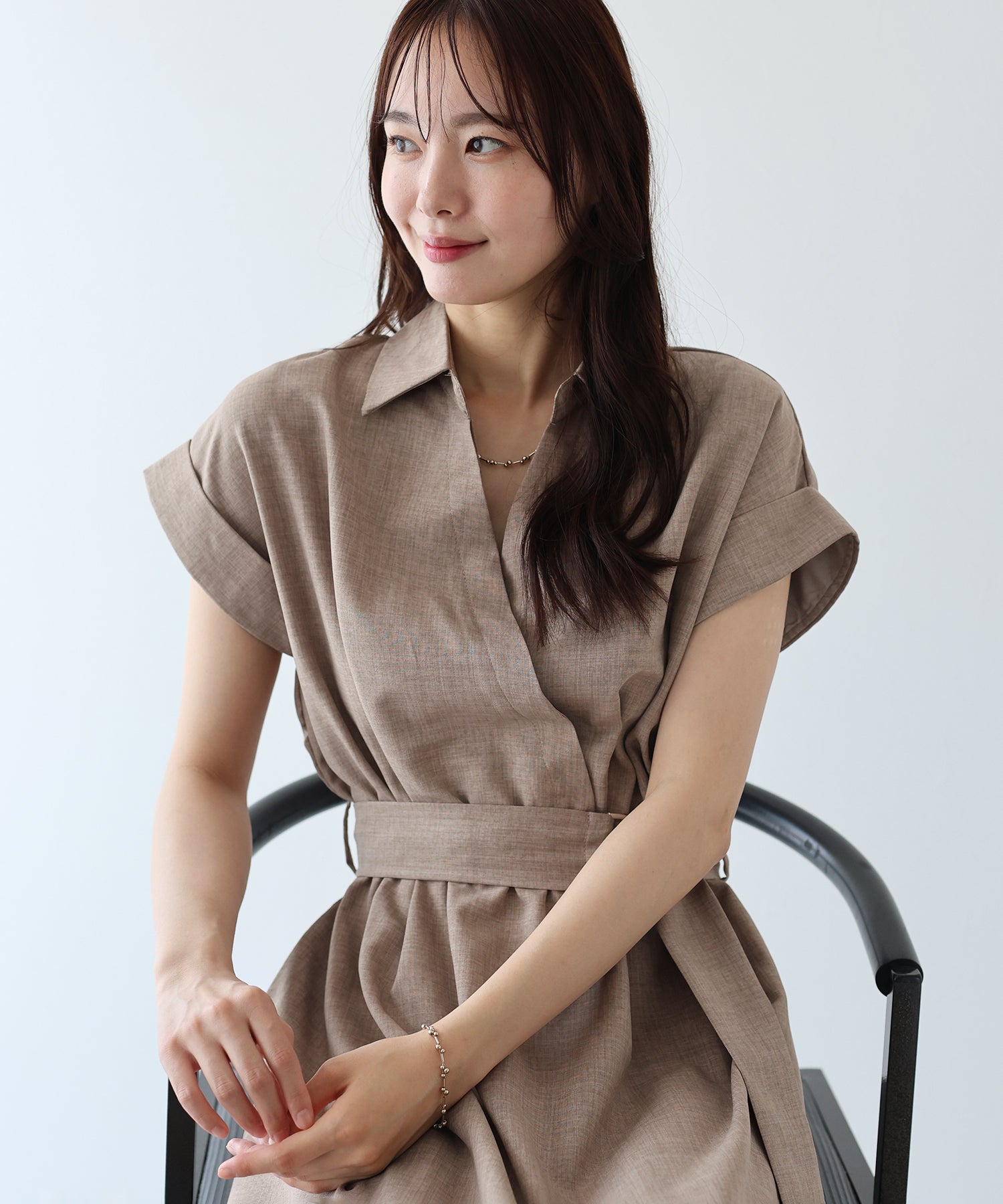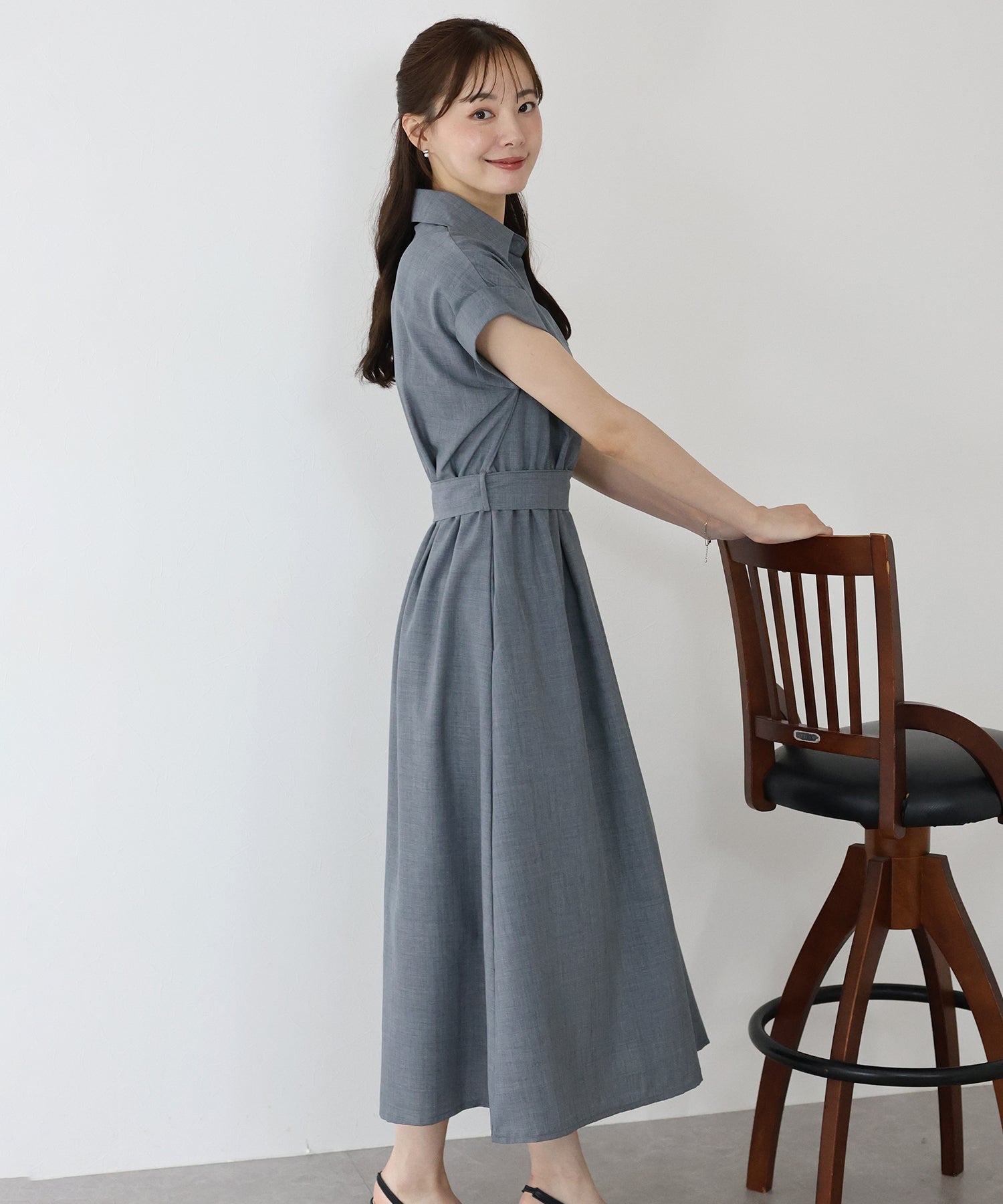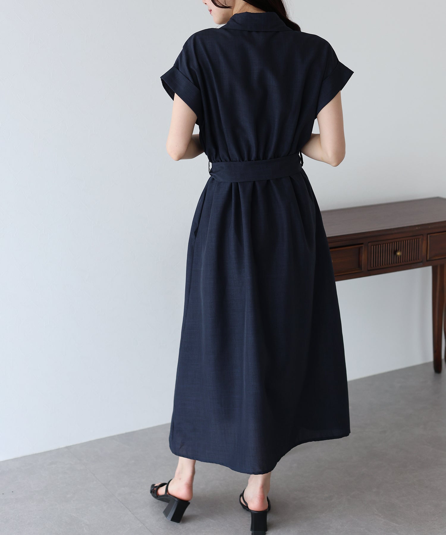 襟付きのVネックでデコルテをスッキリ見せ、魅力的に着痩せが叶う大人上品なワンピース。
