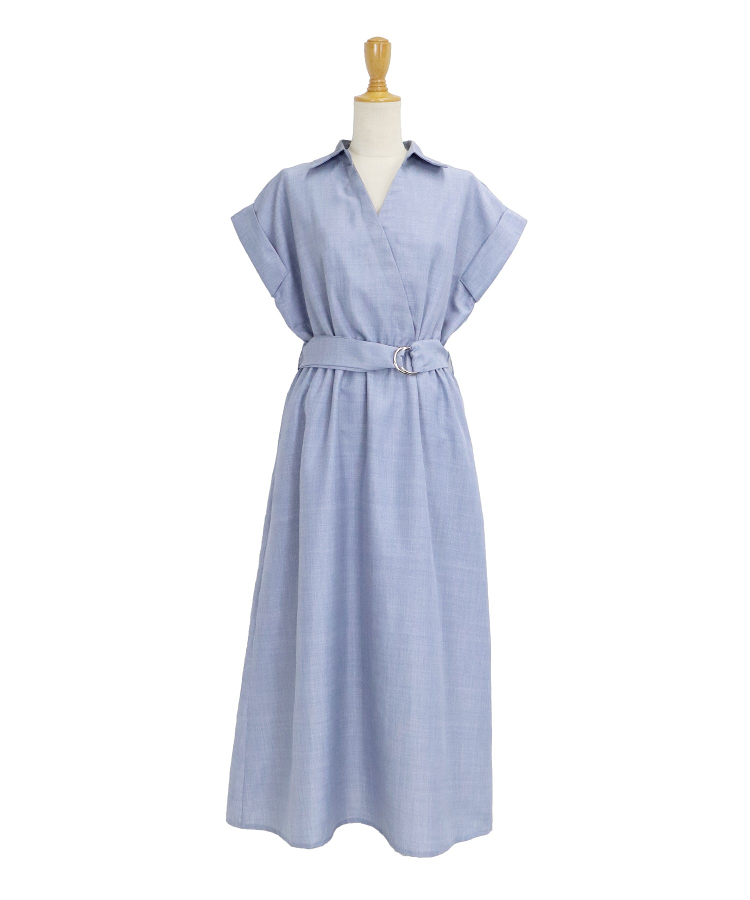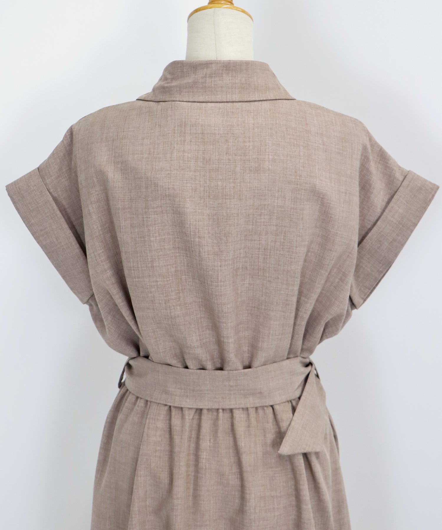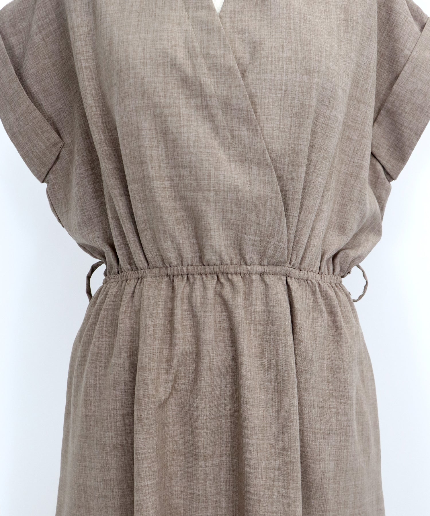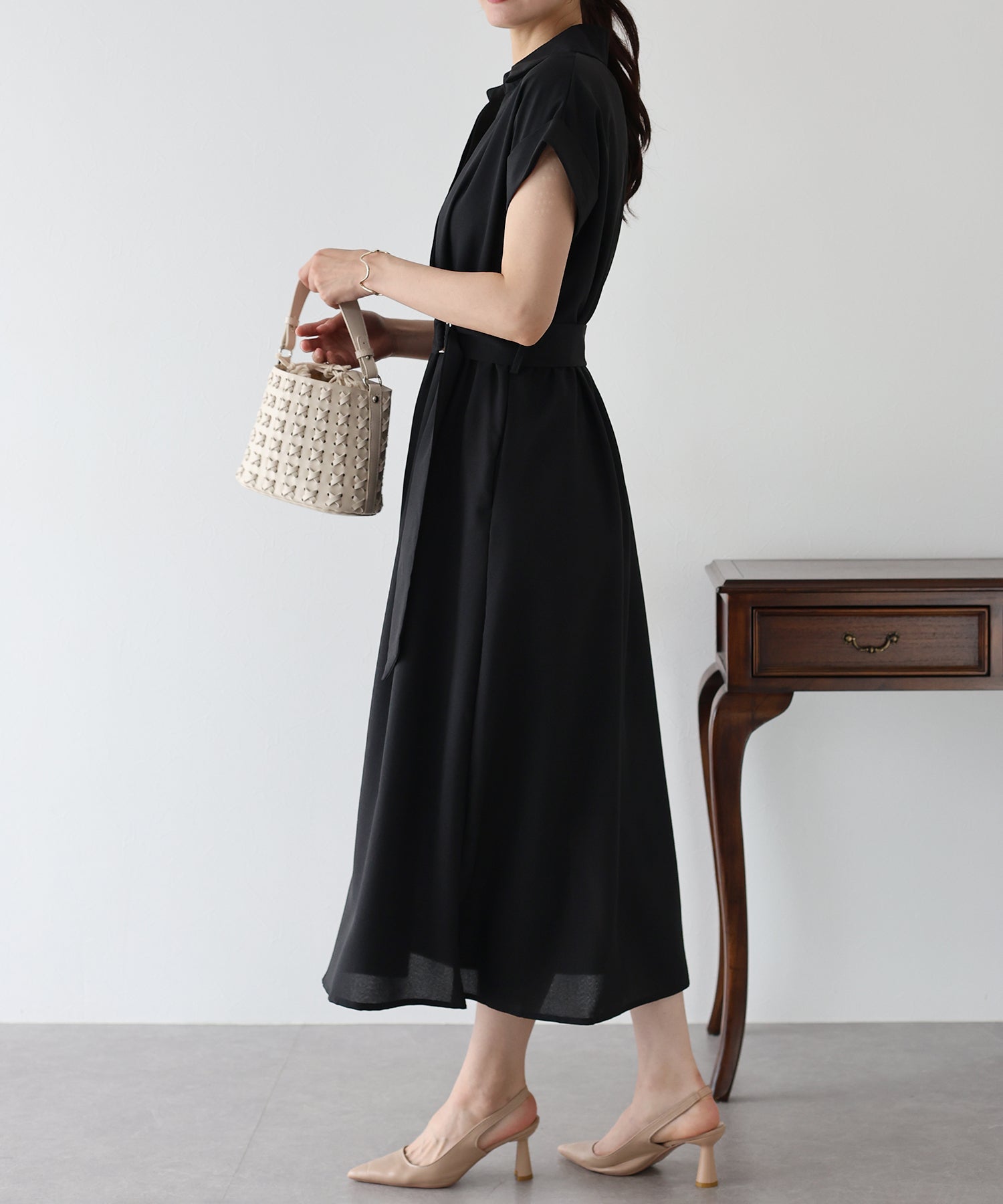 襟付きのVネックでデコルテをスッキリ見せ、魅力的に着痩せが叶う大人上品なワンピース。