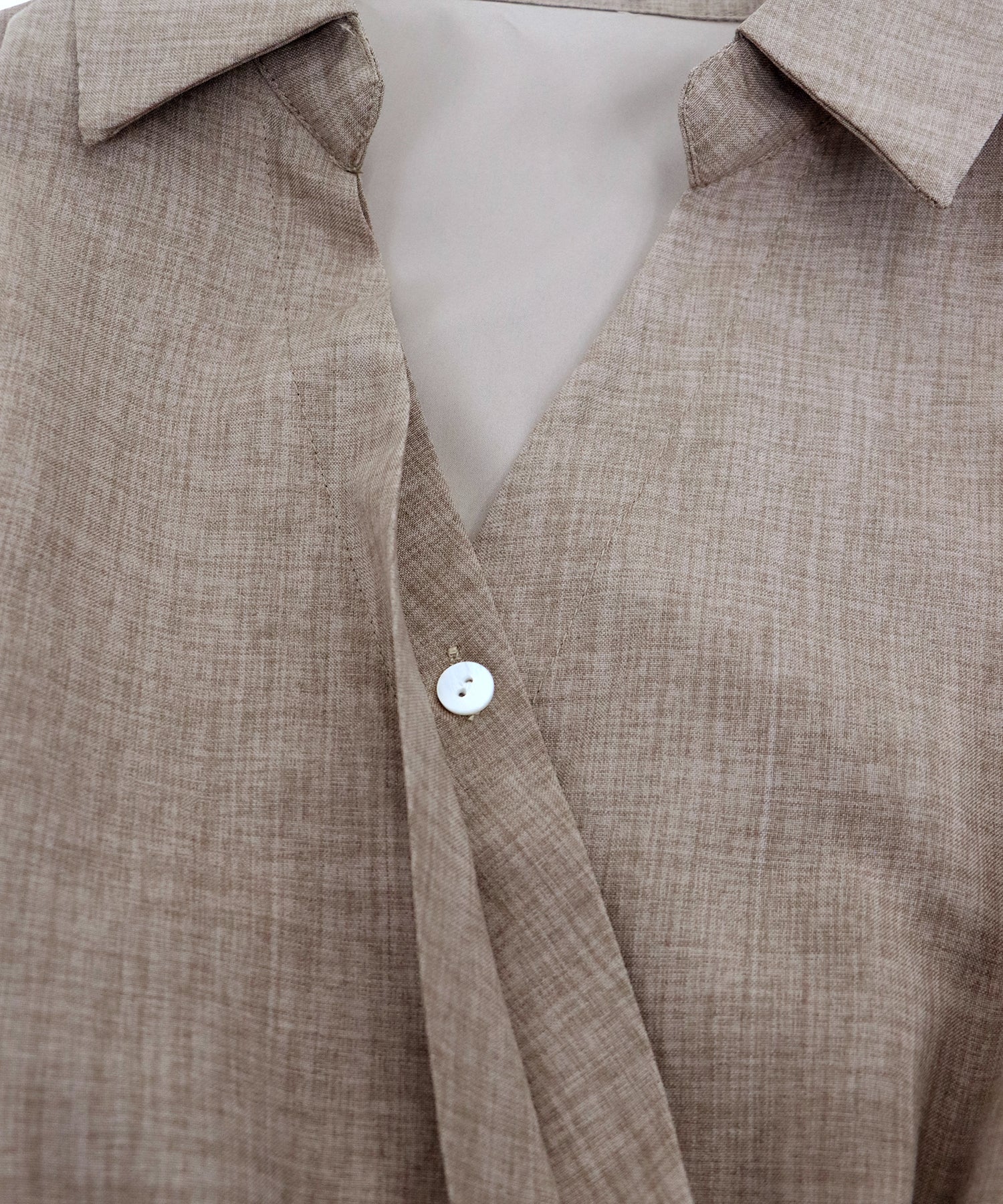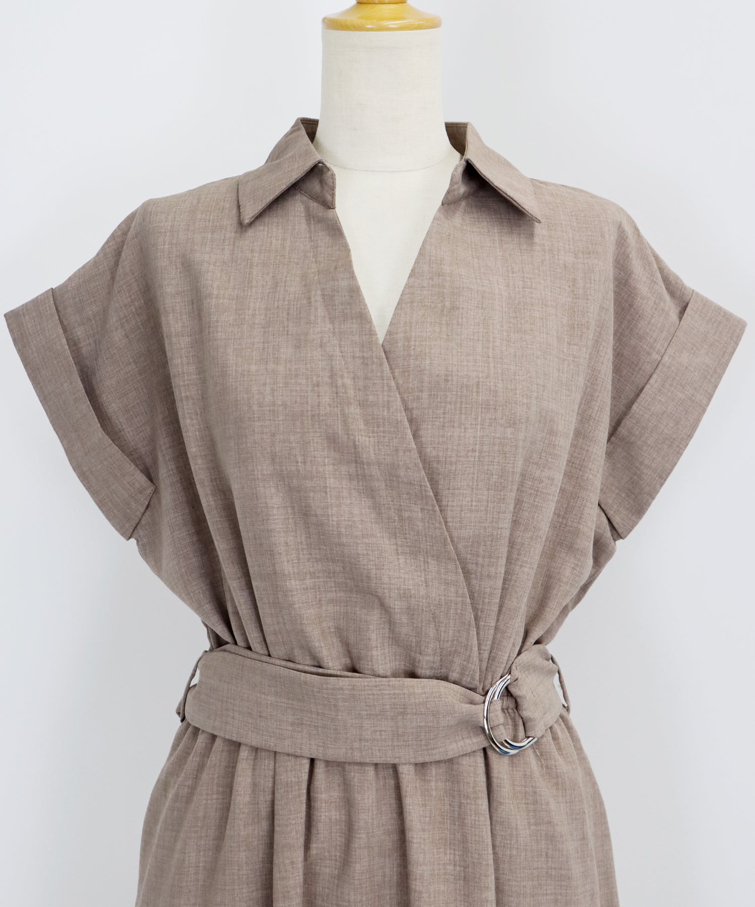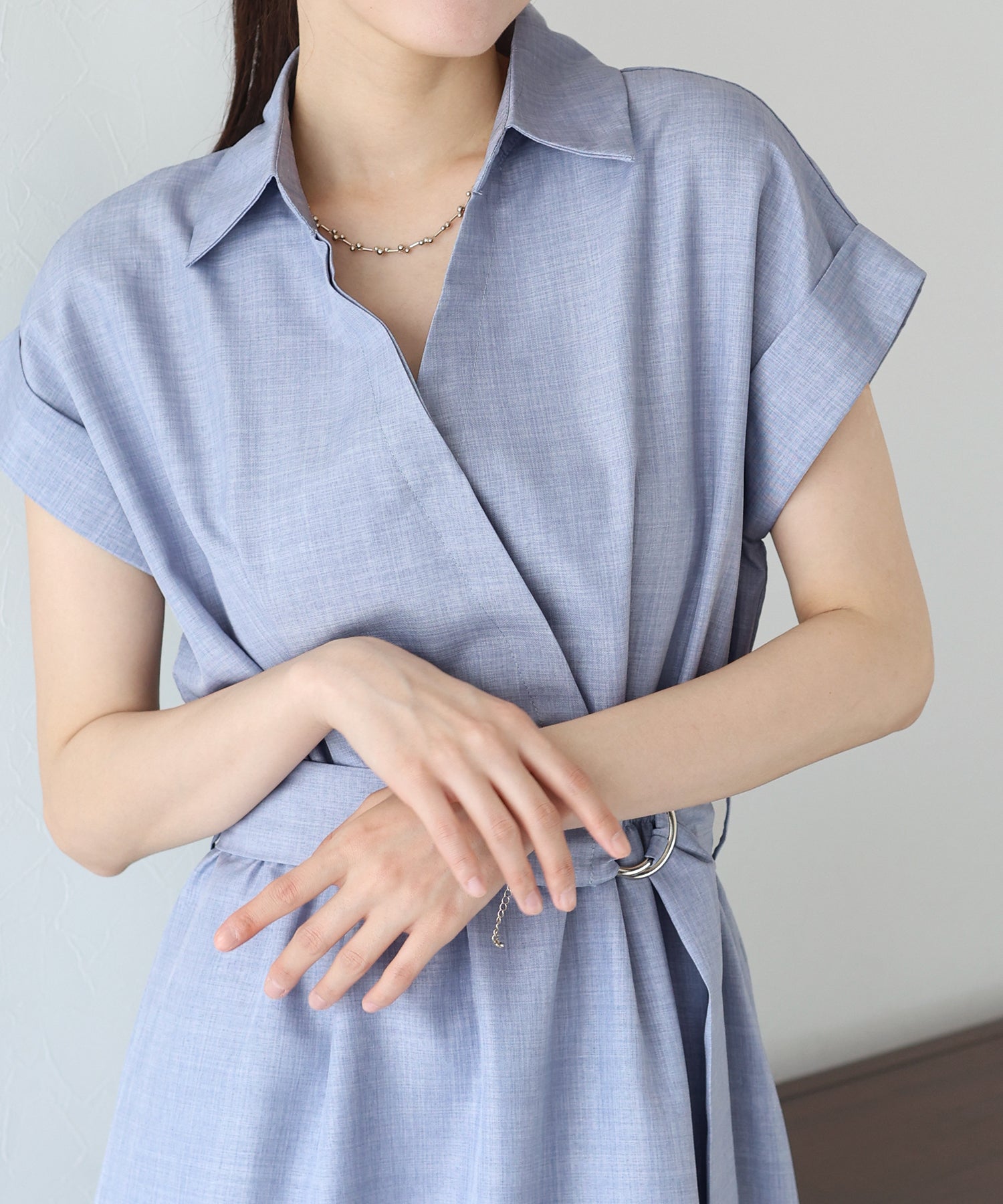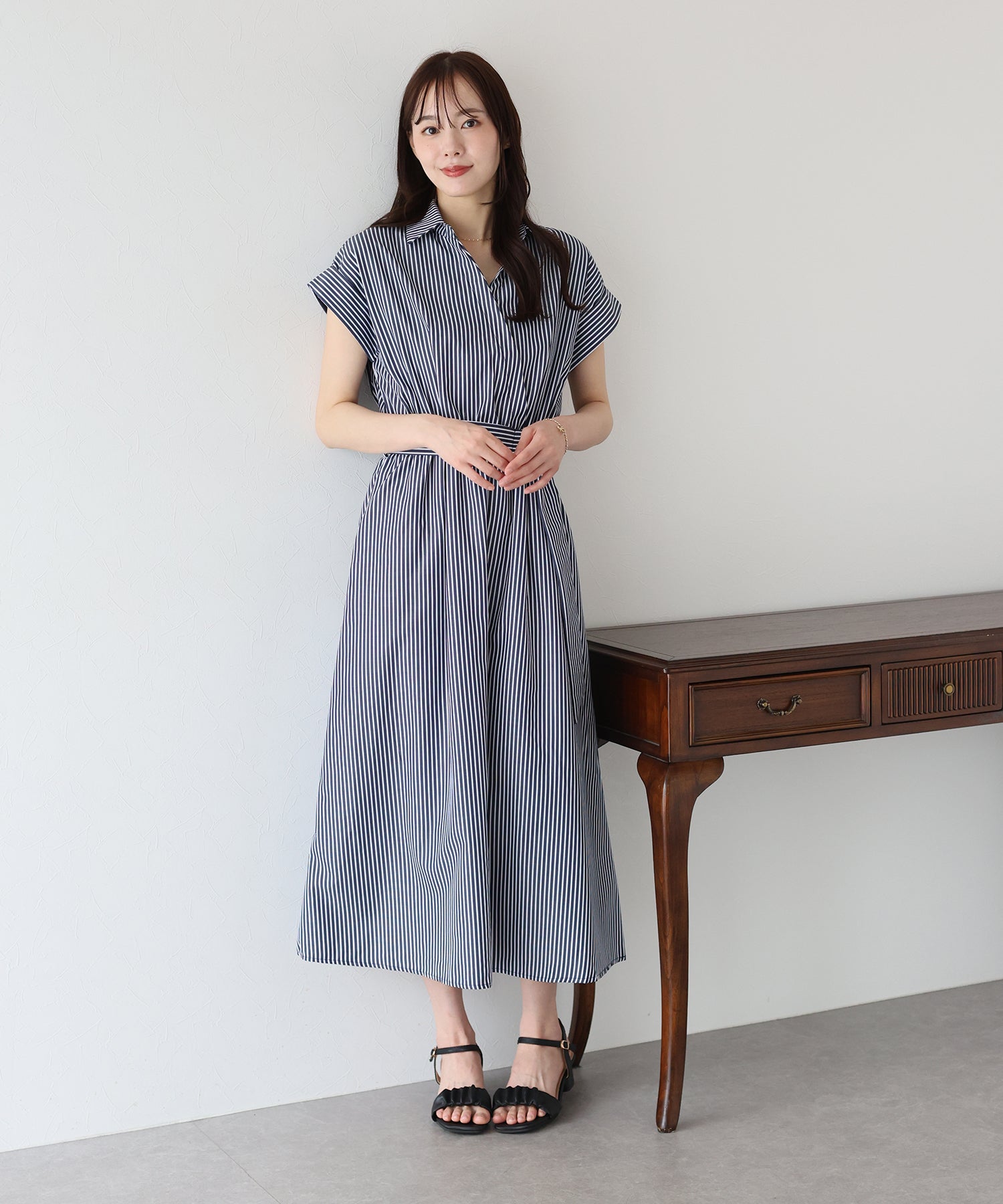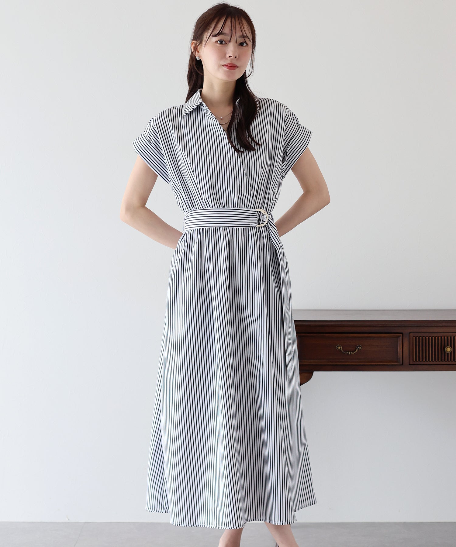 襟付きのVネックでデコルテをスッキリ見せ、魅力的に着痩せが叶う大人上品なワンピース。