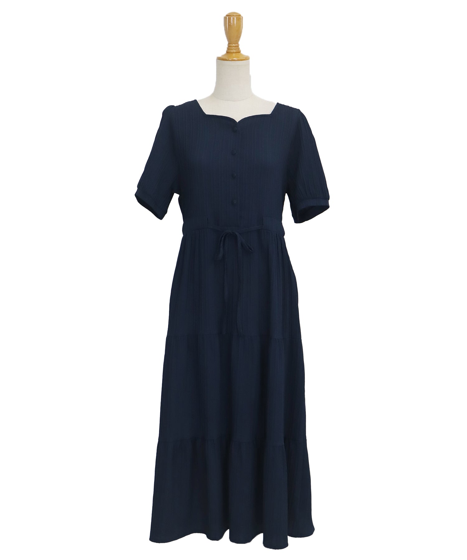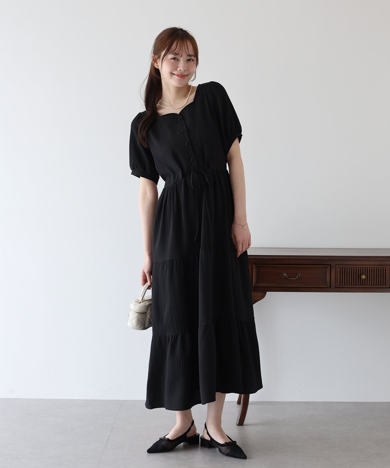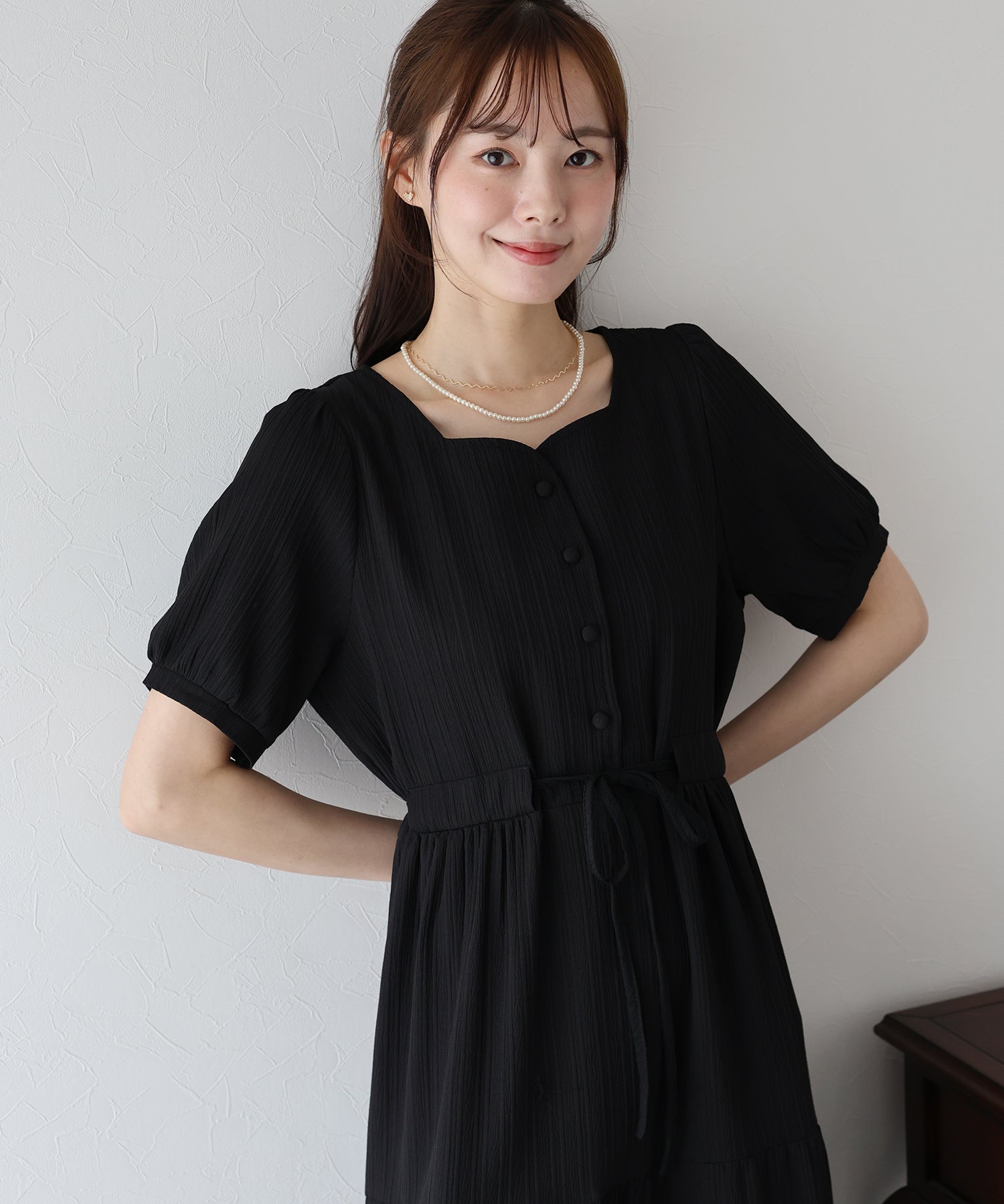 ほんのりハートを描くネックラインがポイントの半袖ワンピース。