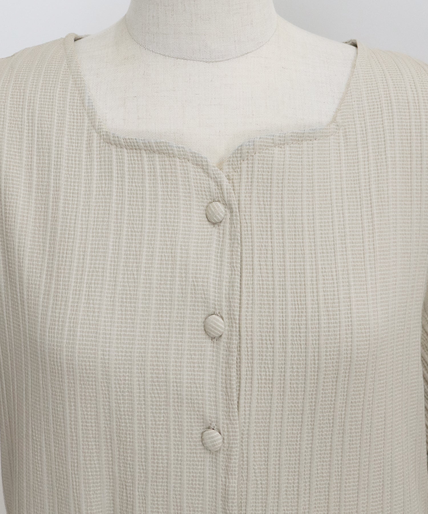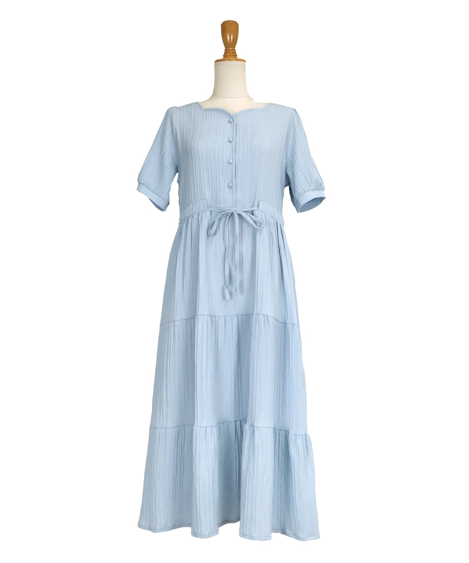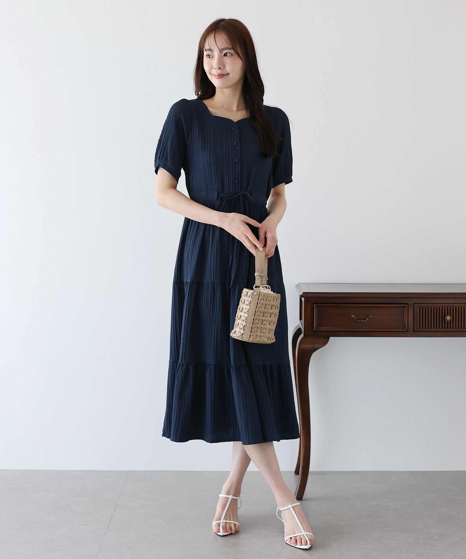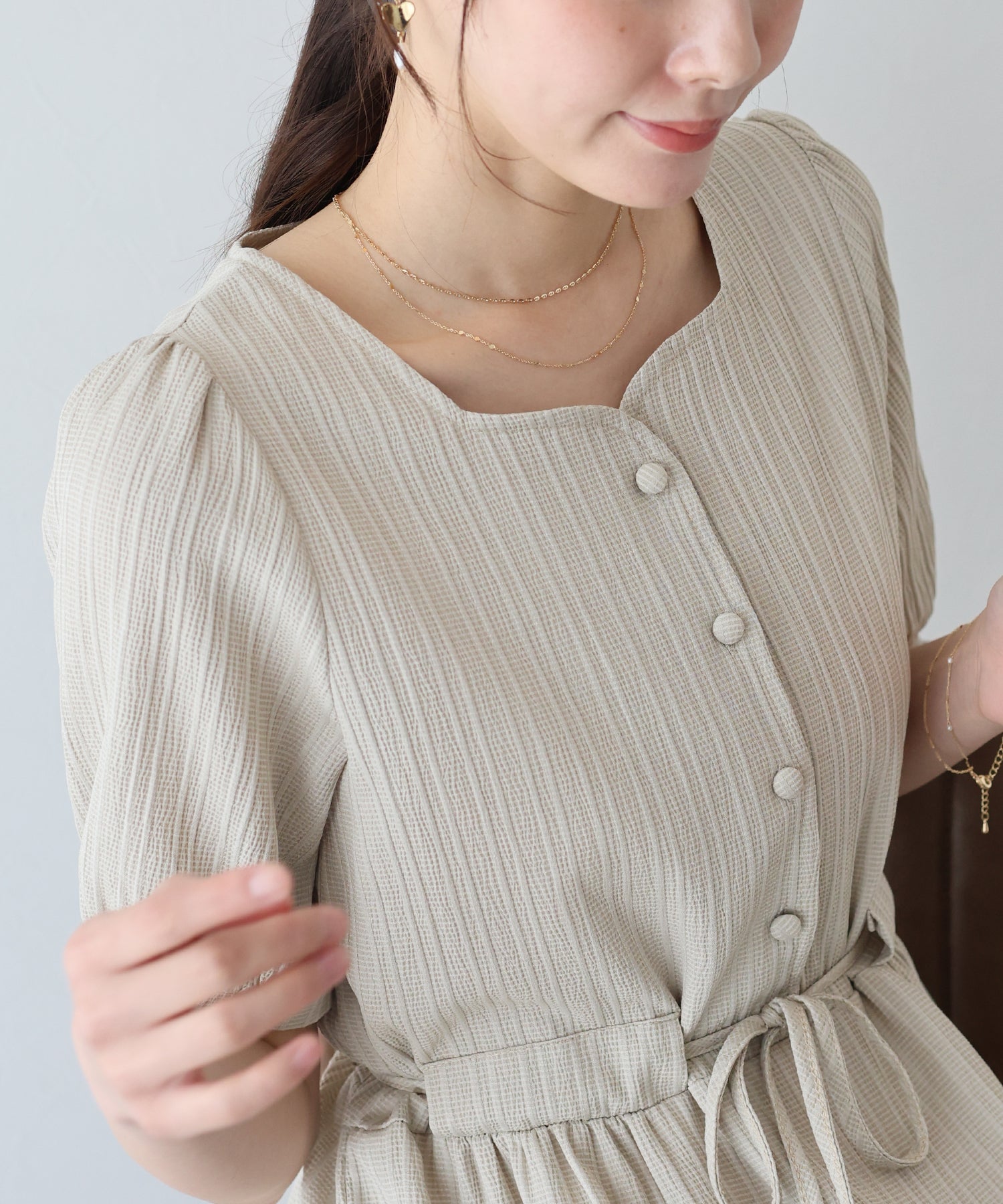 ほんのりハートを描くネックラインがポイントの半袖ワンピース。