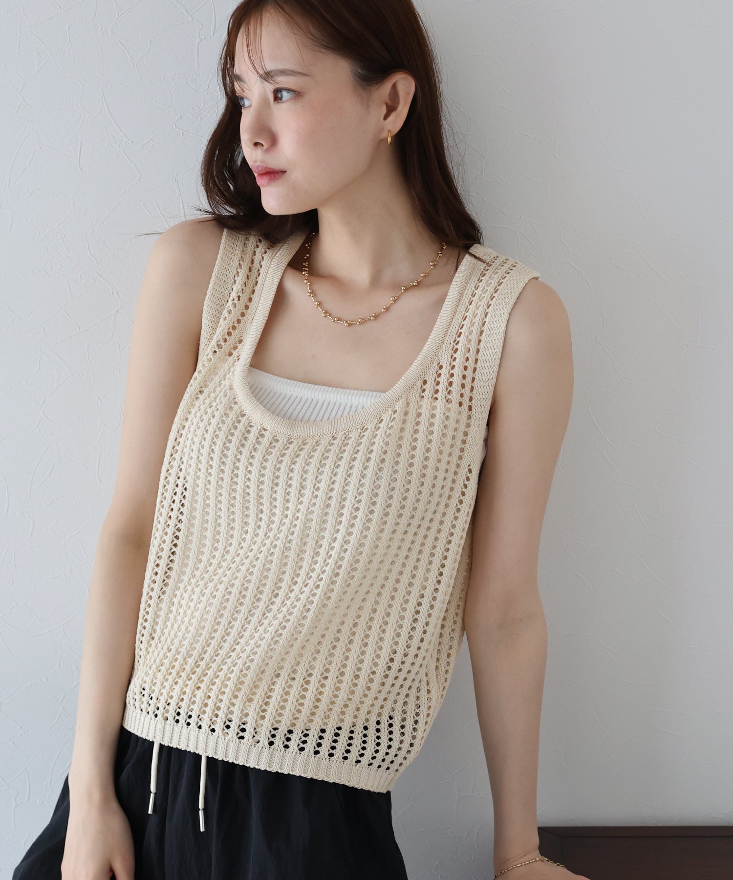 透け感が軽やかなメッシュベスト ?POINT カジュアル&フェミニンなムードを兼ね備えたメッシュベスト。 メッシュ編みで抜け感を出しながらも、リボンデザインで女性らしいきちんと感を演出。 緩やかなシルエットで、インナー次第で様々な着こなしを楽しめるのも魅力。 シンプルながらもこなれ感のあるデザインで、デイリーに活躍します。