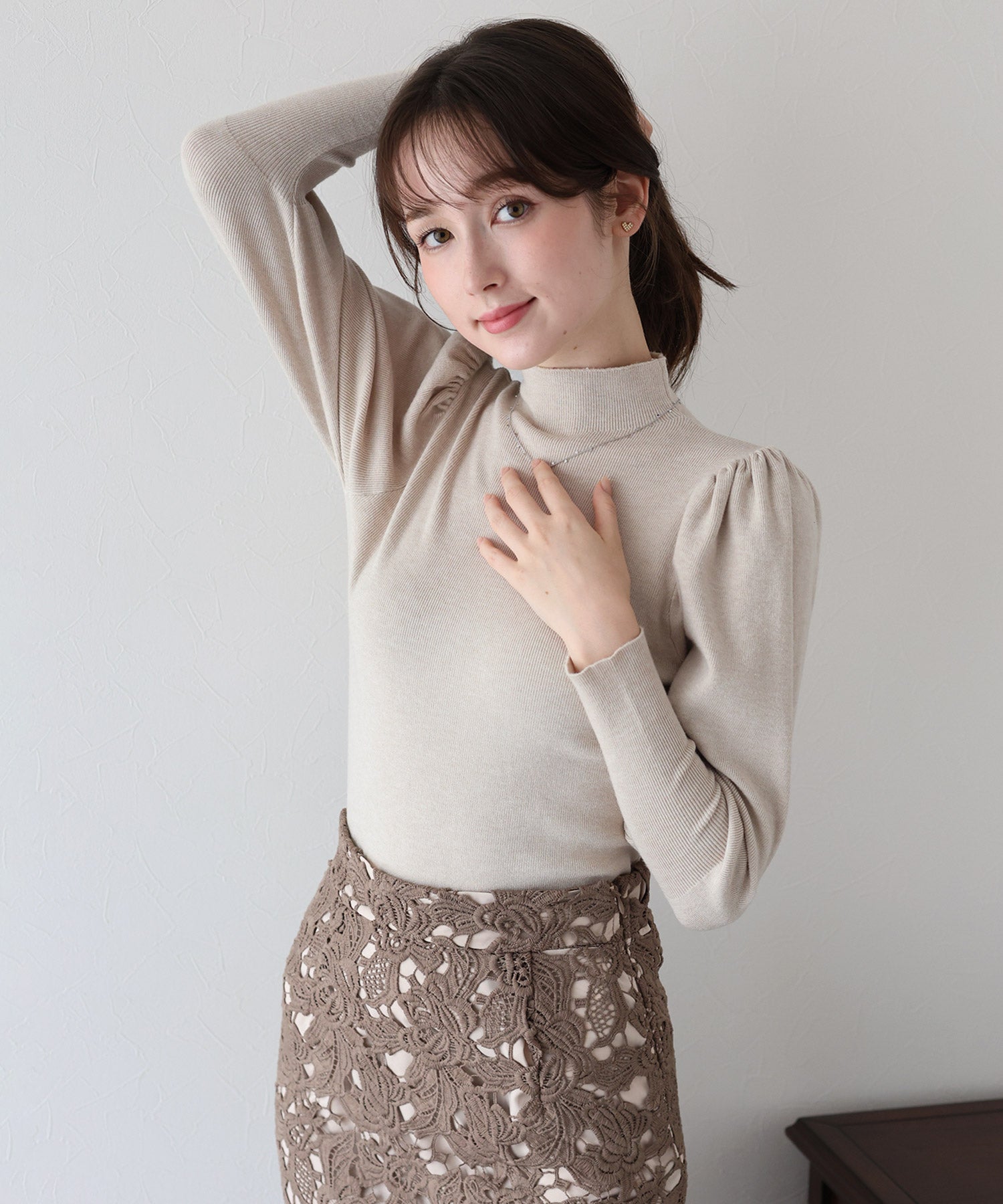 上品で女性らしく着こなせるボリュームスリーブニット