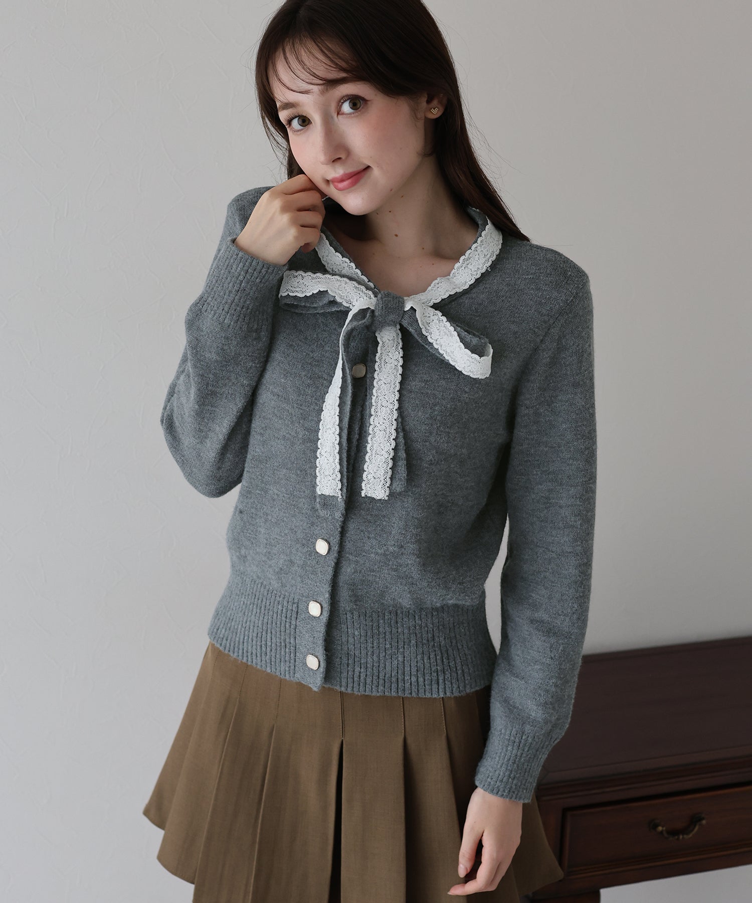 ネックラインのレースとリボンがポイントのニットカーディガン。