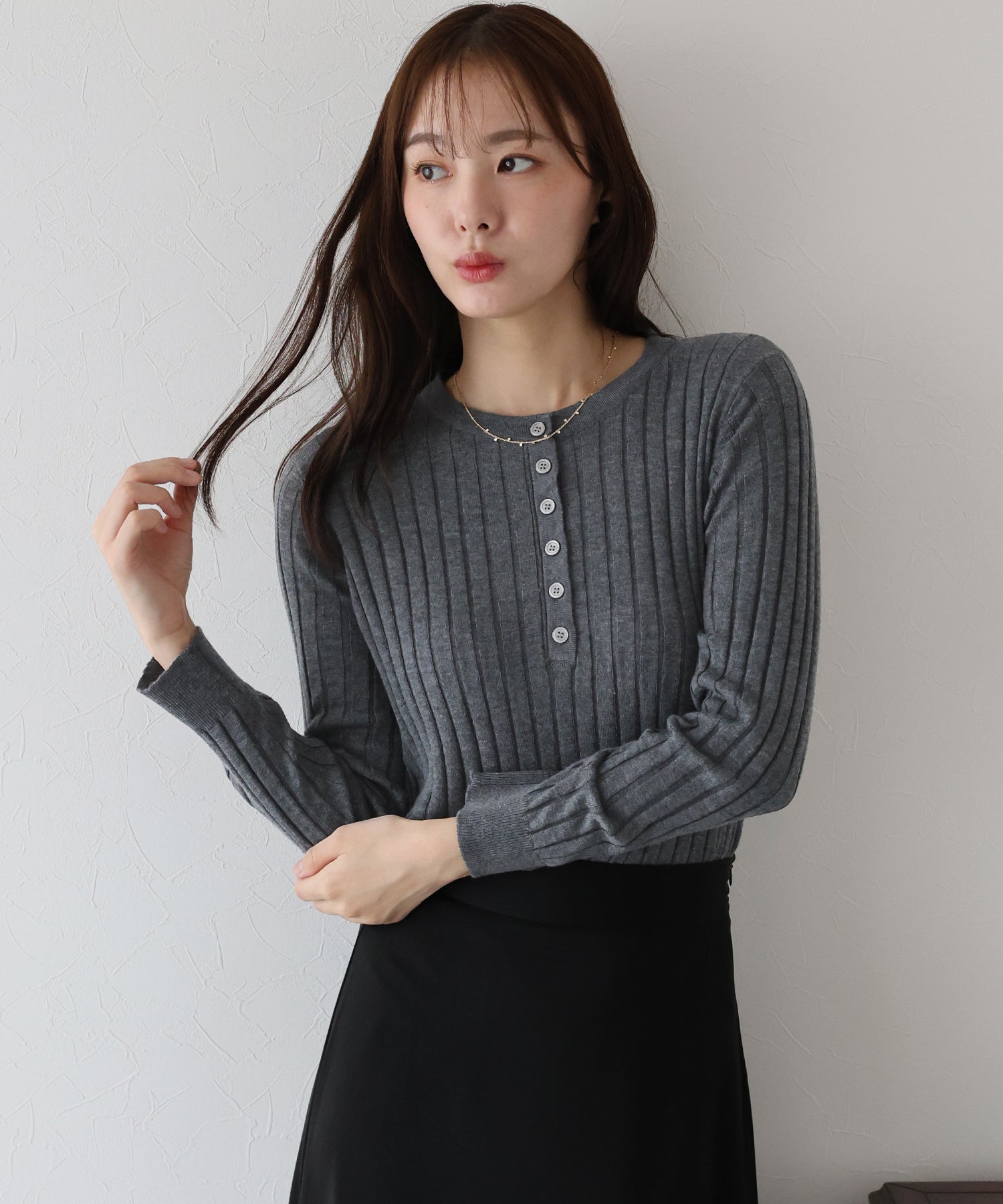 フィット感がミニマルな印象のヘンリーネックリブニット