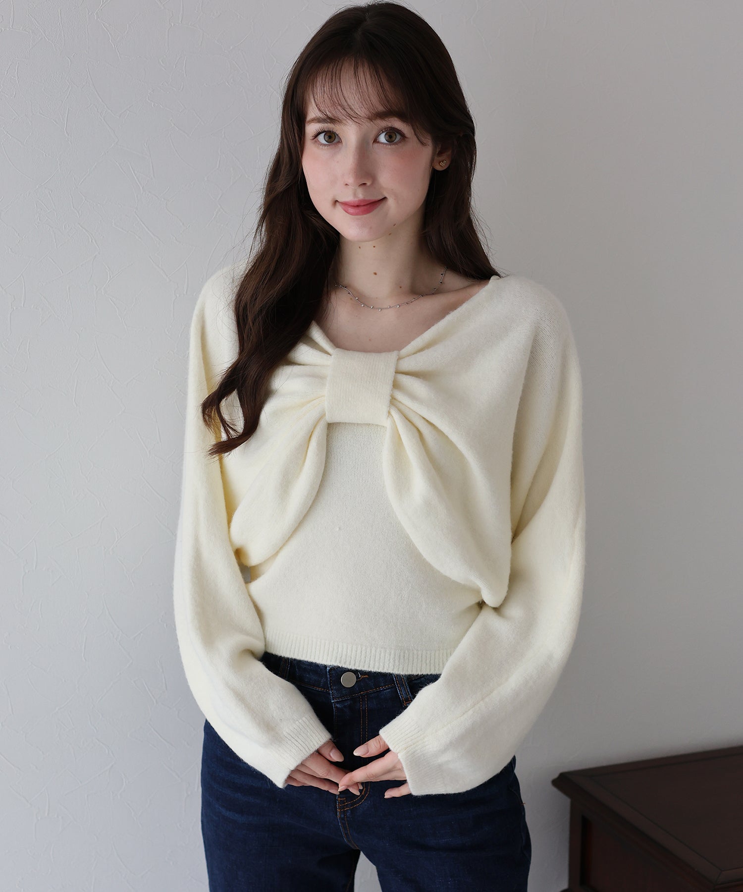?POINT キュートなリボンディテールを大胆にあしらったオフショルトップス。 ニットキャミソールとリボンボレロのセットアイテムで、ボレロは前後2wayで着用でき、 単品使いも可能なので、マルチウェイな着こなしをお楽しみいただけます。 ドルマン仕様のボレロはオフショル可能な大きめのネックで、顔周りをすっきりと見せてくれます。 ガーリーなポイントがたっぷり詰まったおすすめの一枚です。