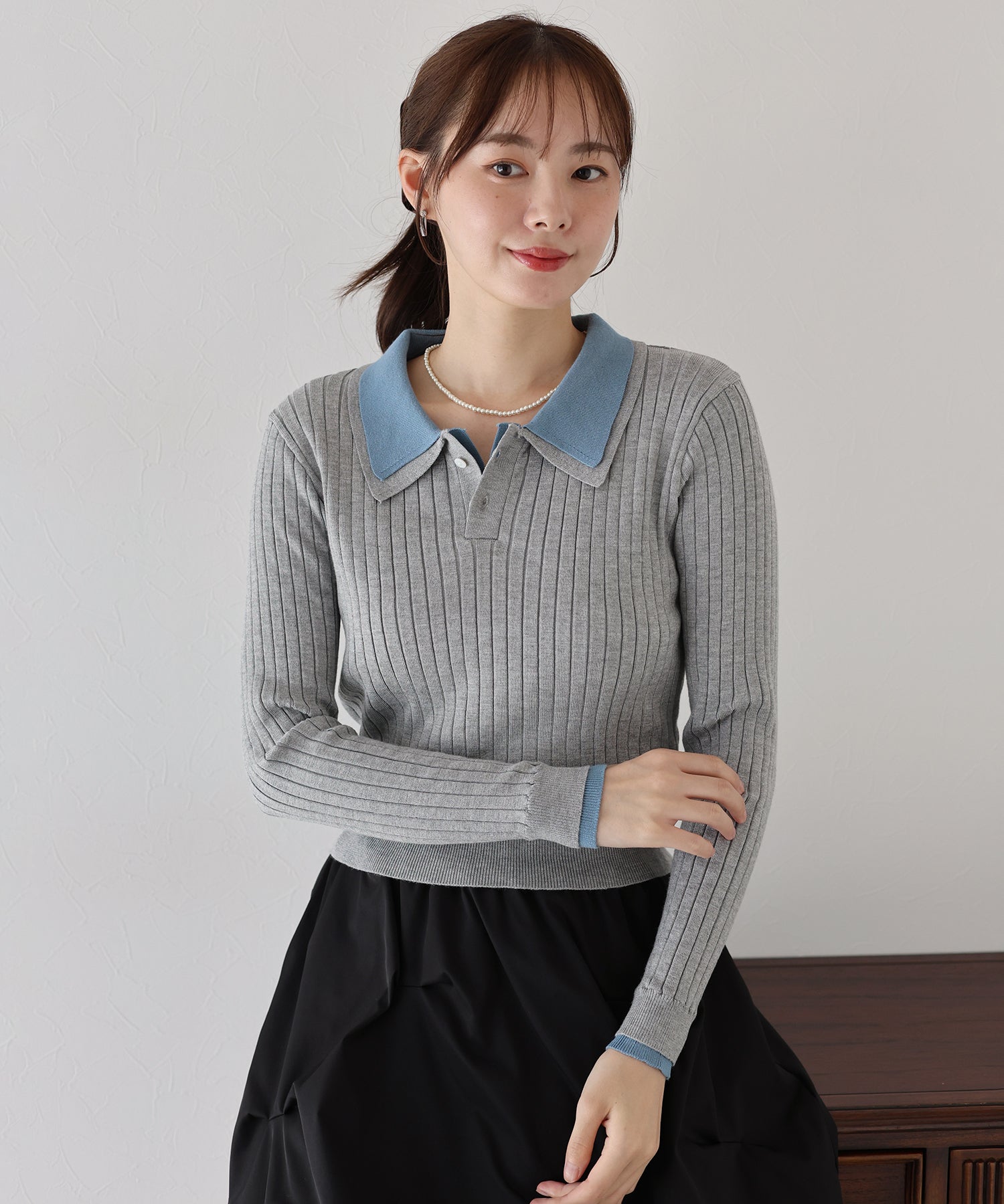 ダブル襟と袖口にあしらった配色ドッキングデザインが旬の、シンプルながらもおしゃれなポロニット。
