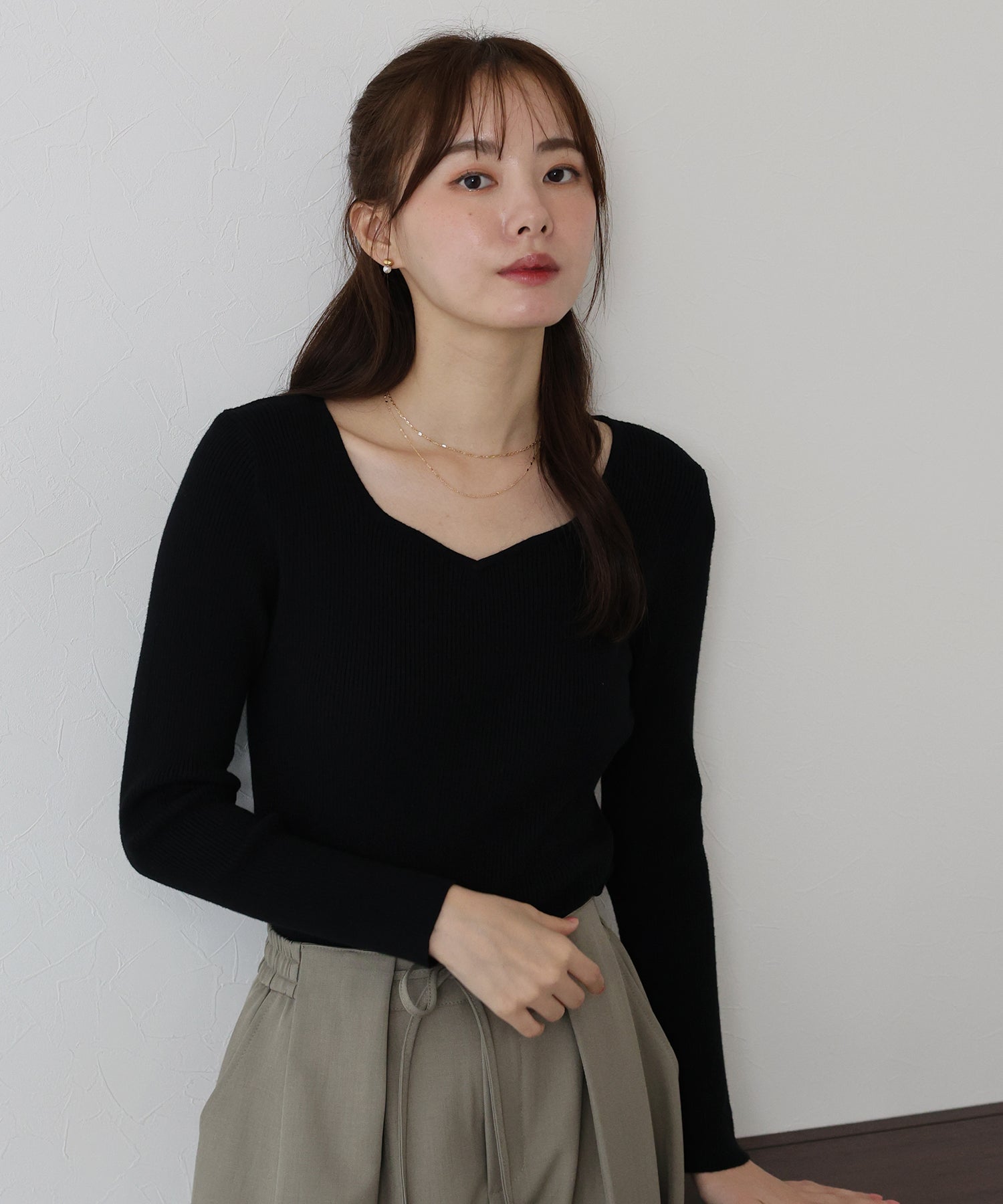 デコルテを美しく見せてくれるハートネックリブニット。